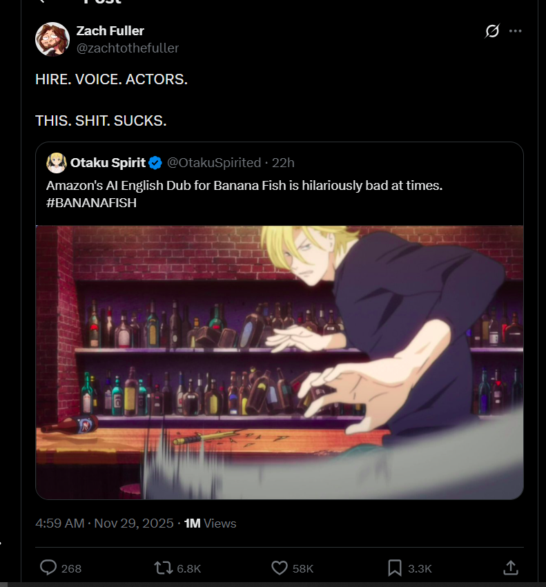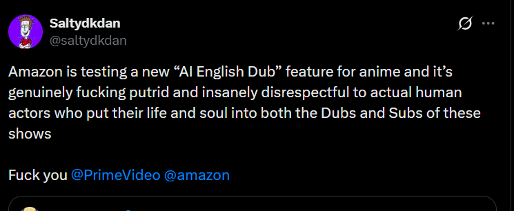 Don't give a shit about dubs but using AI for anything is a detriment to society so any company that does shit like this needs to suffer some kind of tangible backlash.