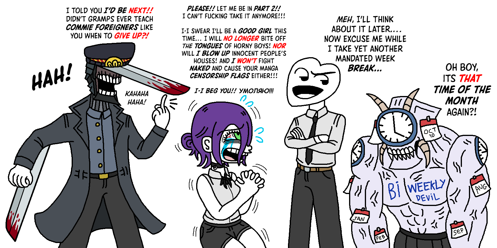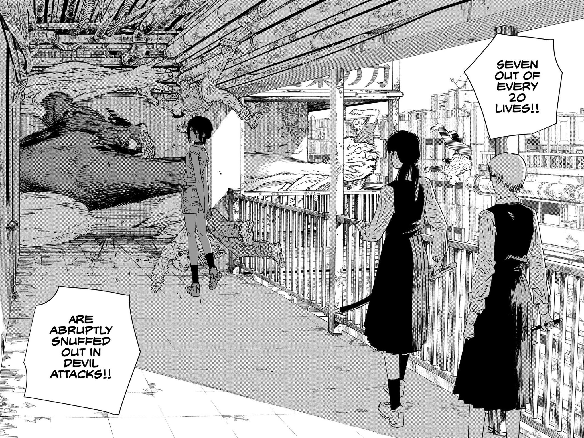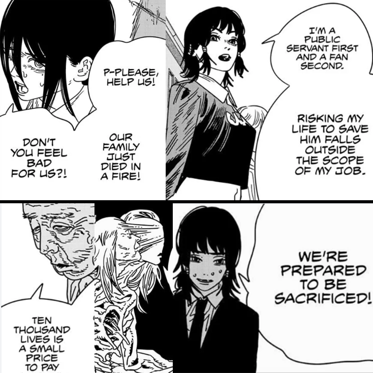 Fumiko's STD devil contract was quite possibly the only truly fun devil reveal in part 2. Random, crazy, and surreptitiously horrifying. Fujimoto should have leaned into it by making more and more Fumiko Mifunes appear in the background, until suddenly the 'protagonists' turn around and realize that they're completely surrounded and have no escape. Instead he did fuck all with it.
