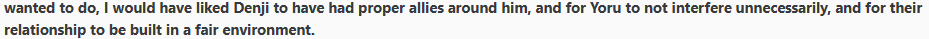 Fujimoto fucked up the rest of the Part 2 cast, so we're stuck with Denji and his dynamic with Asa/Yoru.