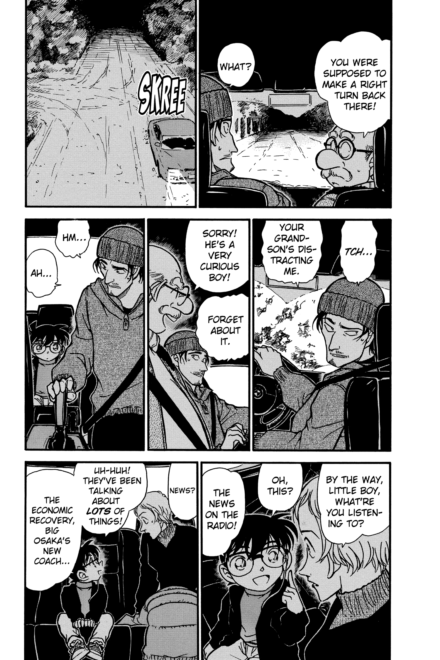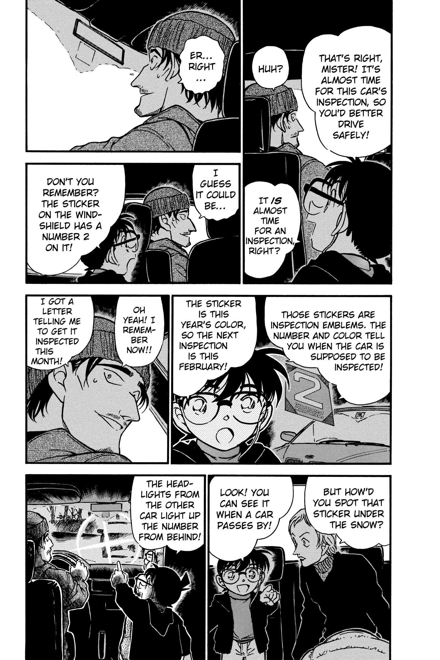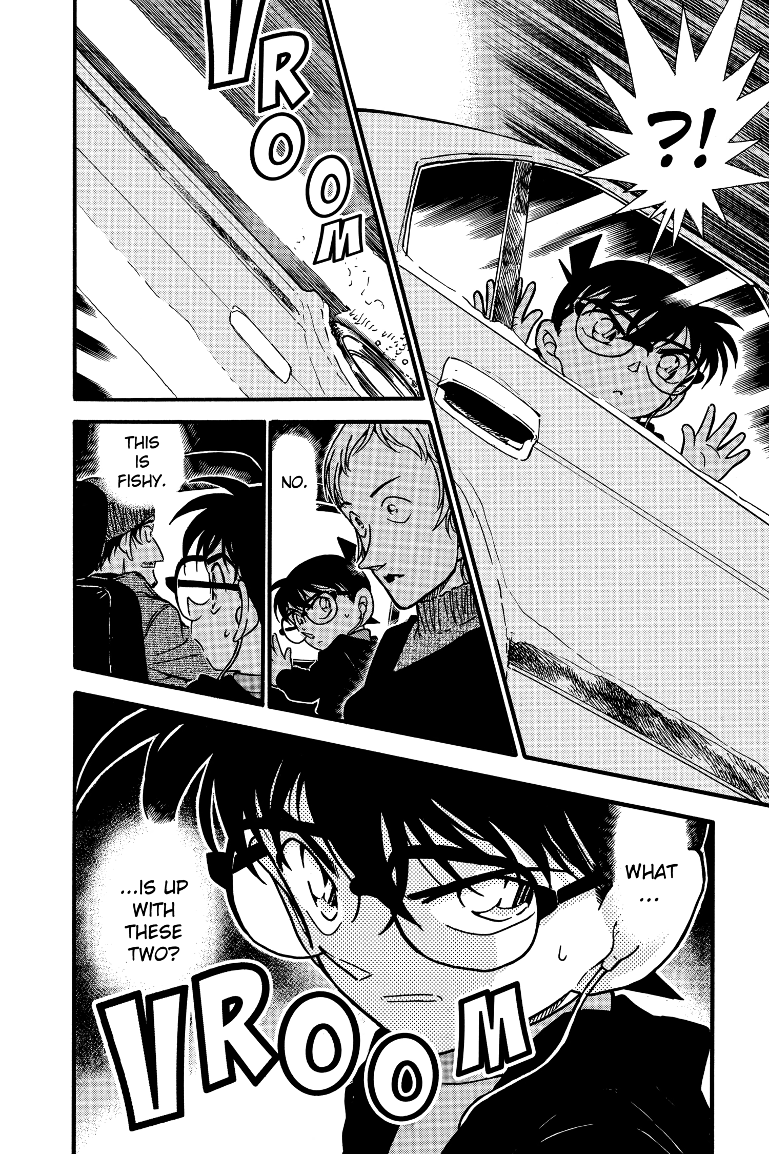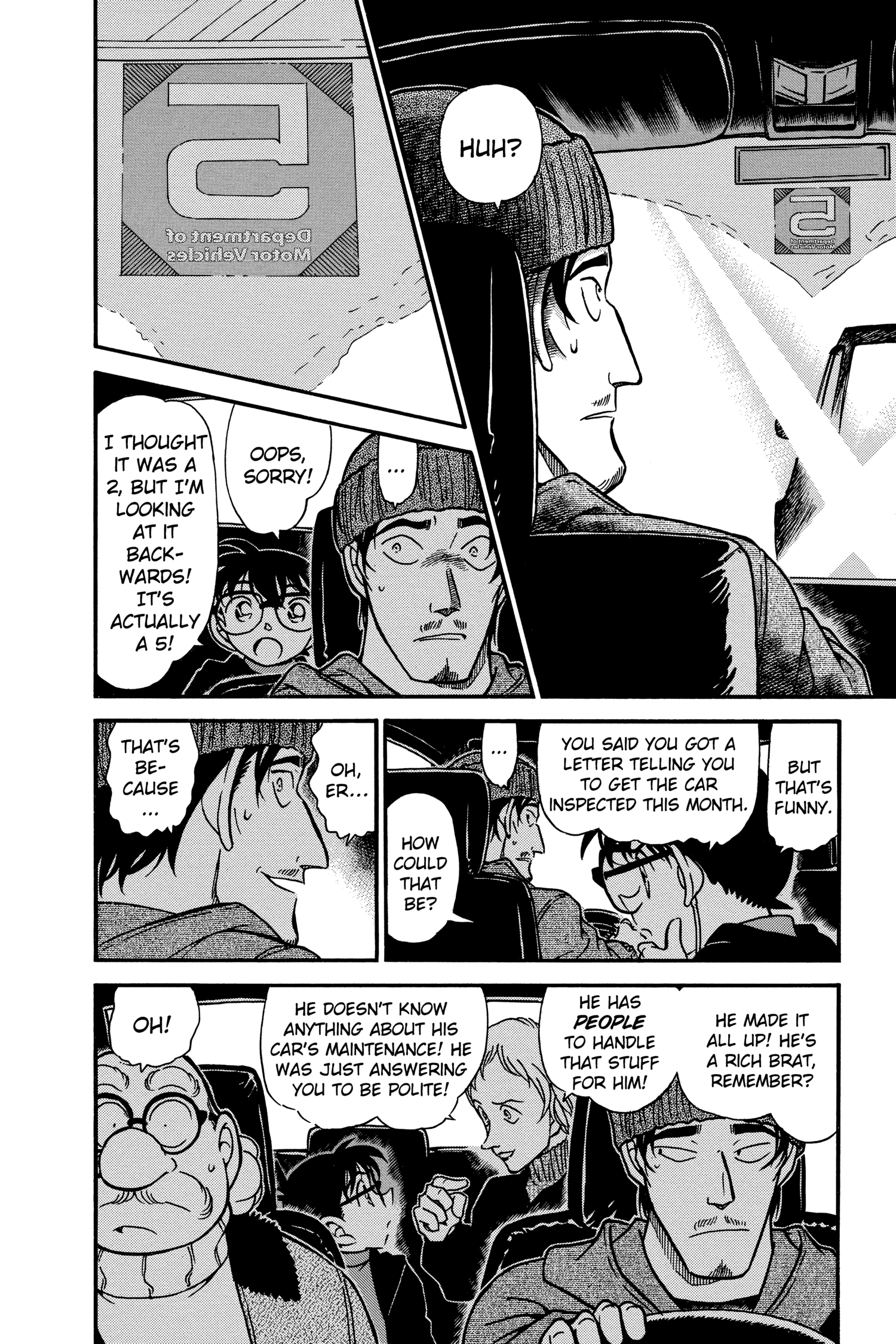 What is Conan looking at through the window? Is it because he's driving really close to the white line separating the lanes?