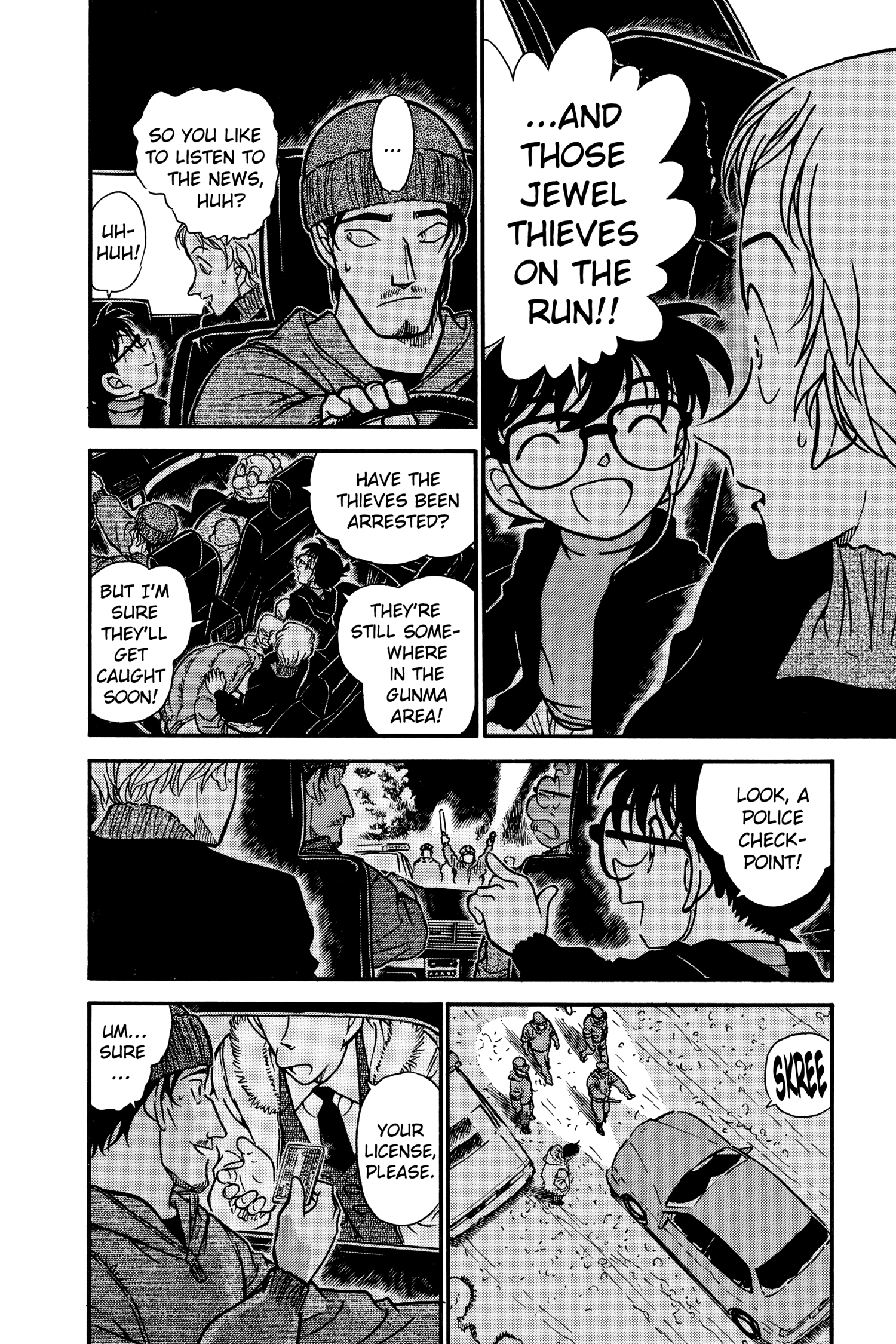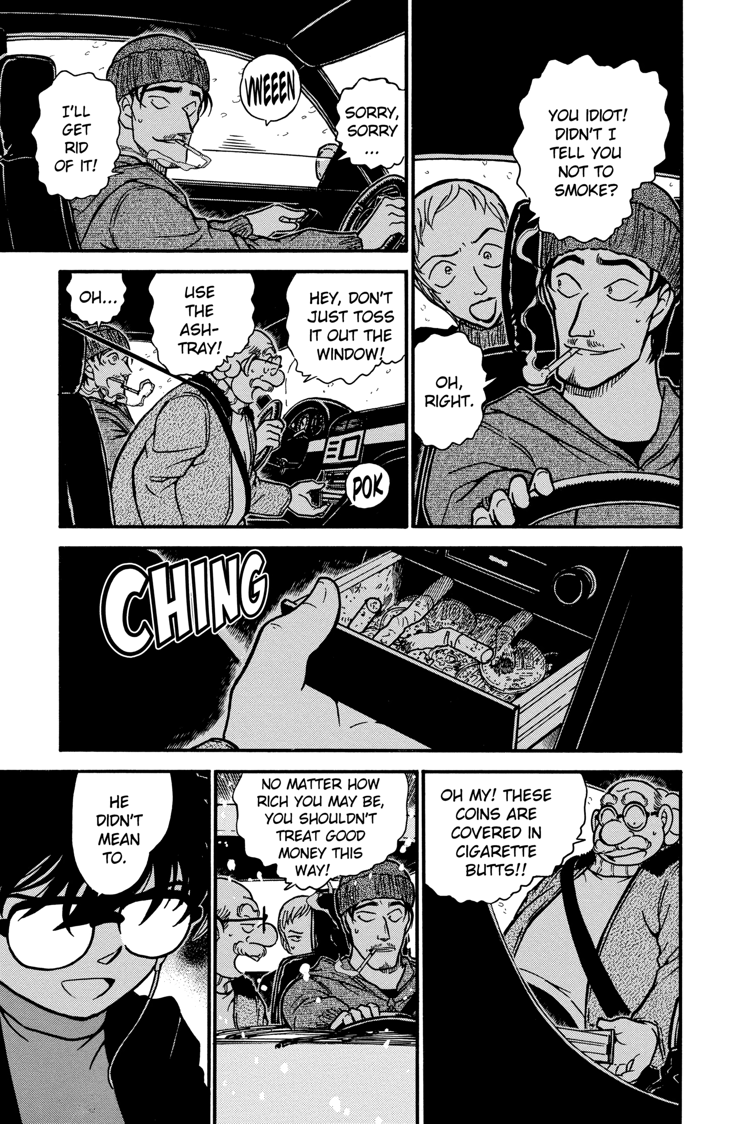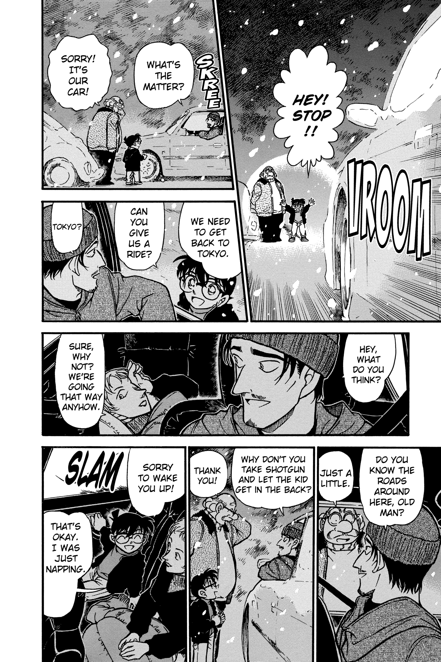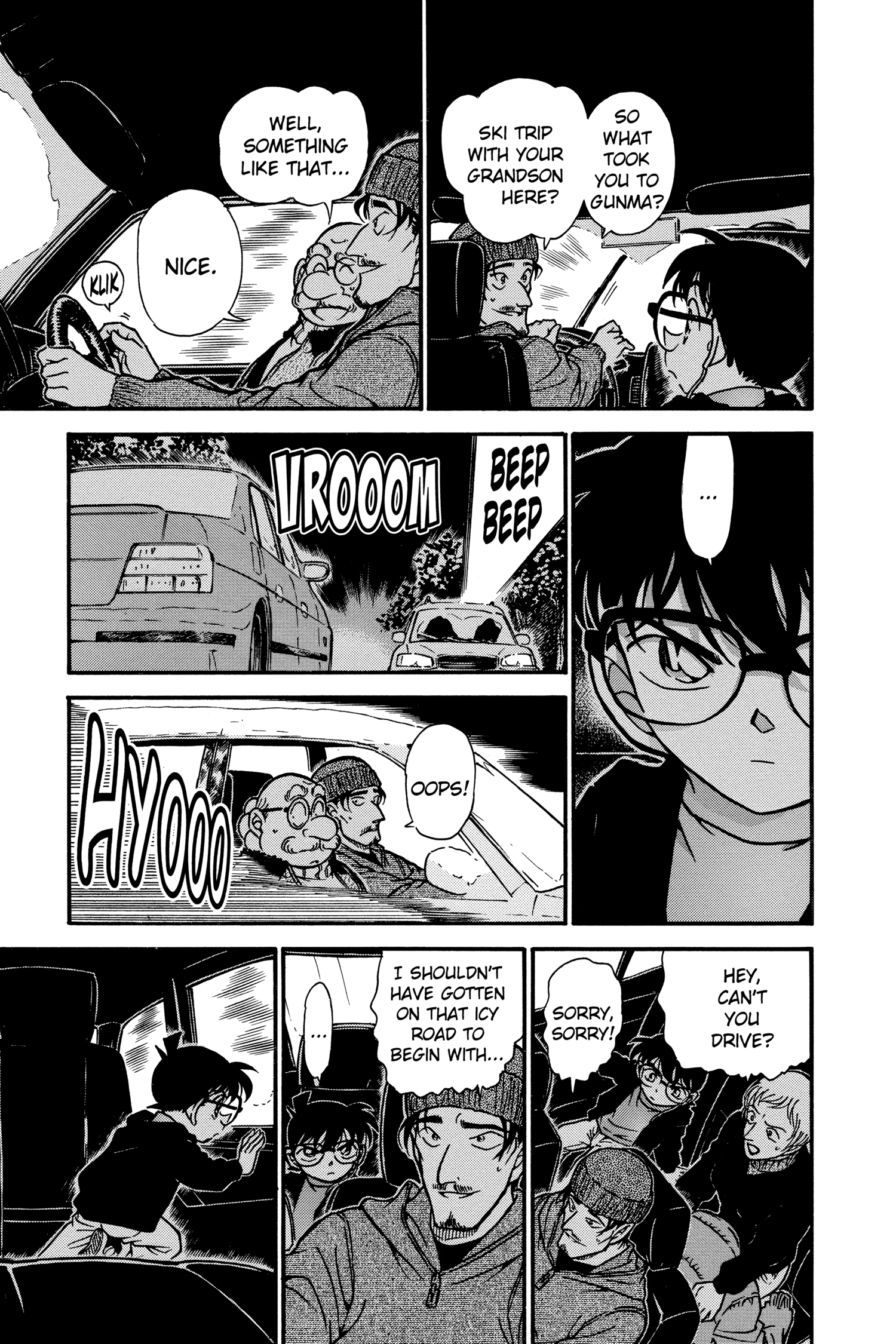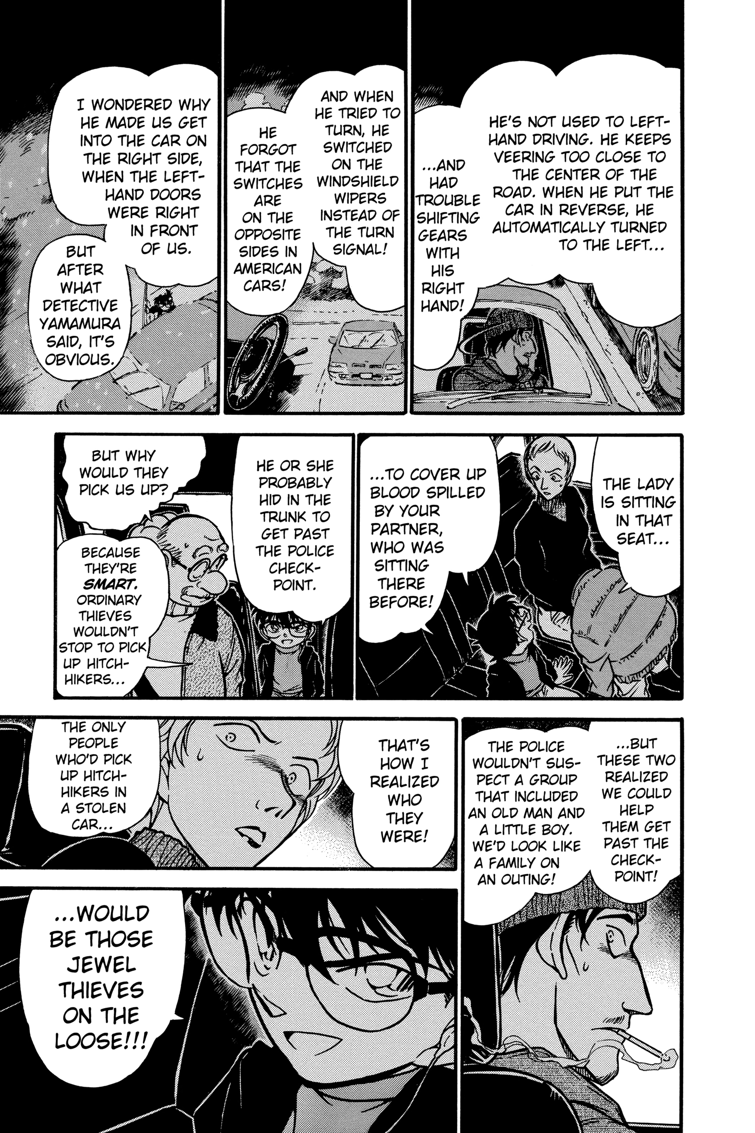 What is Conan looking at through the window? Is it because he's driving really close to the white line separating the lanes?