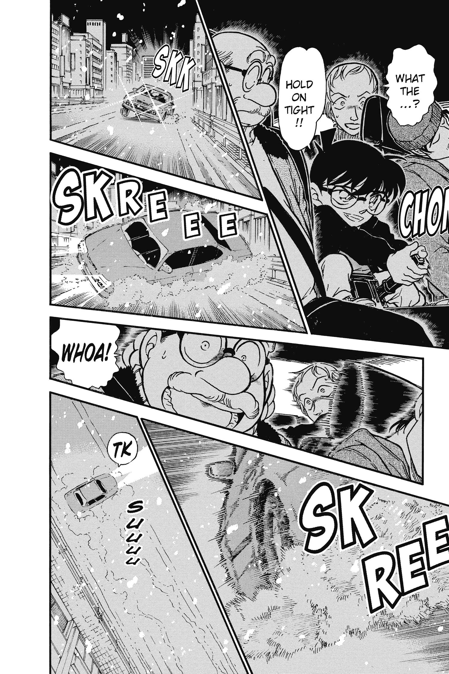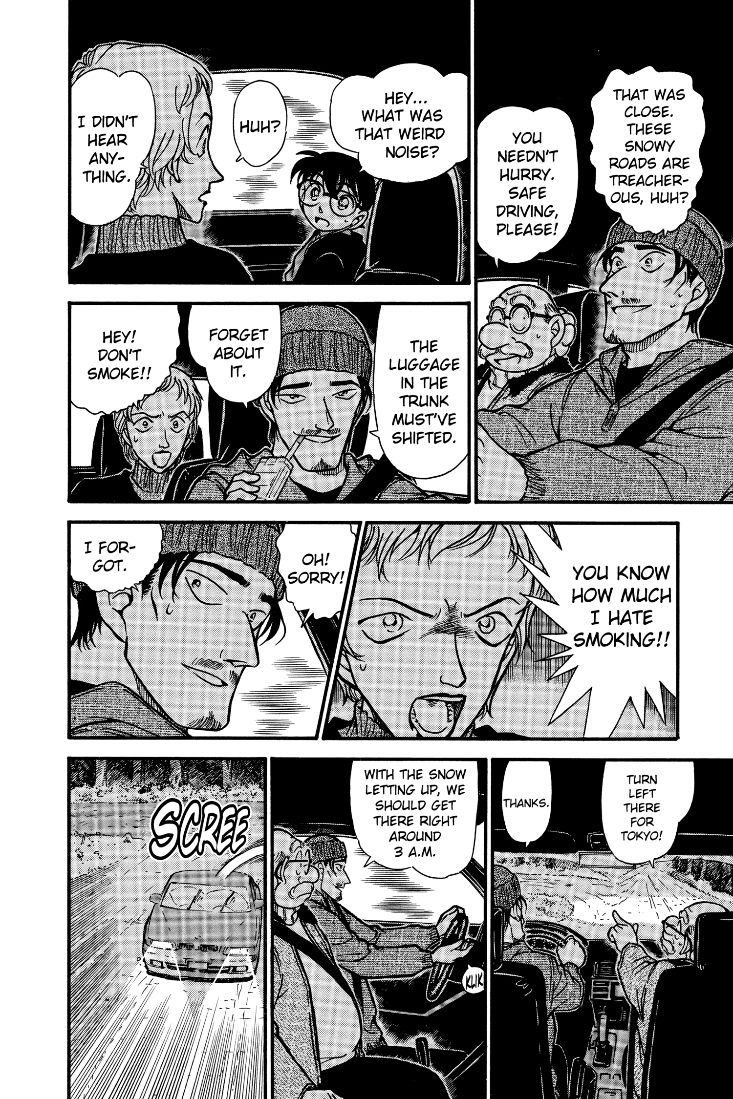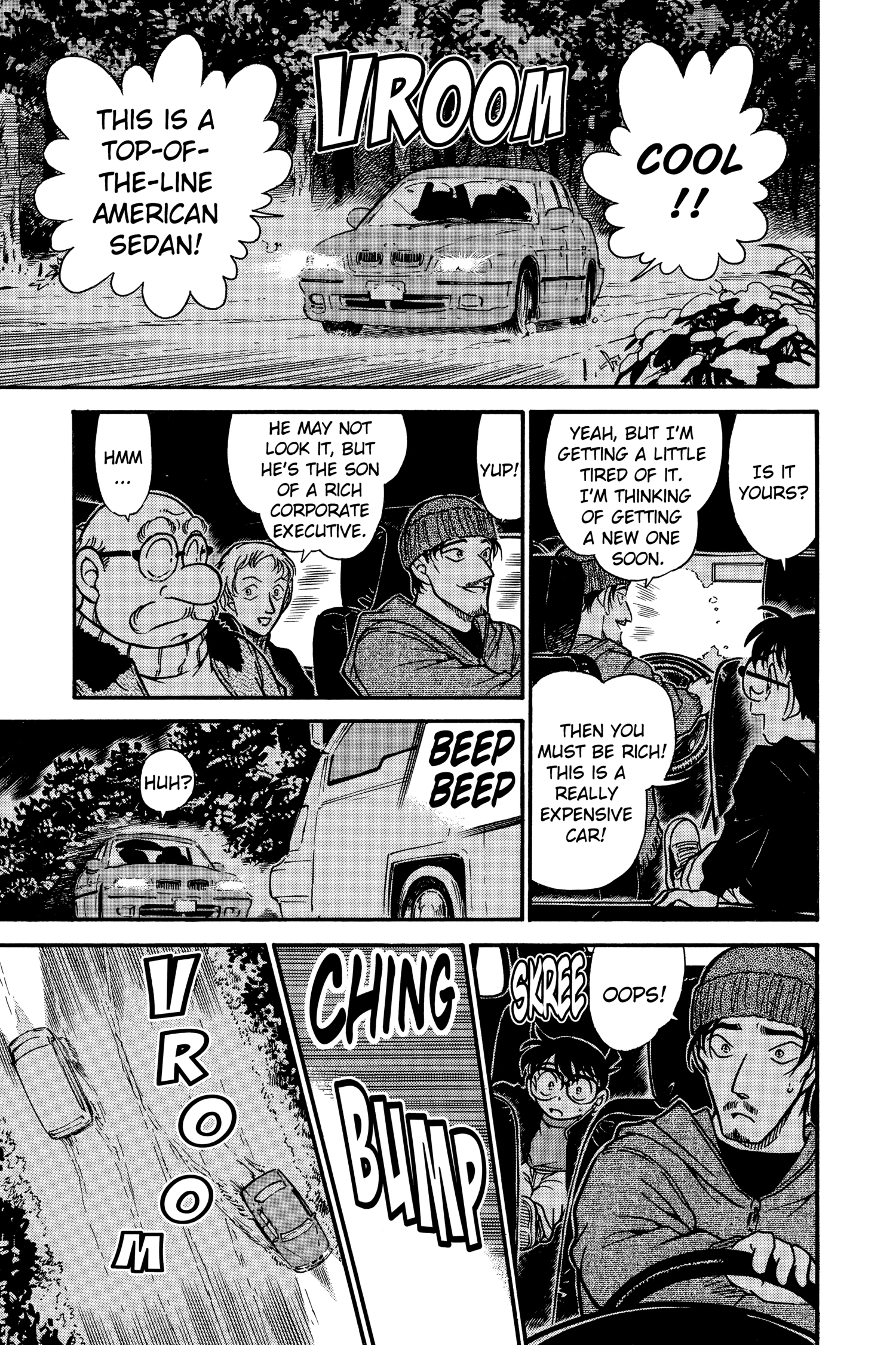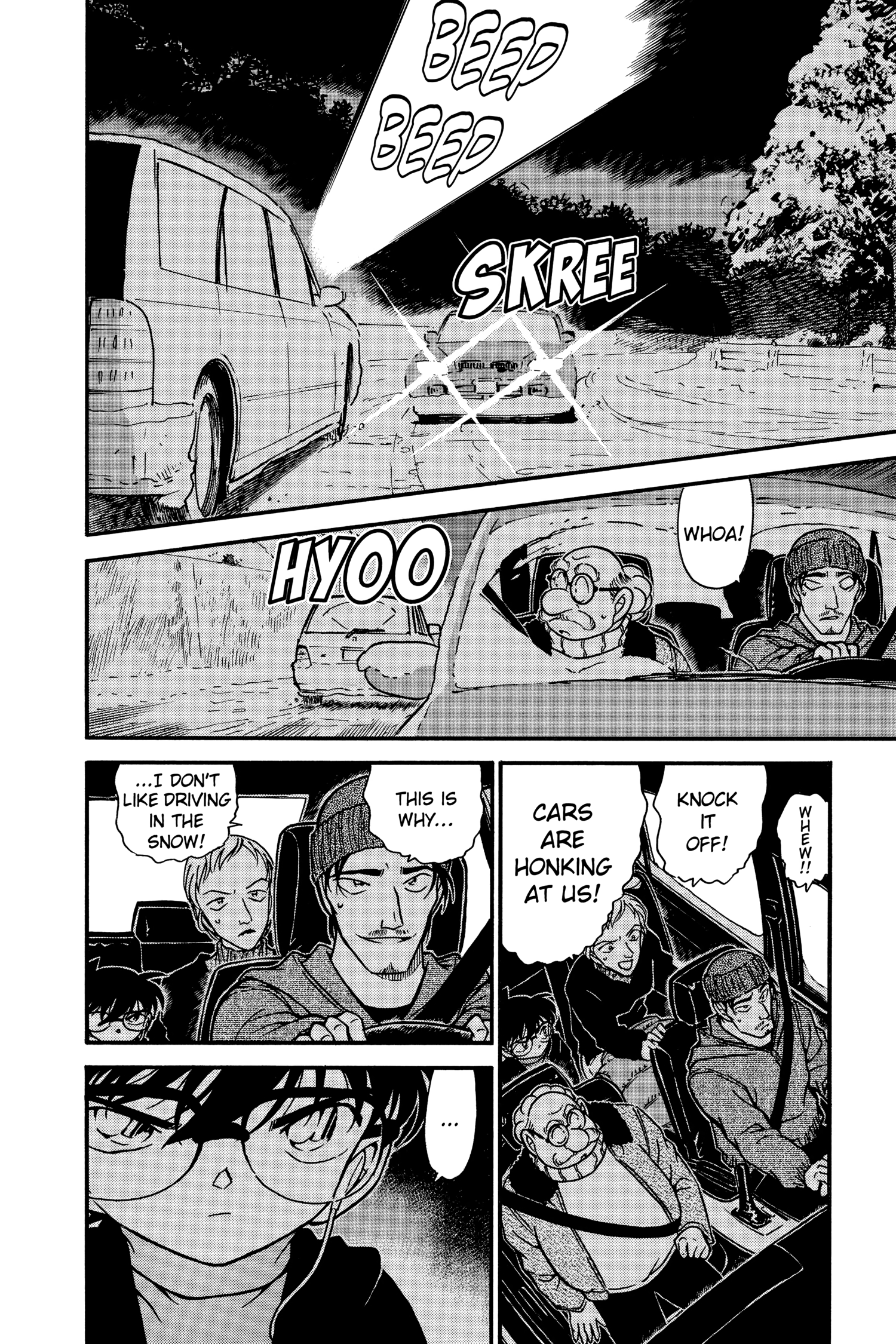 What is Conan looking at through the window? Is it because he's driving really close to the white line separating the lanes?
