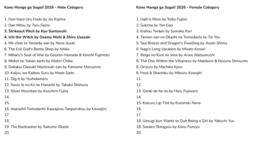 >>284388546This isn't split by male and female voters but by target audience (shonen/seinen vs shojo/josei) you retard. In the first place the winners are chosen by a jury, not by people.