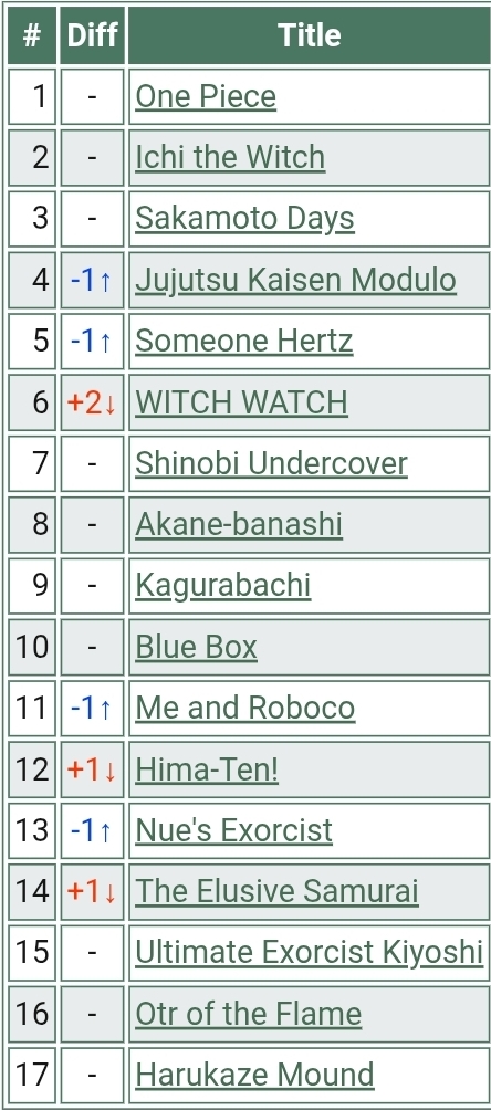 1 ・ Ichi the Witch ・ 56th Hunt: Extra 2 ・ SAKAMOTO DAYS ・ DAYS 234 ROOM 307 3 ・ Someone Hertz ・ #7: After All, I'm a Rival 4 ・ Shinobi Undercover ・ CHAPTER 55: BLACKBIRD 5 ・ WITCH WATCH ・ 223 Finally Said >Kagurabachi was on a break eight issues ago6 ・ Blue Box ・ #217: Wanna Take a Detour? 7 ・ The Elusive Samurai ・ CHAPTER 224: WHAT I HAVE AND YOU DON'T 1352 8 ・ Gonron Egg ・ Chapter 1: Egg of God 9 ・ Ultimate Exorcist Kiyoshi ・ Chapter 66: A Friend in the Demon Realm 10 ・ Nue's Exorcist ・ CHAPTER 120: CORRUPTION OF PUBLIC MORALS 11 ・ Me & Roboco ・ Chapter 255: Bellybands & the Gang 12 ・ Hima-Ten! ・ No. 64: Honoka's Workplace 13 ・ Otr of the Flame ・ CHAPTER 24: THE LAND OF THE GREAT TREE 14 ・ Harukaze Mound ・ CHAPTER 19: OBEY THE RULES
