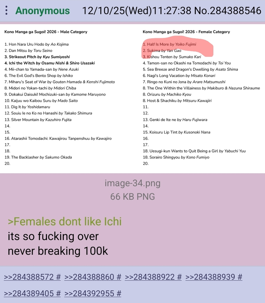>>284388546>literal who series for every single female category manga besides the hafu one>shillchi is a baseball, autobiography, and bookstore victim and everything else on the list is unheard ofWas 2025 a bad year for manga?