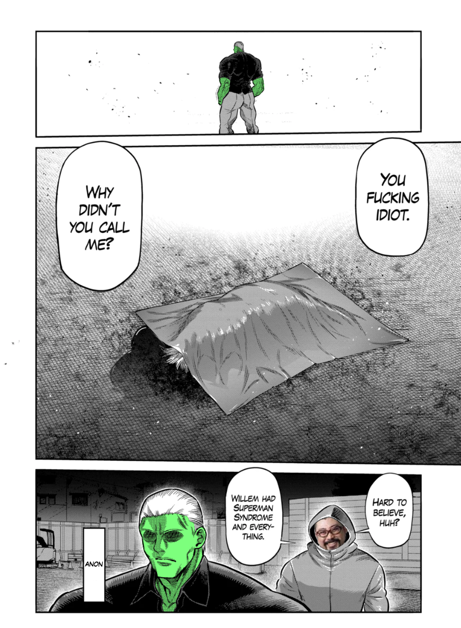 >>284428138>>284428271It's such odd writing from how it was portrayed, to how other characters react to it. Raian pops up, and Willem seems UTTERLY convinced that he (and the unfathomable Sean) can handle him no problem. Are we supposed to interpret this random slaughter from Raian as specific revenge? Did Willem beat him in the great offscreening, which is why he's confident about doing it again? That seems rather unlikely after how he did against Akoya + how Raian was surprised by his superjobber syndrome.Even if you discount the Eddie kill for the circumstances + nobody in the Wu knowing exactly how the hallway brawl went down due to no survivors, shouldn't Willem be aware of what he did to Alan and realize he might be a little out of his depth/call Gilbert like Gilbert himself pointed out? Or are we just supposed to assume Willem's original characterization of being cautious and a little self-deprecating isn't canon anymore, and he's always just been cocky retard weapon mook #52423?