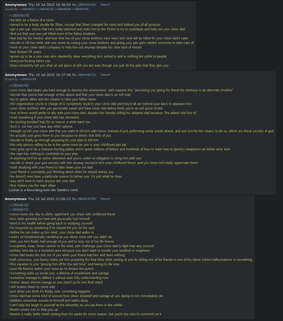 >>284428280Luohan is a joy because in Sandro's attempt to push all of Shen's sins onto another character he couldn't also spare the effort to make Luohan convincingly irredeemable. As far as anyone who's been reading Omega so far can tell Luohan is the only sensible Shen clone who reasonably hates the guy and wants him dead while Ohma will risk everyone's lives, including Ryuki for the sake of a good fight and Ryuki just goes along with it because he's pretty sure no one 'really' cares about his opinions anymore. Fuck Shen, he's an abusive father playing favorites and it's workingLuohan isn't stoic, he's not basedmaxxing and he isn't complimenting people other than the abilities he could inherit from his ancestors. He's instead an incredibly zesty spunky guy who's always enjoying himself because he knows this is all one big joke