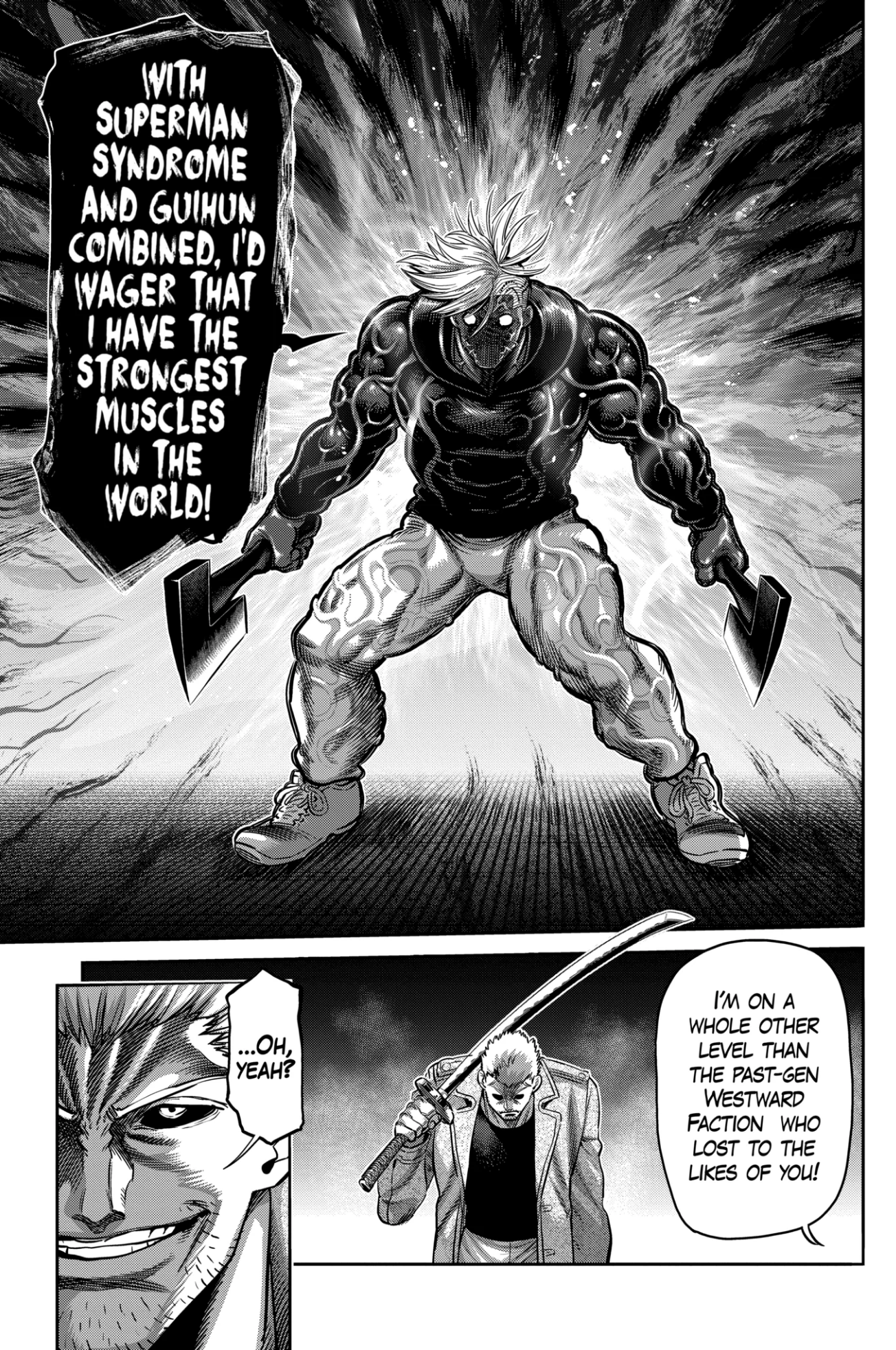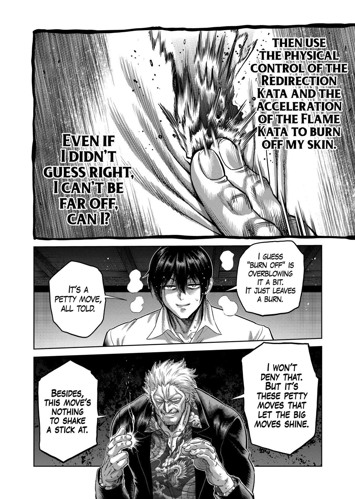 >>284479562>then gateslop finished it off.I'm going to go ahead and defend the celestial gates in Tenkaichi. They haven't ruined the story as predicted and honestly there are still odd powers in keeping with Honda's "Brilliant Body", or Toda's "Eyes of the White Night". What makes any tournament focused series work just boils down to good fight choreography, and a good story between each fighter. Tenkaichi still has that in spades. Sumo vs Sword Saint still has one of the best rapports between the fighters as both represent the pinnacle of their craft but the post-Gate fights haven't been lacking either. Hanzo vs Kojiro; fantastic fight between the everyman carrying on the legacy of his bro, and a broken human that was blind to their own humanity. Yasuke vs Togo is the weakest but it isn't because of Gates and more because Togo's style is just pretty boring at the end of the day. "Swing harder" can only go on for so long and the fight should have been 2 chapter shorter. I firmly believe that Ishun vs Jinsuke is the 2nd best fight so far. It has similar themes to the Hanzo fight as both were about seasoned fighters going up against young prodigies but tells it in a distinctly different manner. It was also carried by the art because pages like this give me chills. Jinsuke also doesn't have gates and manages to beat his opponent purely because he's capable of evolving across the fight. It's good shit. Whether Gates break the narrative will have to be seen in the 2nd round and we'll see if the writer has to retcon existing fighters as secret gate users or start handing out gates more liberally as a new powerup.