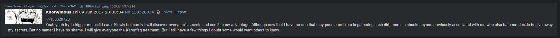 >>284434453Yeah he was wildly flailing with false accusations to move suspicion away from himself at the end of last thread.