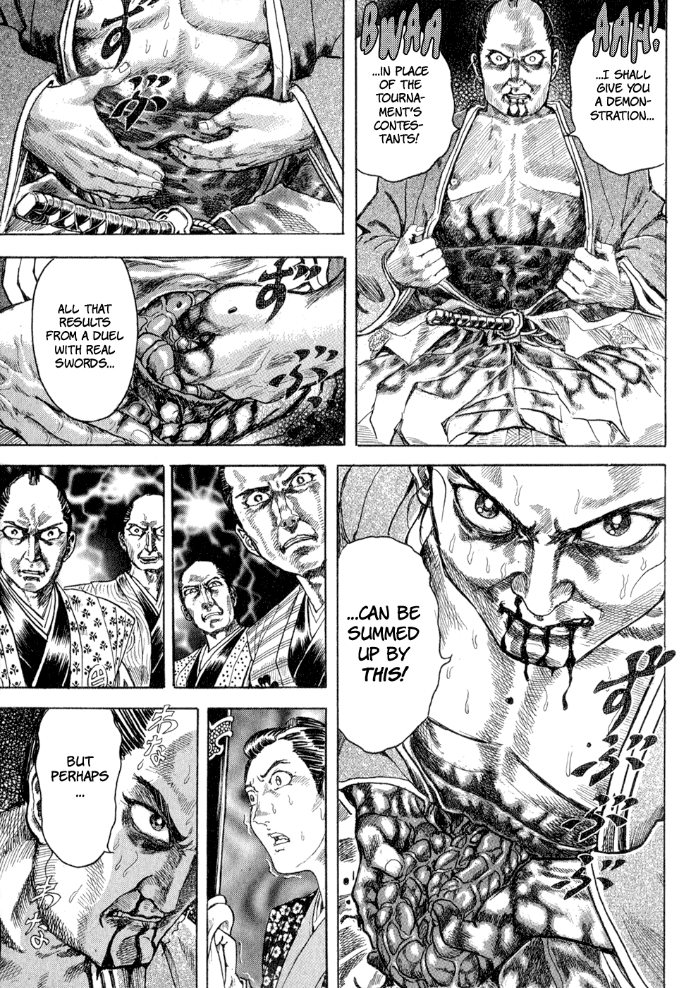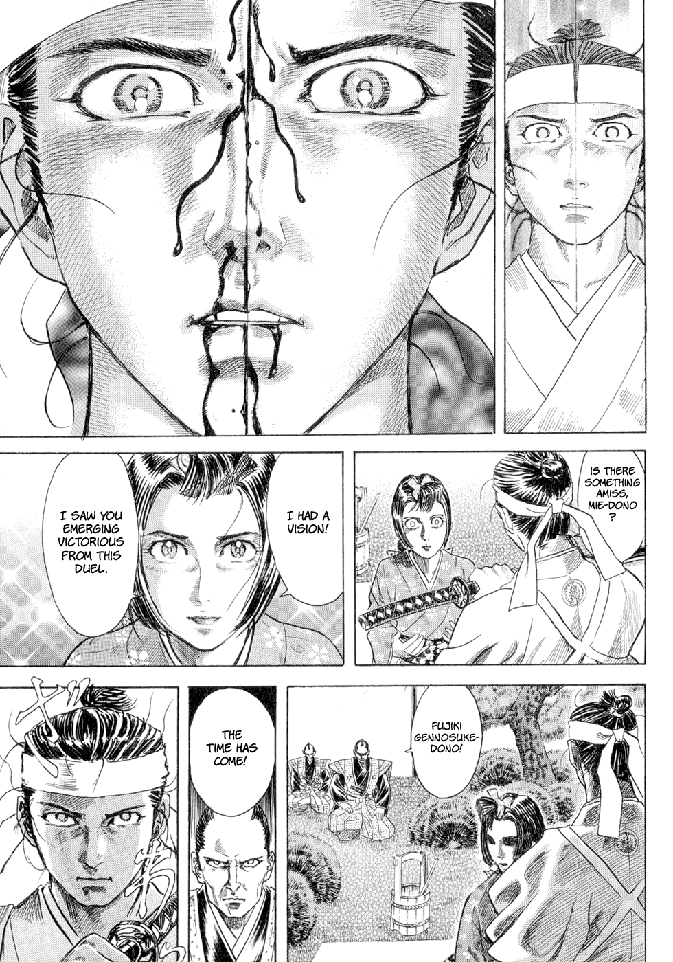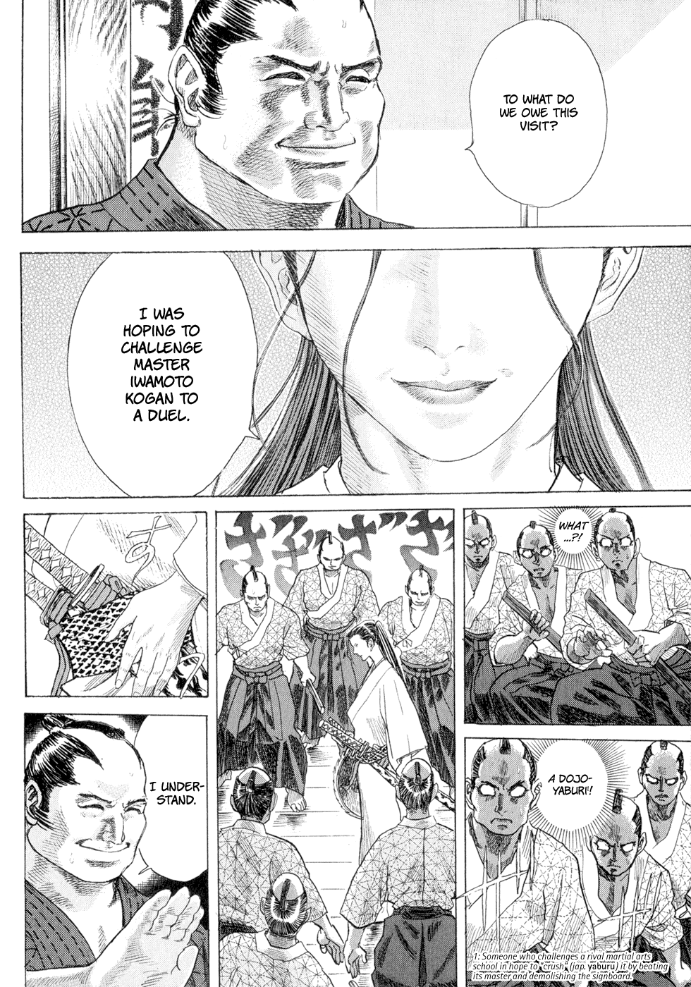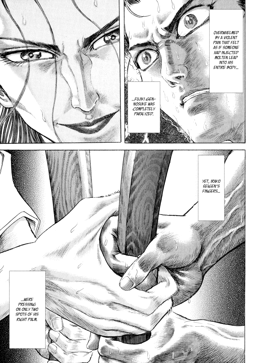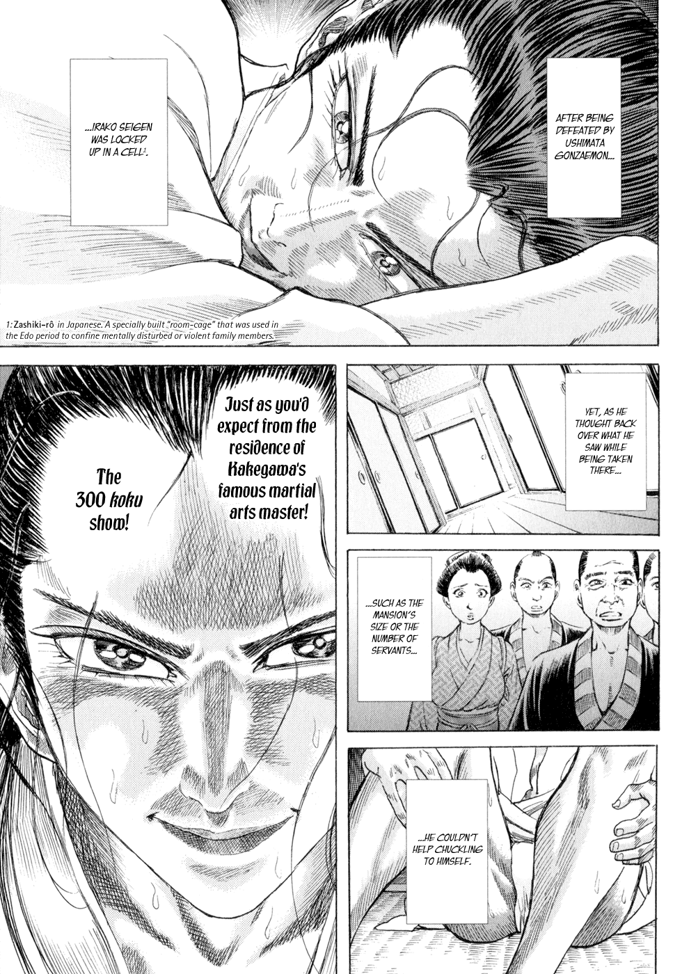 I read the novel for the first time and it's amazing how much the manga added. The story of Gennosuke and Seigen in the book is like 10 pages long and it's one of the less interesting stories; their whole rivalry is just about the women. Basically everything except the two's signature techniques is original to the manga.All the crazy details in this volume alone: the pressure point stuff, the "beautification," the bean-cutting initiation, Kogan being senile but still deadly. All manga-original.