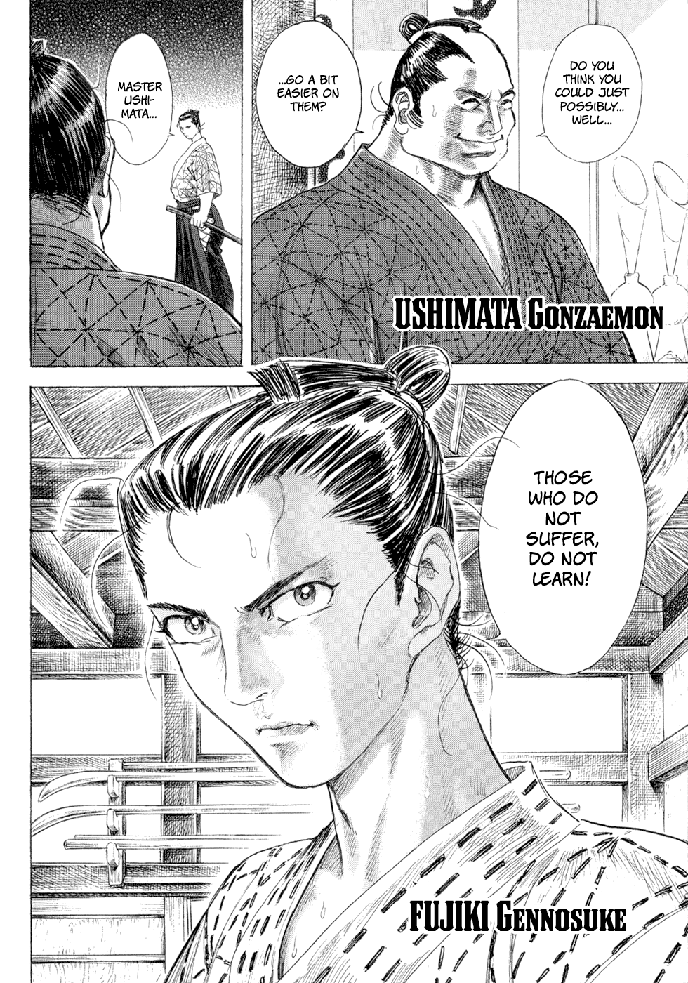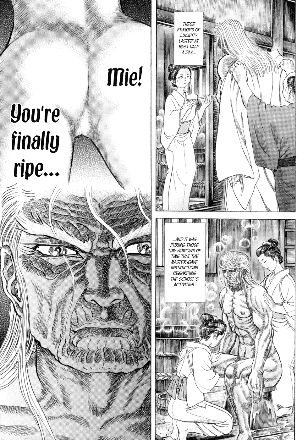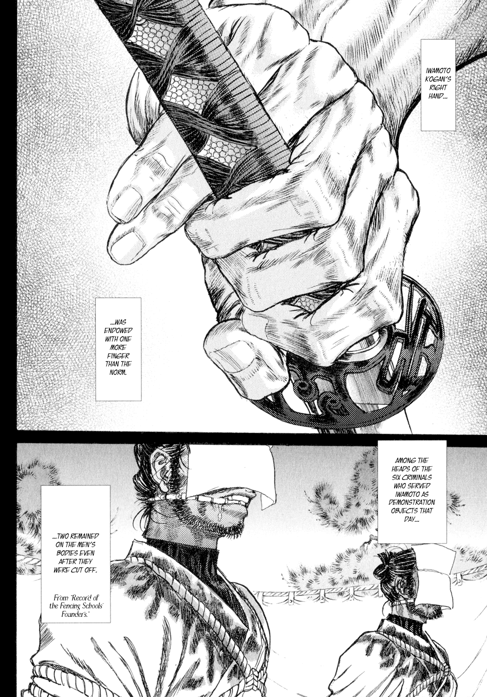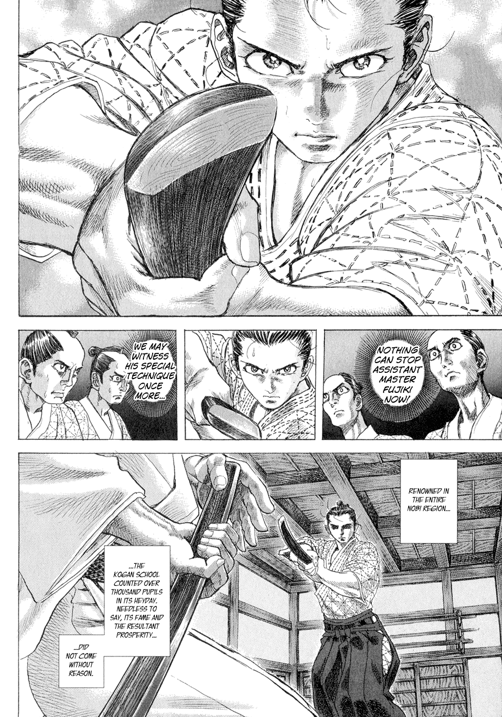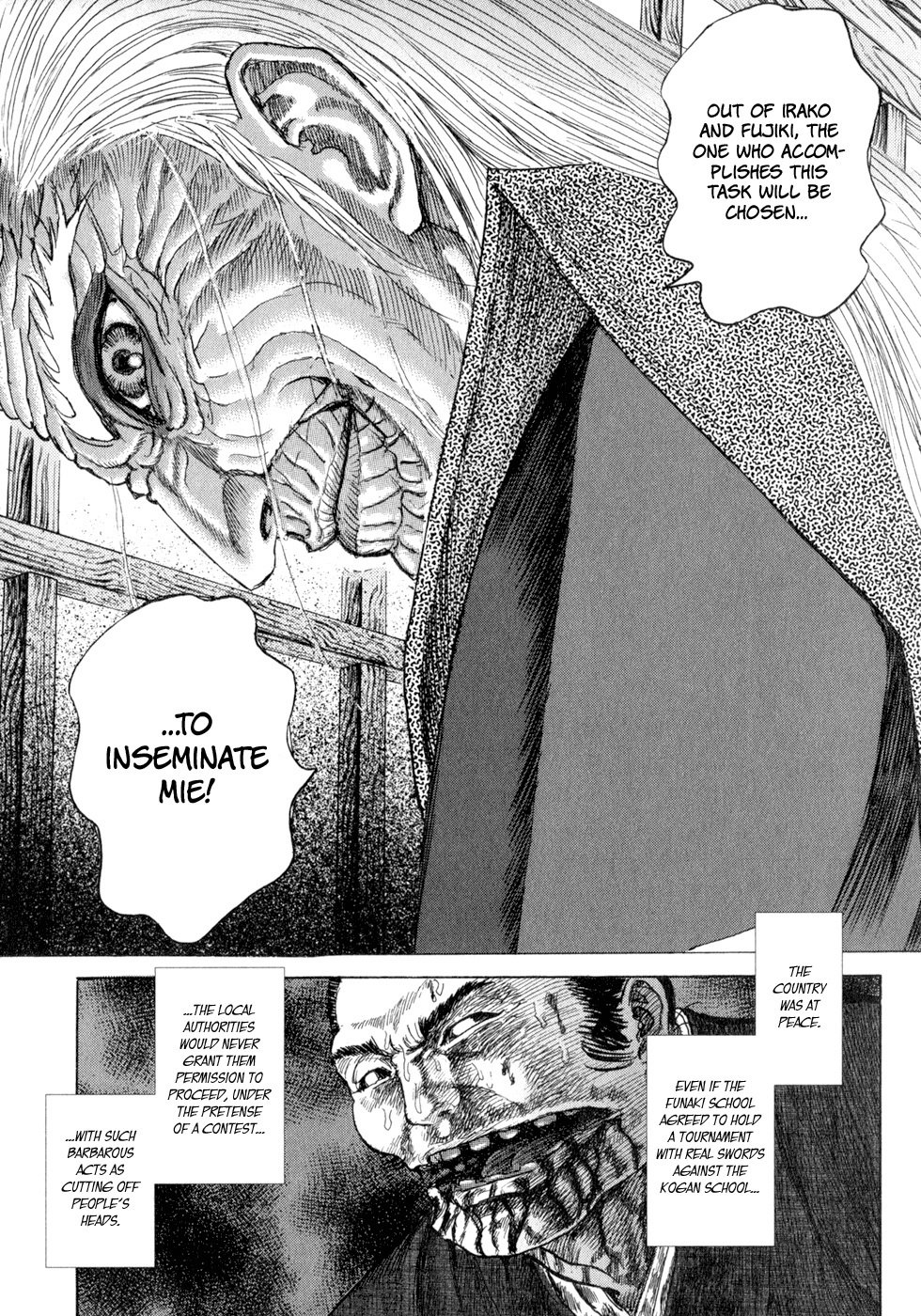 I read the novel for the first time and it's amazing how much the manga added. The story of Gennosuke and Seigen in the book is like 10 pages long and it's one of the less interesting stories; their whole rivalry is just about the women. Basically everything except the two's signature techniques is original to the manga.All the crazy details in this volume alone: the pressure point stuff, the "beautification," the bean-cutting initiation, Kogan being senile but still deadly. All manga-original.