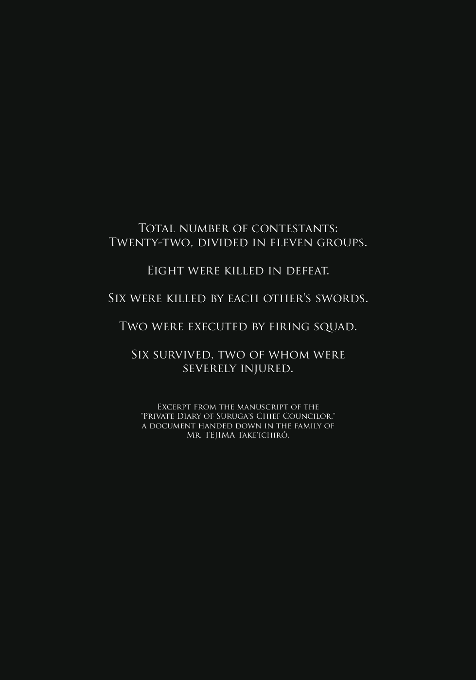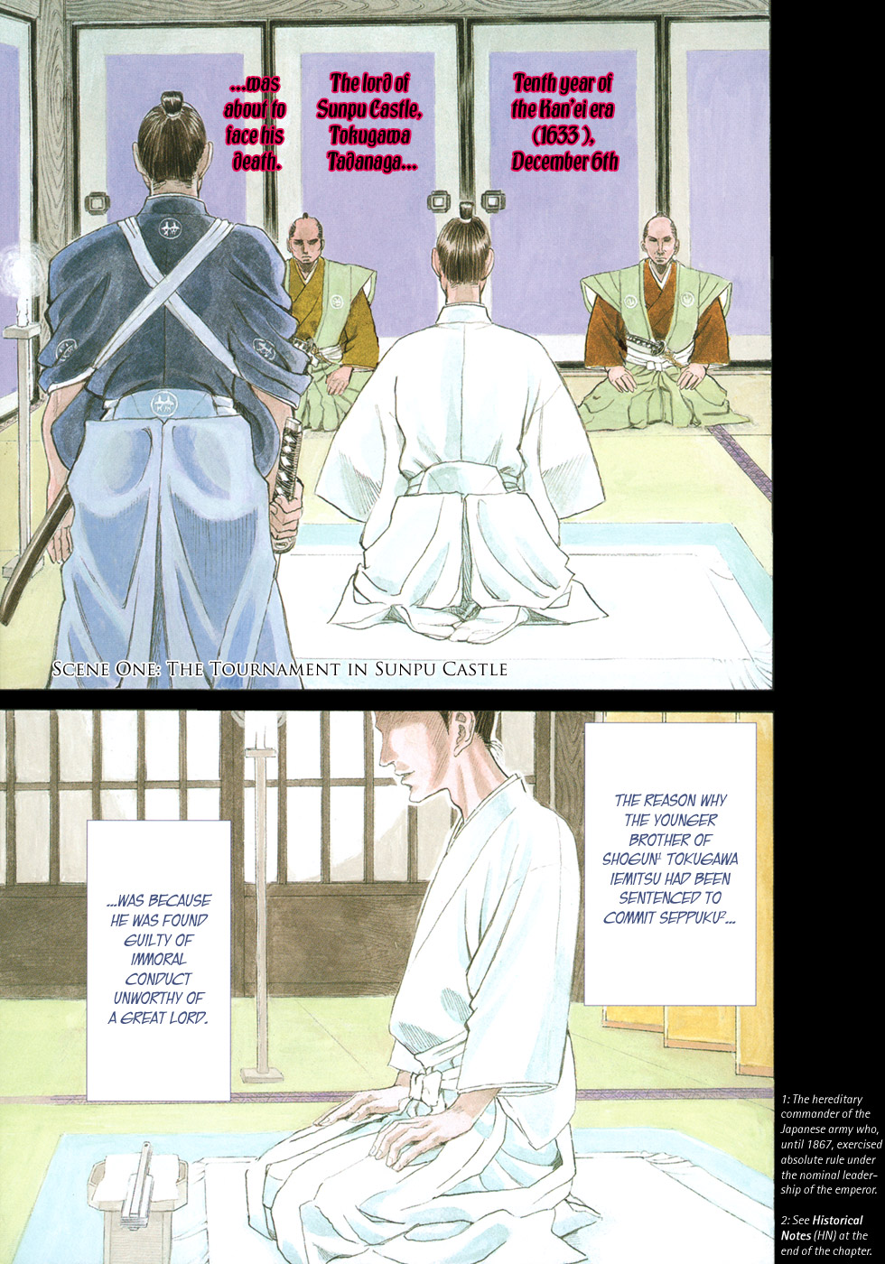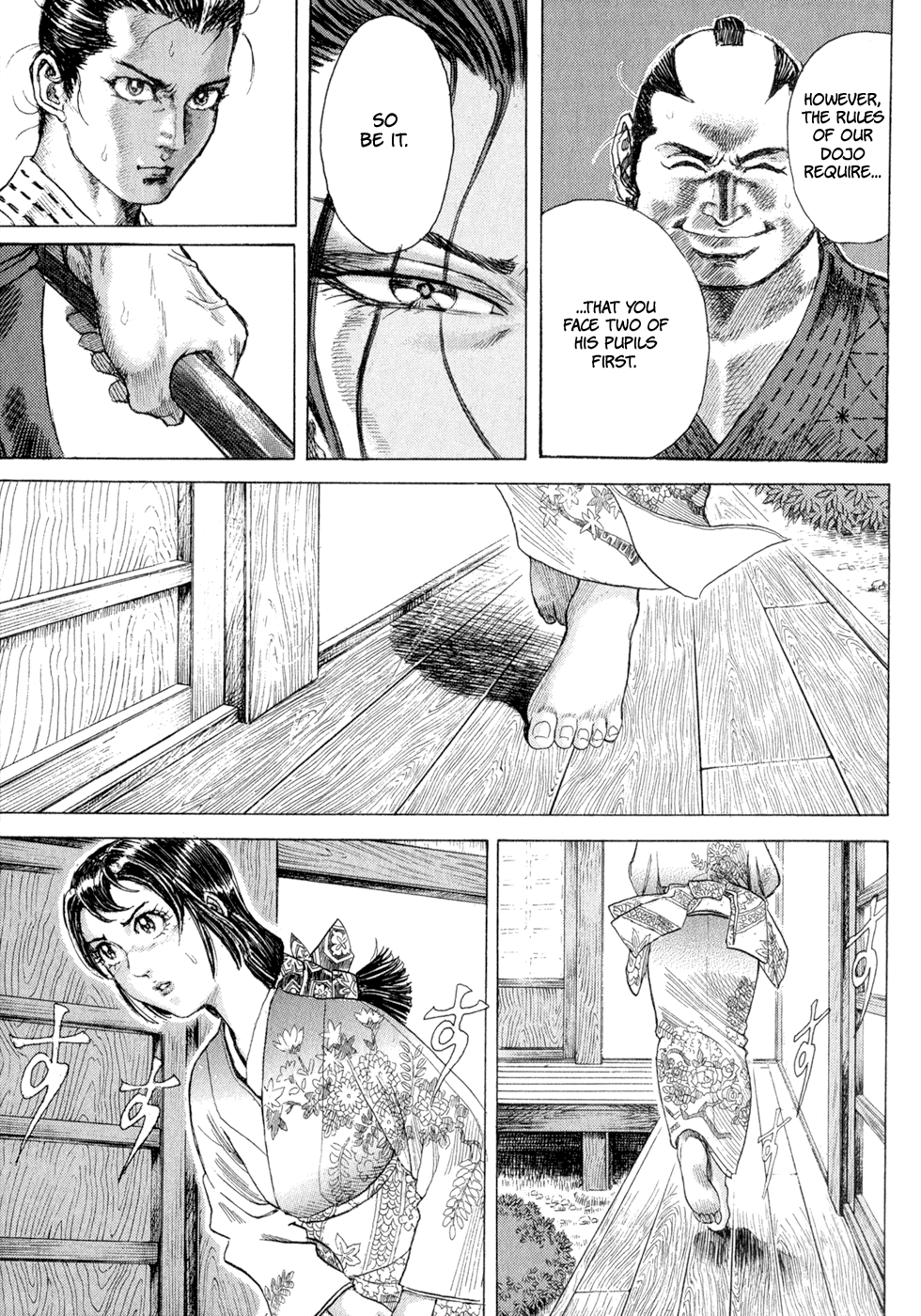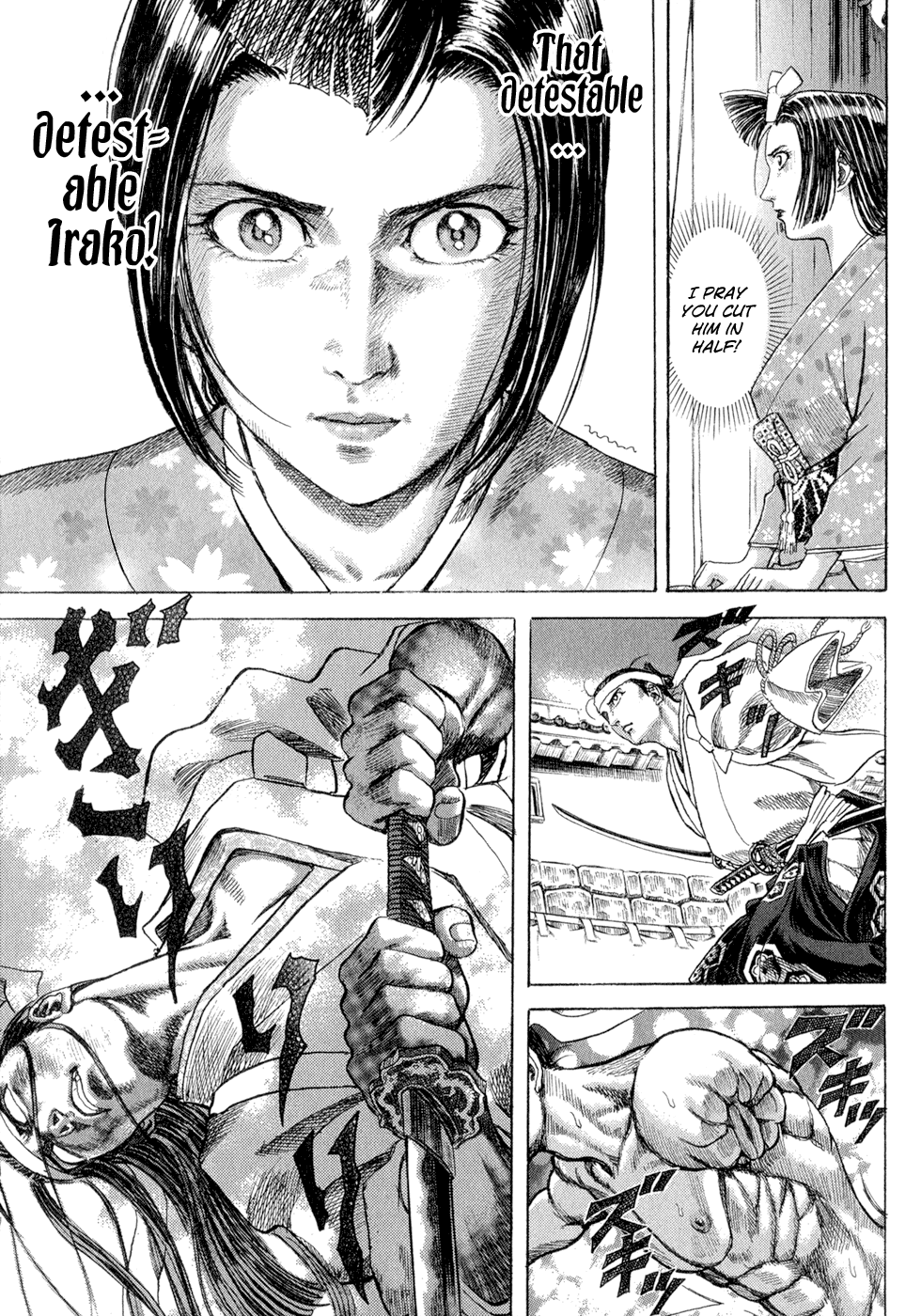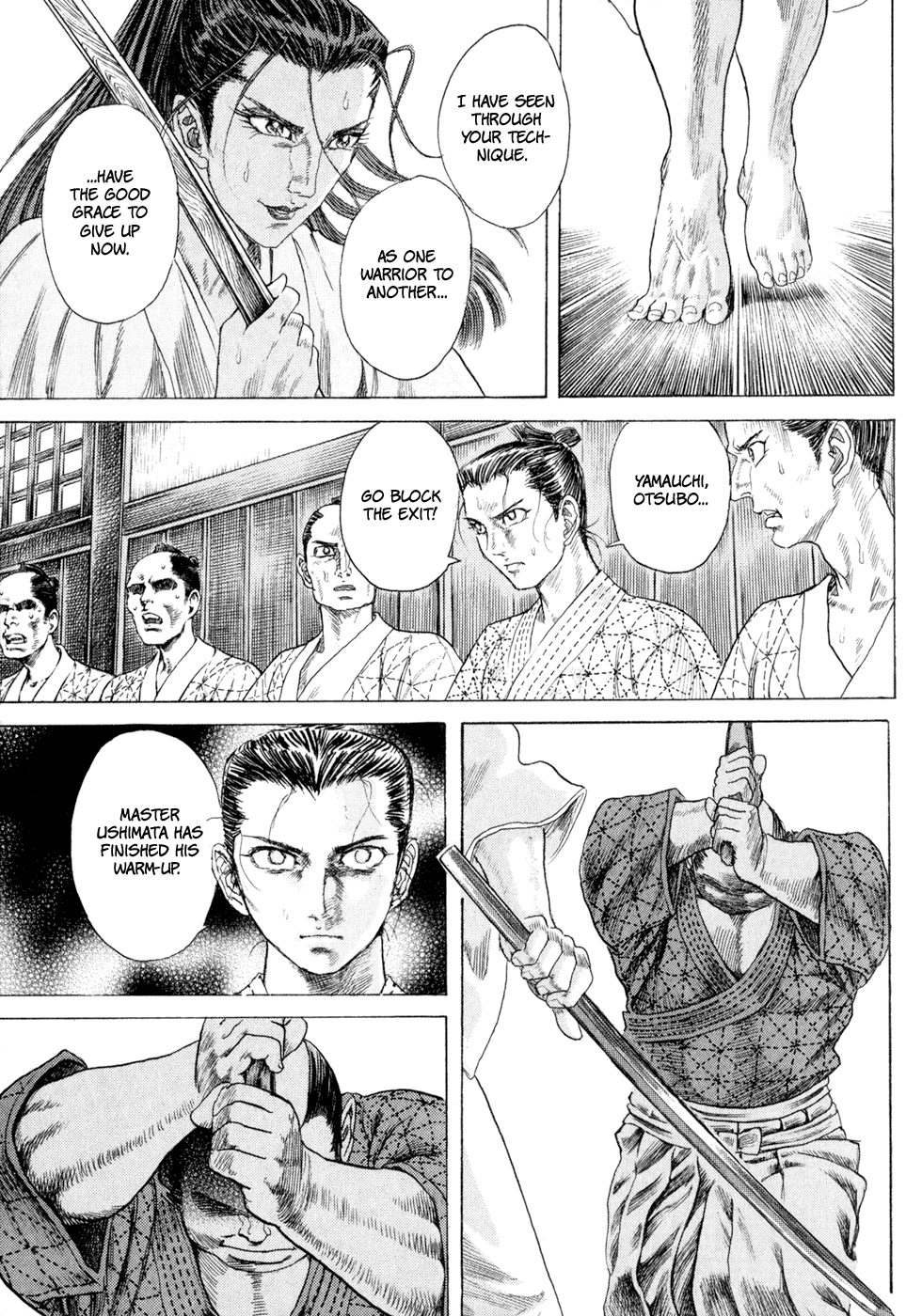I read the novel for the first time and it's amazing how much the manga added. The story of Gennosuke and Seigen in the book is like 10 pages long and it's one of the less interesting stories; their whole rivalry is just about the women. Basically everything except the two's signature techniques is original to the manga.All the crazy details in this volume alone: the pressure point stuff, the "beautification," the bean-cutting initiation, Kogan being senile but still deadly. All manga-original.