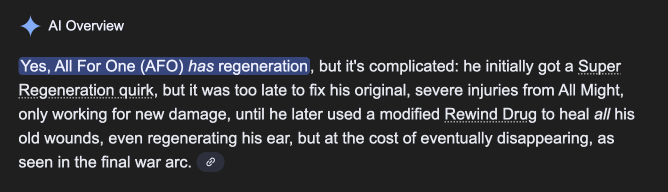 >>284471837>Then why did hori make the characters say that this version of afo doesn't have regen multiple times?Can you post or list some examples?>Afo didn't have it during the second All Might confrontationAfo didn't get wounded in the second All Might confrontation, All Might knocked him out in one hit. That doesn't get regenerated, it's not a wound.