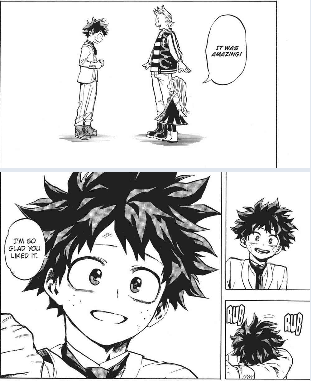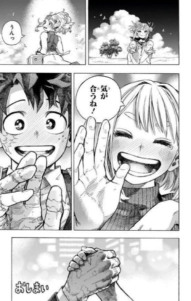 >Manga ending was bland>Anime ending at least tried to make something of itStill a whimper of an ending, but it was better than the manga's version by far. Deku being green Iron Man is funny though.