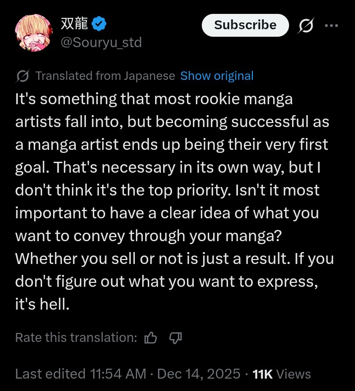 >>284487226I bet you didn't say the same about Kagurabachi when Yura first appeared. This is a pretty common thing, most of the time it's just the mangaka telling their fans that they made it.