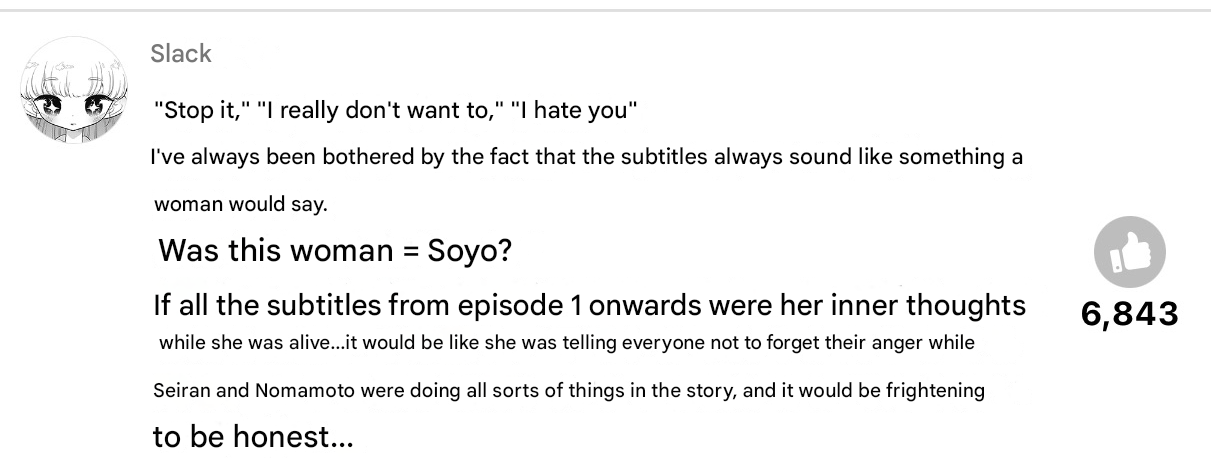 >>284482276>Bad plot, making Soyo and Odori evil bitch is ridiculous and is scenaristicaly nonsensicalyup, remember that, before all this, there has been literally no indication that Soyo herself was TAD-crazy outside of Seiran's shizo episodes. plus, remember that this is lily's narration, so it could just be alien lies.