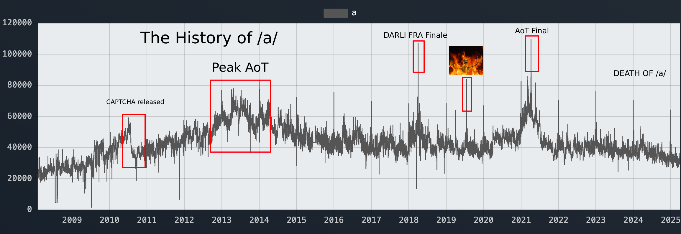 Think about it for a moment; despite anime/manga being more popular than ever and the industry breaking records /a/ is the slowest it has ever been in decades; at a mere 24k posts per day. This is possibly the slowest since 2008, and the internet as a whole has more than quintupled in traffic since then.