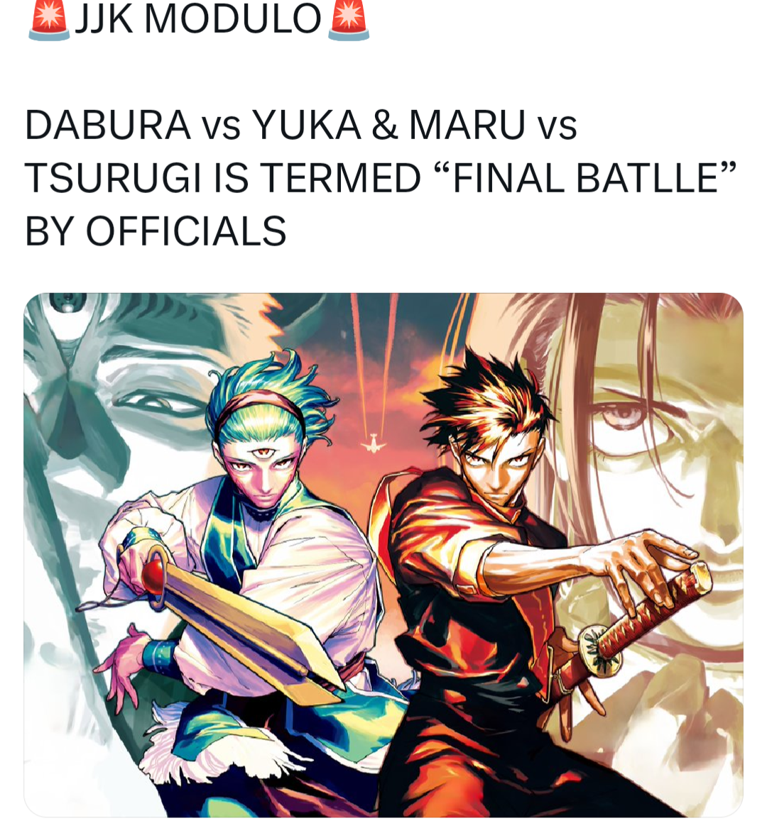>>284513738Yup yup, told you guys Dabura is gonna be losing to Mahoraga. Then just when it looks he'll die, Yuji gonna show up at the last second to one-shot Mahoraga so that both him and Yuka will live. Dabura will be too exhausted/injured to have another fight with Yuji, at least within the story of Modulo, as we know that seemingly none of the aliens know how to RCT.