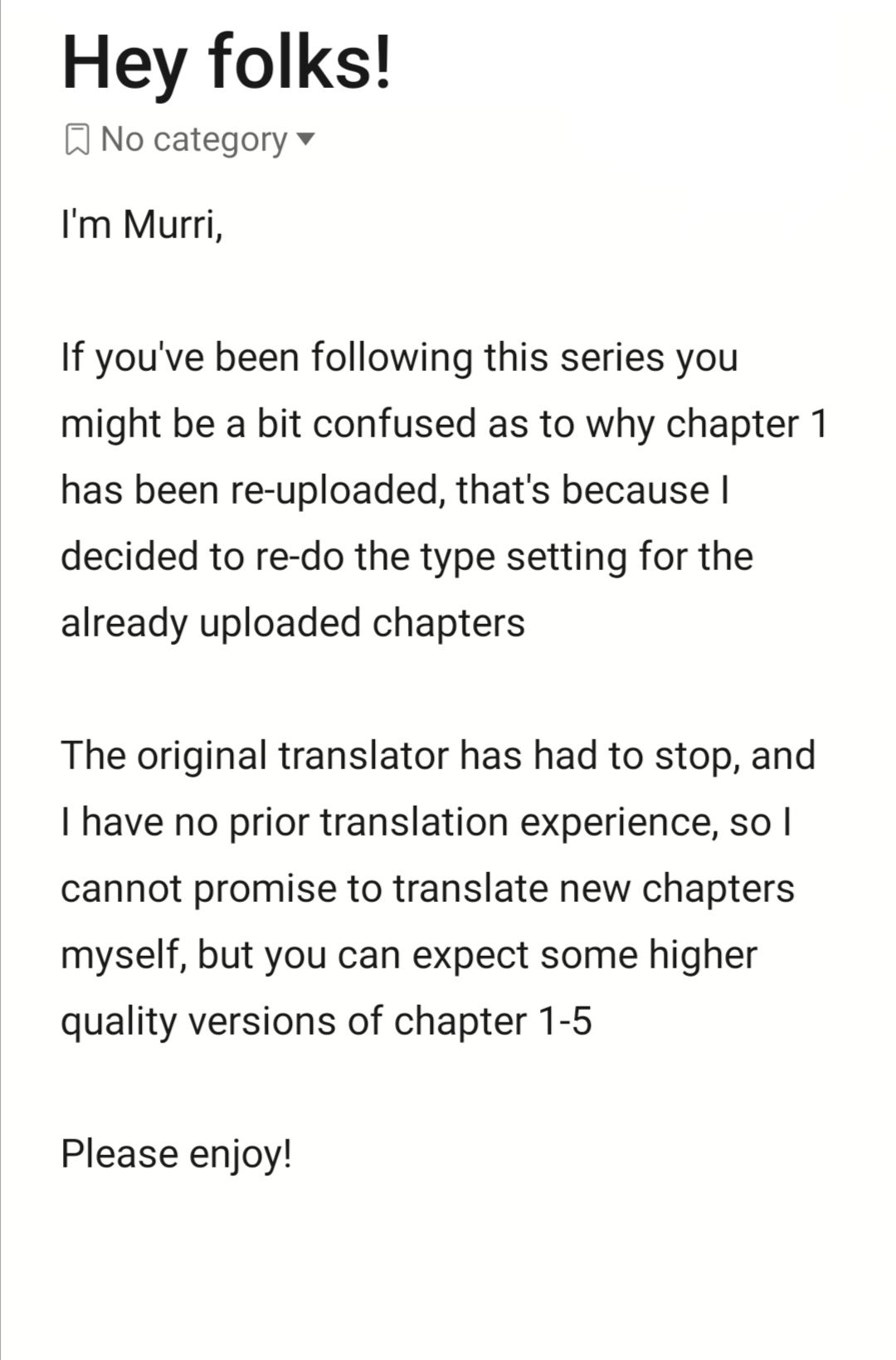 Anime got delayed so will dump some chapters, maybe weekly.