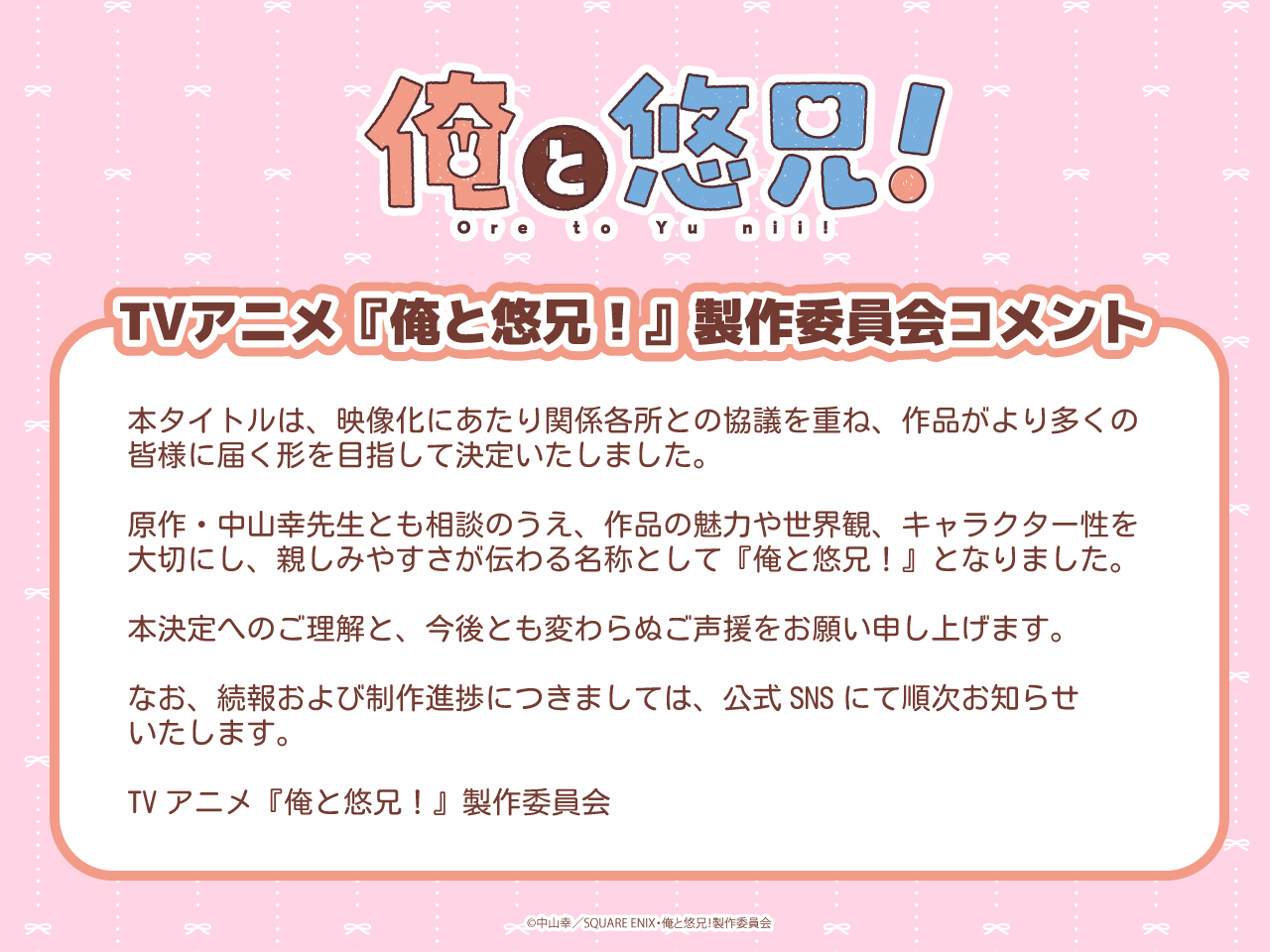 >After consulting with the original author, Nakayama Yuki, we decided on the name "Me and Yu-nii", which is friendly and conveys the appeal, worldview, and characters of the work.