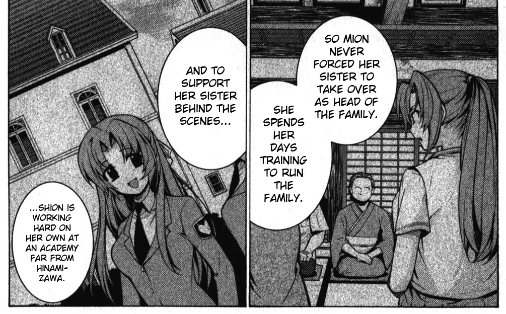 >>284570713Mion basically put aside what she sees as her "feminine" side once she had to become "Mion, the successor", the role that had been initially created by and for her sister. But she keeps this bottled up even though she likes girly things and wants to be seen as a girl, since she thinks it's the burden she has to carry since she feels responsible for Shion ending up in her current situation.In a way, their "natural" personalities is basically what you see in Saikoroshi, since there the one we know as Shion never lost the leadership position and continued being "Mion". So, the old man stuff and the general way she speaks all come from Shion before the identity switch. But the interest in games is genuinelly Mion, and caring personality are genuinely Mion.