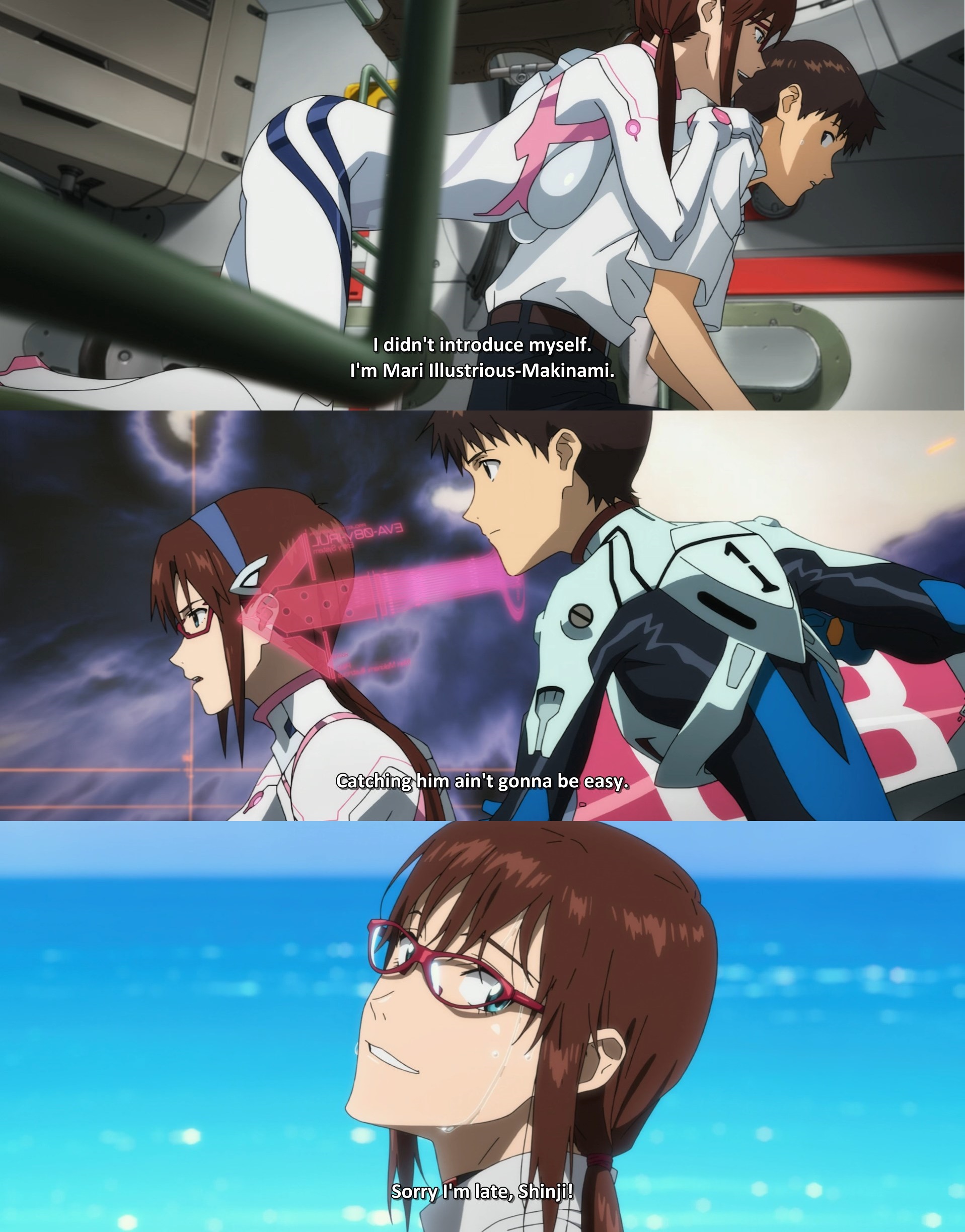 >>284572433>>284572561>>284572605>>284572894>>284573005I know it seems like a mari ending but he doesn't end up with anyone in 3+1. He bids farewell to asuka and rei, then waits for Mari to rescue him. When he meets Mari in the train station he isn't in reality - it's still part of the imaginary space. He still has the exploding choker on. It's not a time skip, flash forward, or universe reset. Him leaving with mari is just them going back to reality, to the earth he explicitly stated he wouldn't change or reboot. As for greeting her by saying 'its a gorgeous gal with big boobs' he's demonstrating that he has confidence to meet other people halfway and is telling her what she wants to hear. She's the weirdo who likes talking about her boobs constantly, that kind of line comprises half her scenes. I know it's convoluted and autistic but that's the way it is.