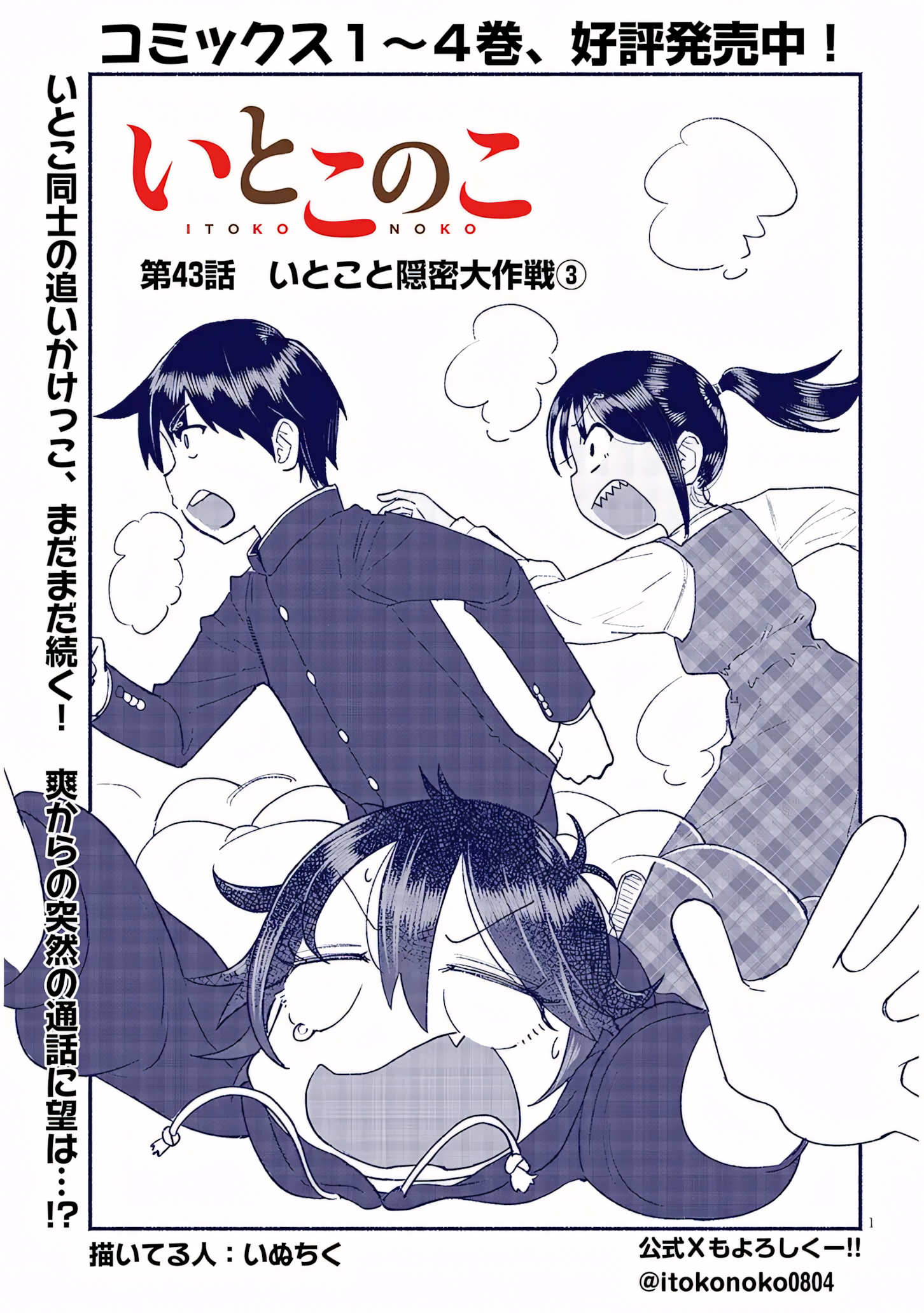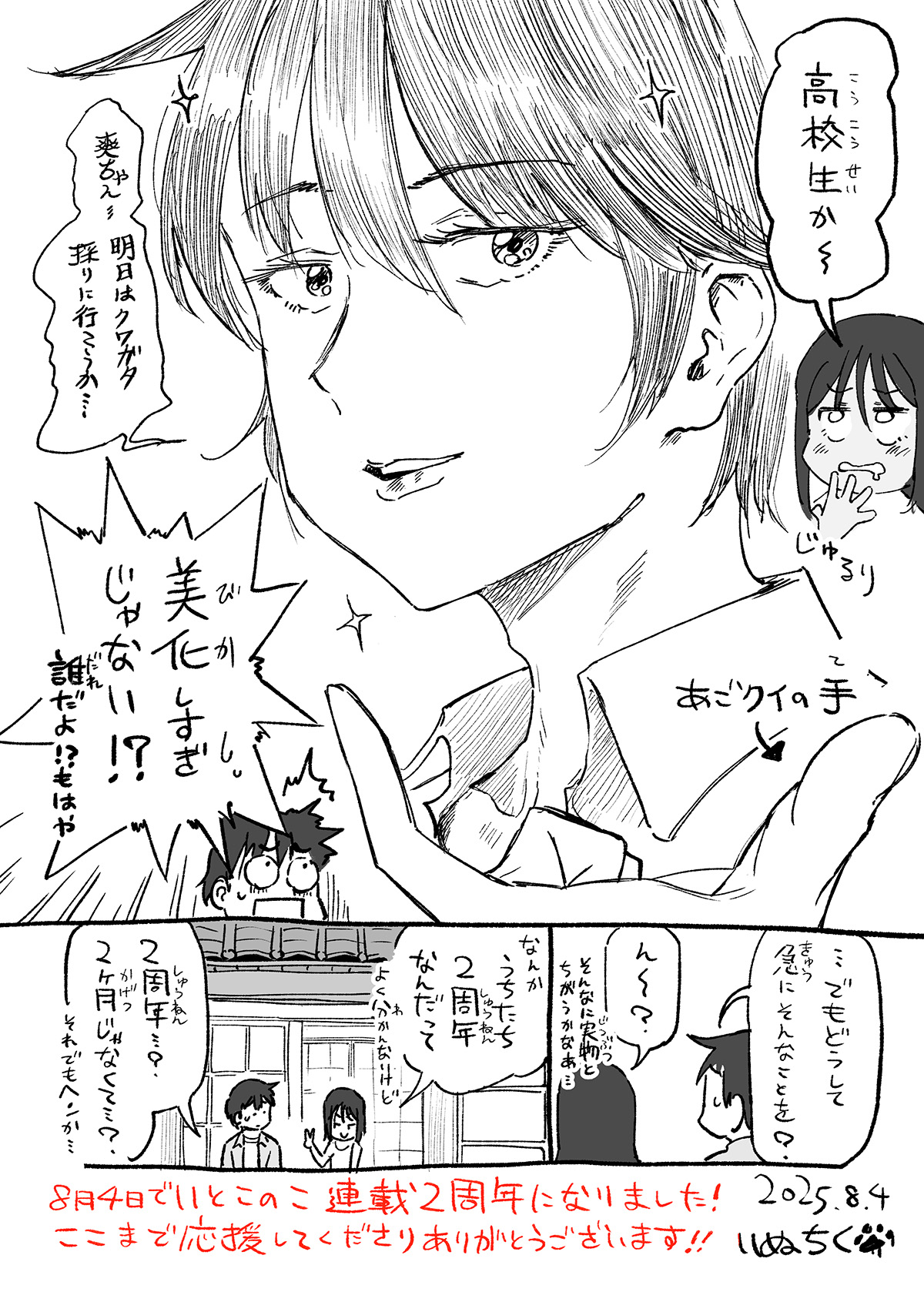 A high schooler~[sfx by sou] Slurp [she's drooling at the prospect of high school Nozomu.Sou-chan...Shall we go stag beetle hunting tomorrow? [fancier, cursive-ier font on these two][by arrow] Chin-lifting hand [google for agokui]You've beautified me too much!![smaller] It's like, who's that!?...anyway, where did this come from, all of a sudden?Hmm~?[text outside] Was it that different from reality?It's just that it's our second anniversary.[small] Though I don't get it either.Second anniversary...? I've only been here for two months...?[small] Even then that sounds weird...August 4th is Itoko no Ko's serialization's 2nd anniversary!Thank you for supporting me this far!! Inuchiku ---I think that should be everything.There's a couple of those special book store exclusive leaflets that we translated from chinese that have been posted on the twitter, but the translations are probably fine if I had to guess.