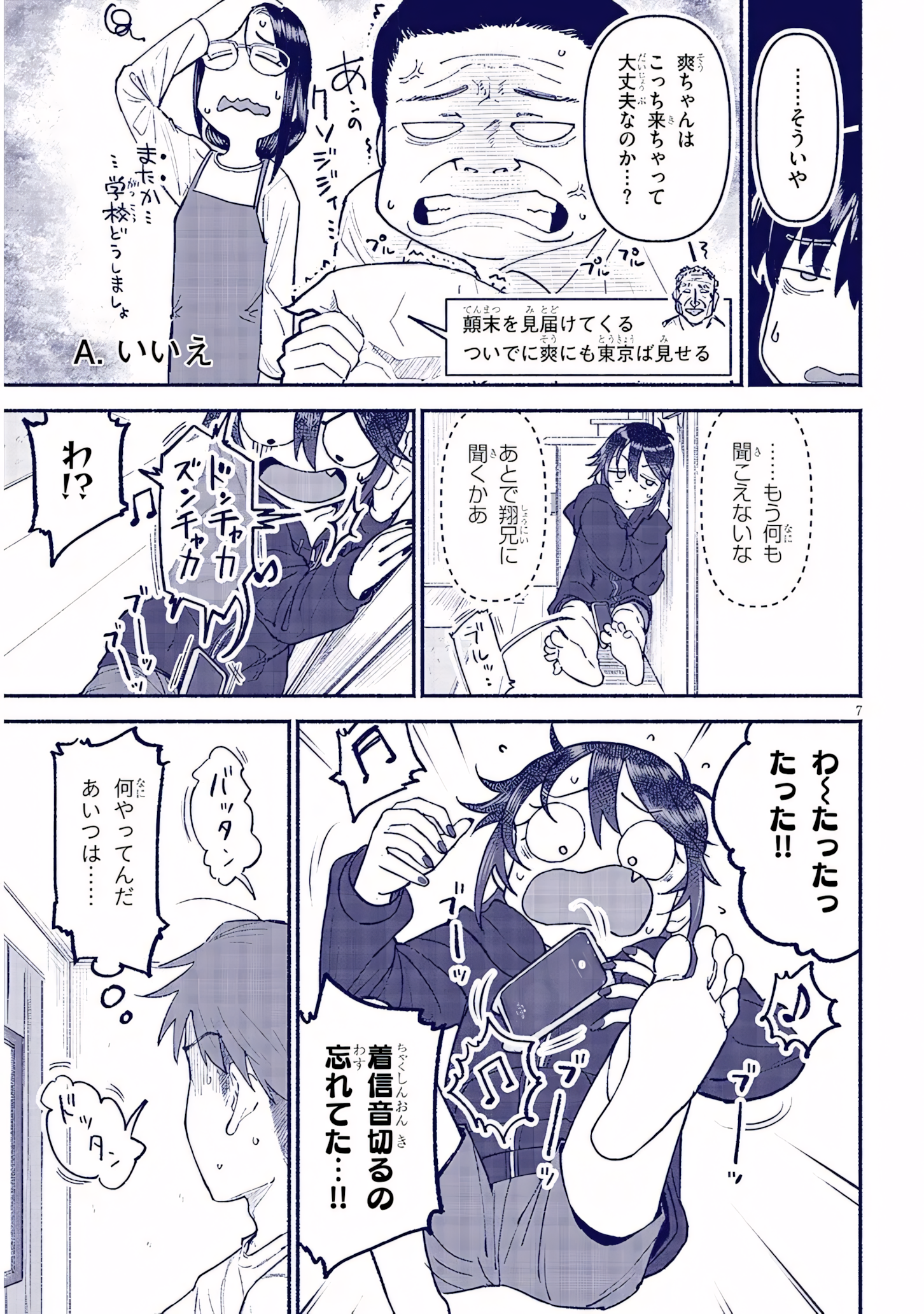 >>2846163027:…Thinking on it.I wonder if it was okay for Sou-chan to come here too…?[grandpa letter] I'm going to see how things turn out. I’ll take the chance to show Tokyo to Sou while we're there.[sfx around uncle] Shake, shake[text by uncle’s left] That asshole…[by aunt] Again… What about school?Answer: No, it wasn’t.…I can’t hear anything anymore.I’ll ask Shou-nii what happened later.[sfx] Vrrr[ringtone] DONCHAKA ZUNCHAKA [just generic loud music]Wah!?A-wah-wah-wah!!![sfx around her] VrrrI forgot to put it in silent…!![sfx] slam, bonk, flailing around etcWhat is she doing…