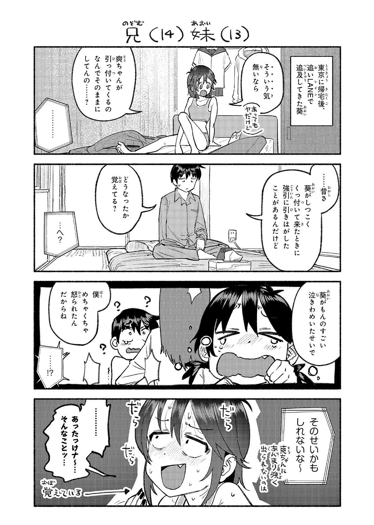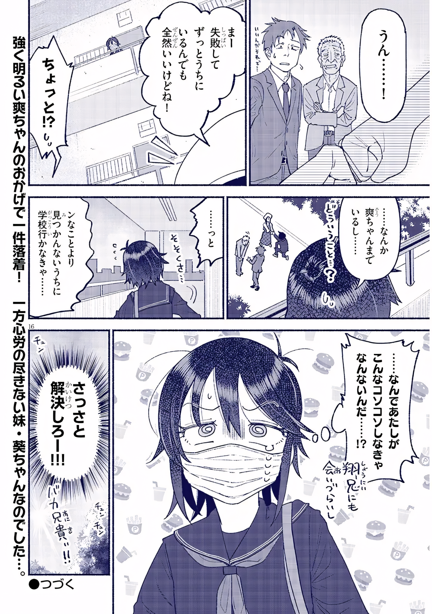 >>28461644816:Yeah…![by shou-nii] Wait, they agreed just like that?But even if you fail, you can always live together with us forever, so it’s fine!Hey!?…Looks like even Sou-chan’s here now…[outside] What is even going on?…Anyway.[sfx] Stepping outI should probably leave for school now before anyone sees me……why do *I* have to sneak around like this…!?[small] And it’s hard to see Shou-nii.[sfx around pane] bird chirpsFigure this out already!!!Dumb brother!!---I love Aoi now, she's sacrificing so much just so her onii-chan gets his revenge and cute cousin. An unsung hero of this manga.
