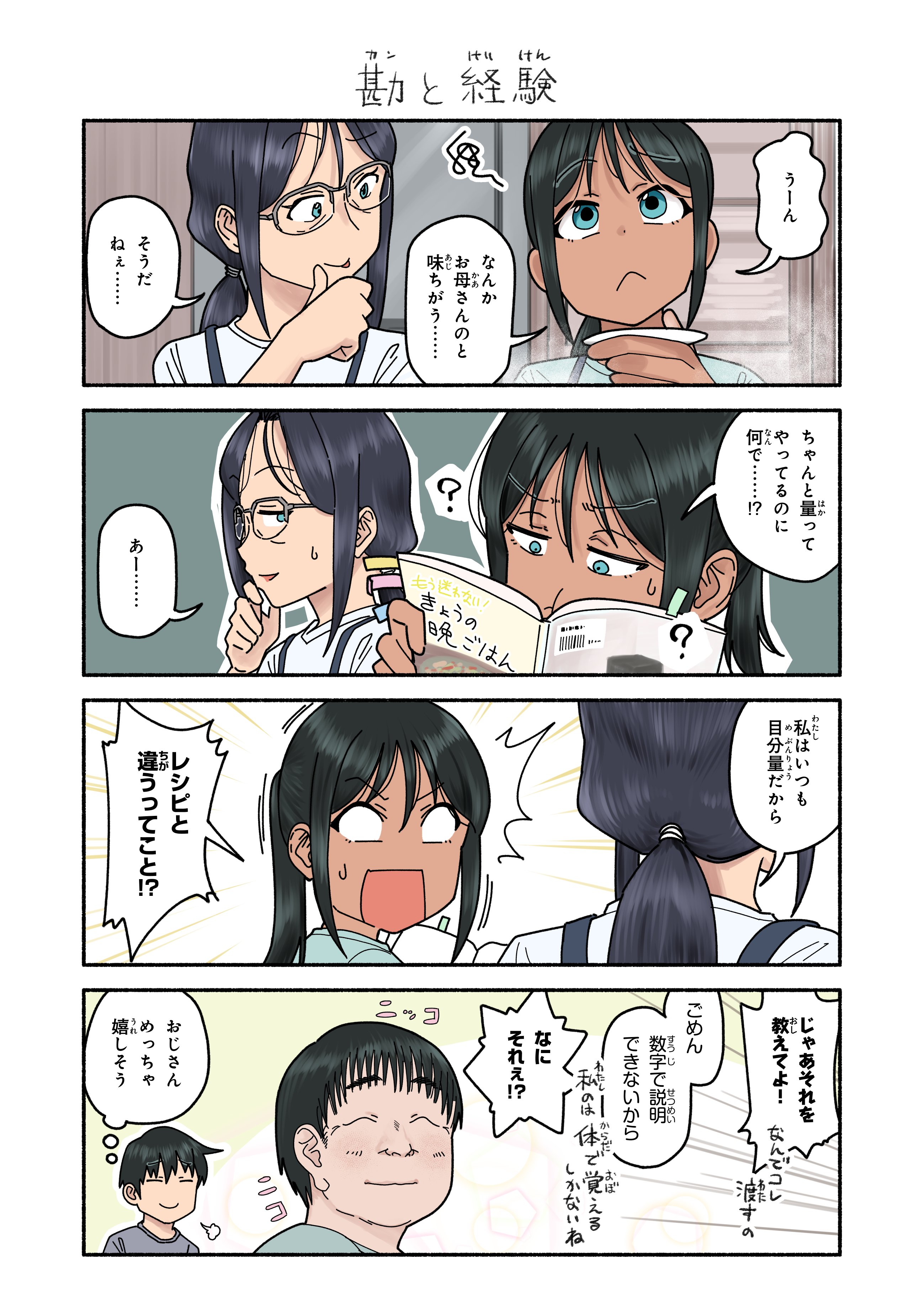 >>284616496Intuition and ExperienceHmm…It’s not quite the same as yours, mom…Yeah, it isn’t…I made sure to follow the recipe, so why…!?[on book, yellow] Waver no more![book, black] Today’s dinnerAh…I always eyeball the quantities.You don’t follow the recipe!?Then, teach me how you do it![small] Why did you even give me this book!Sorry, it’s not something that can be explained with numbers.[small] It’s basically muscle memory for me.What’s with that!?[sfx by uncle] Smile, smileUncle seems to be enjoying this.