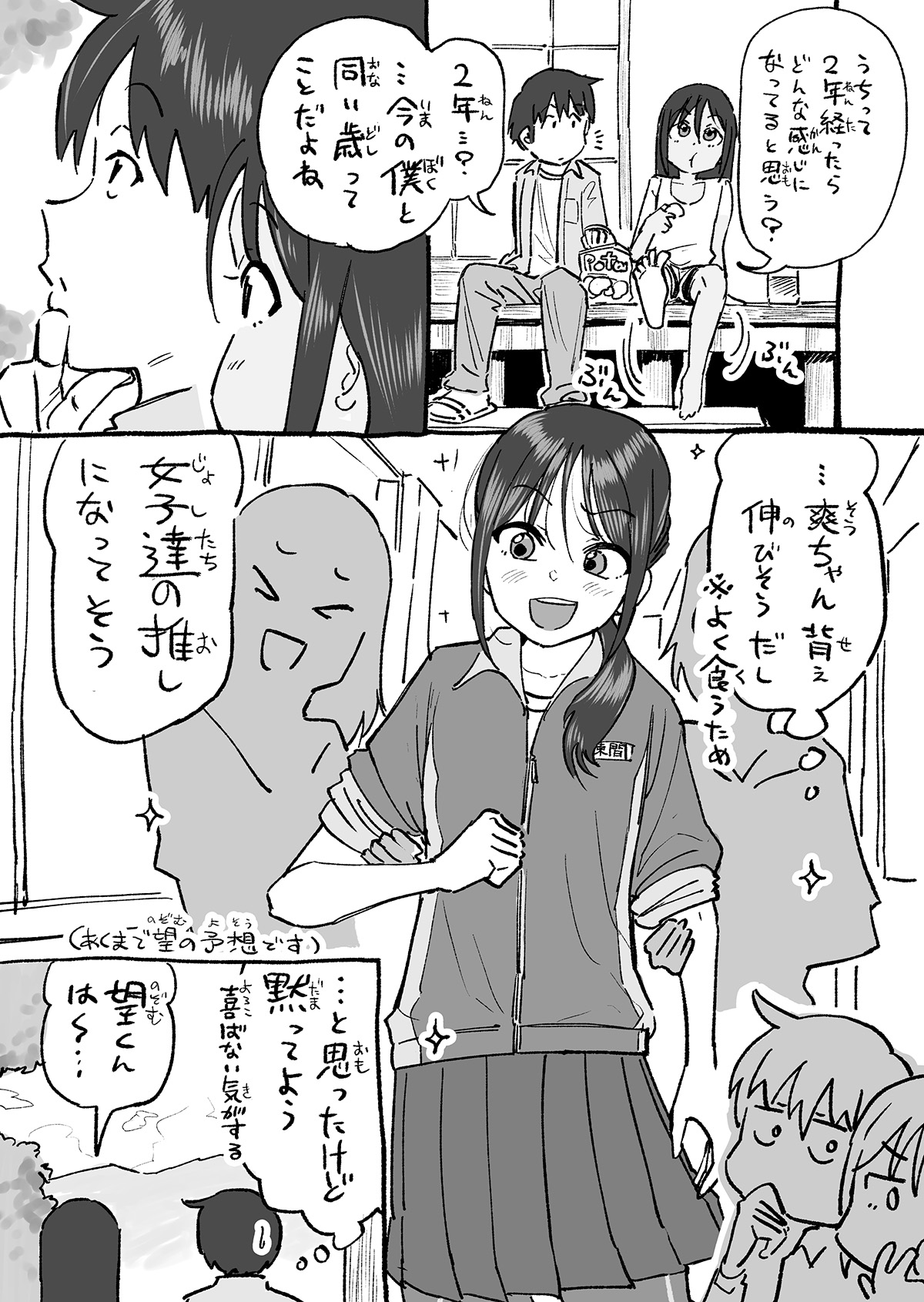couple of pages that haven't been typeset yet---1:What do you think we'll be like in two years?[sfx] Foot flappingTwo years...? ...You'll be the same age I am now......Sou-chan will probably grow up tall.*Because she eats well.She'll probably be really popular with the girls too.(This is merely Nozomu's expectation.)...is what I think, but I won't say that out loud.[smaller] I doubt she'd be happy.Nozomu-kun will be...