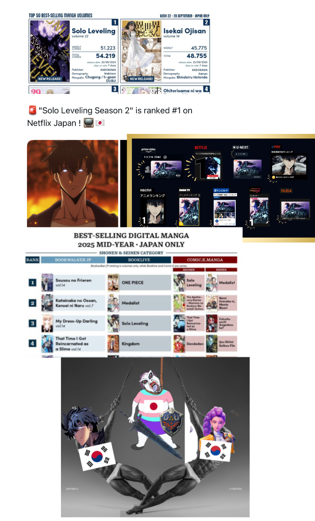 >>284620790>I heard that solo leveling sold lots of merches, BDs and books in Japan and became social phenomenon in JapanLiterally the opposite, lmaoIt's not popular in Japan at all, nor most of Asia actually