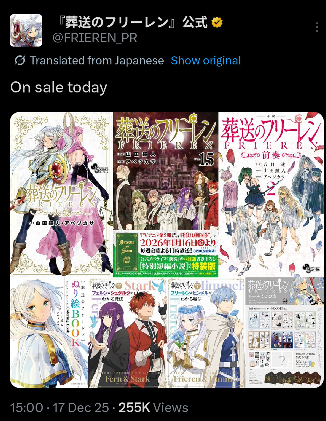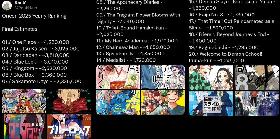 >>28462346Anon, Frieren only released a single volume this year and still did 1.4m (in Japan only)The size of the Frieren readership is one of the highest out of any manga still publishing. Per volume, One Piece outsells it, SpyxFamily and Kingdom about the same but aside from those there is little else that comes close