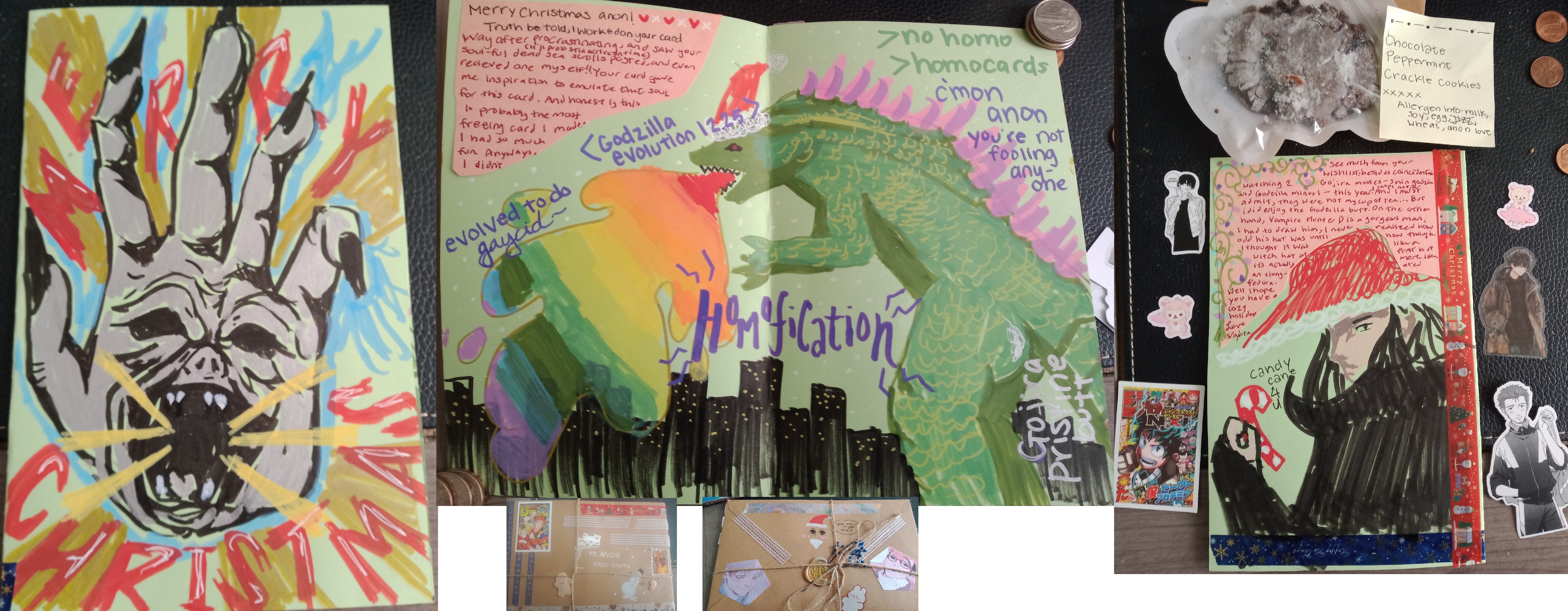 An hour ago, I received this absolutely wonderful card from Terumob of CA! I can't believe how great it is. I have been enormously blessed this year by my lovely anons. Any one of these drawings are individually better than the entire card I sent you this year! And there's three of them! I knew once I saw ole Left Hand sucking me in that I was in for a treat. Your Godzilla is very lovely and what a terrible shame Tokyo is completely homosexual now. Two nukes too many, I say! D is very handsome. In regards to Godzilla, I personally prefer the vs. movies where he fights another monster. But kaiju autism is perhaps an acquired taste. Like Koreanshit. Your message was also tremendously kind. You might have meant to "emulate," but instead you "surpassed" me. In skill, in cheer, and certainly in bein' gay. Bravo! Excellent work! You should be proud. I will cherish it forever. I love you and have a MERRY CHRISTMAS!