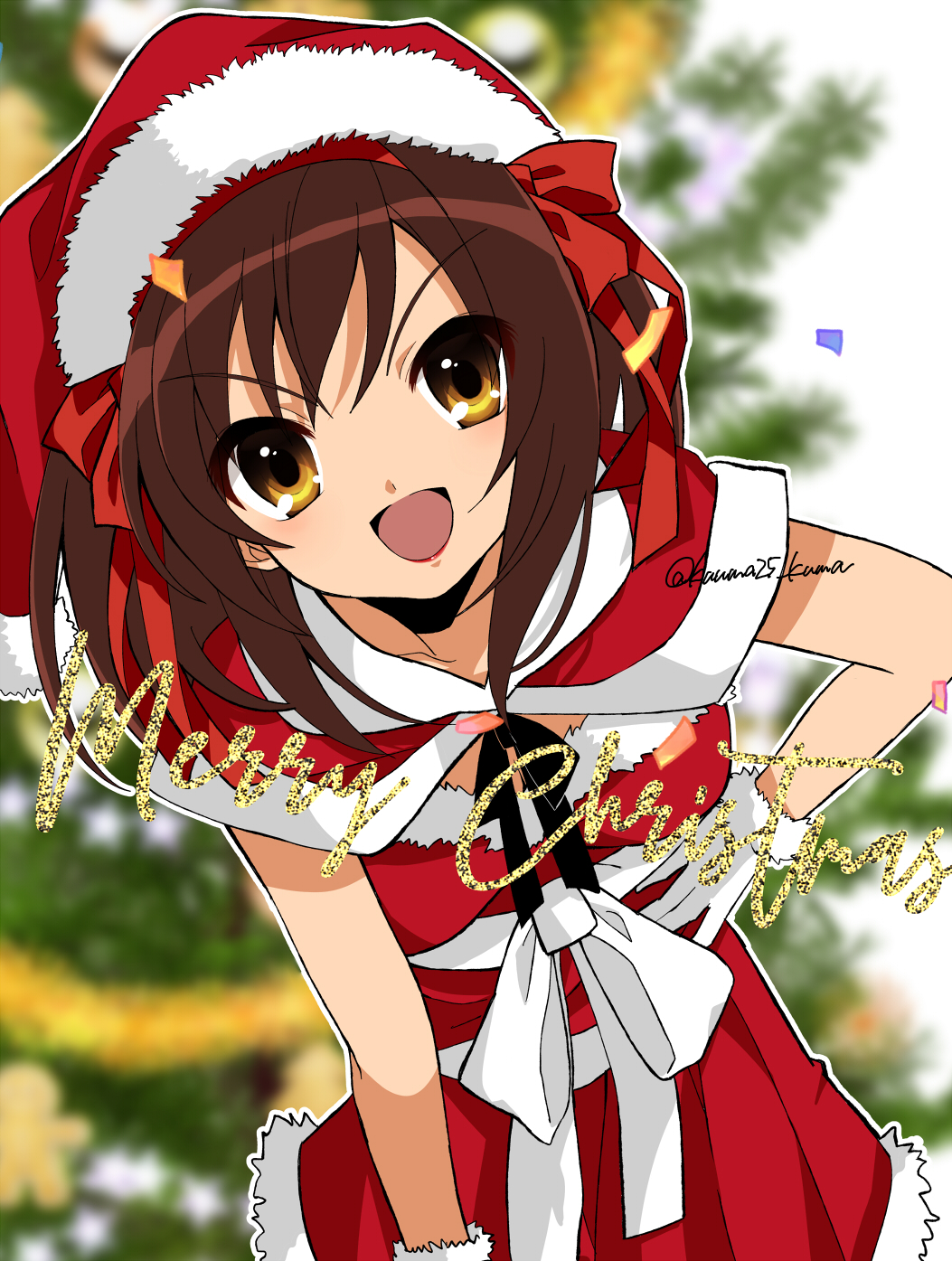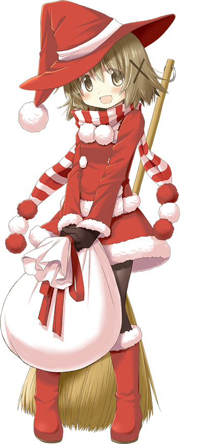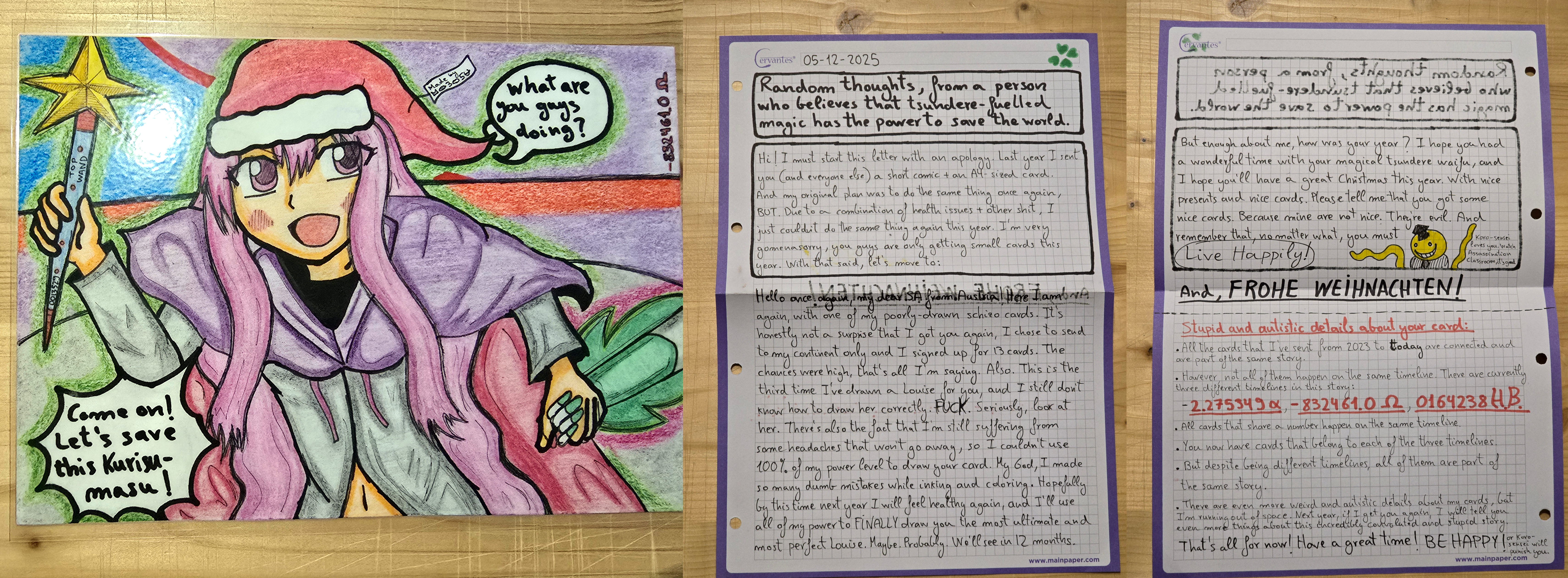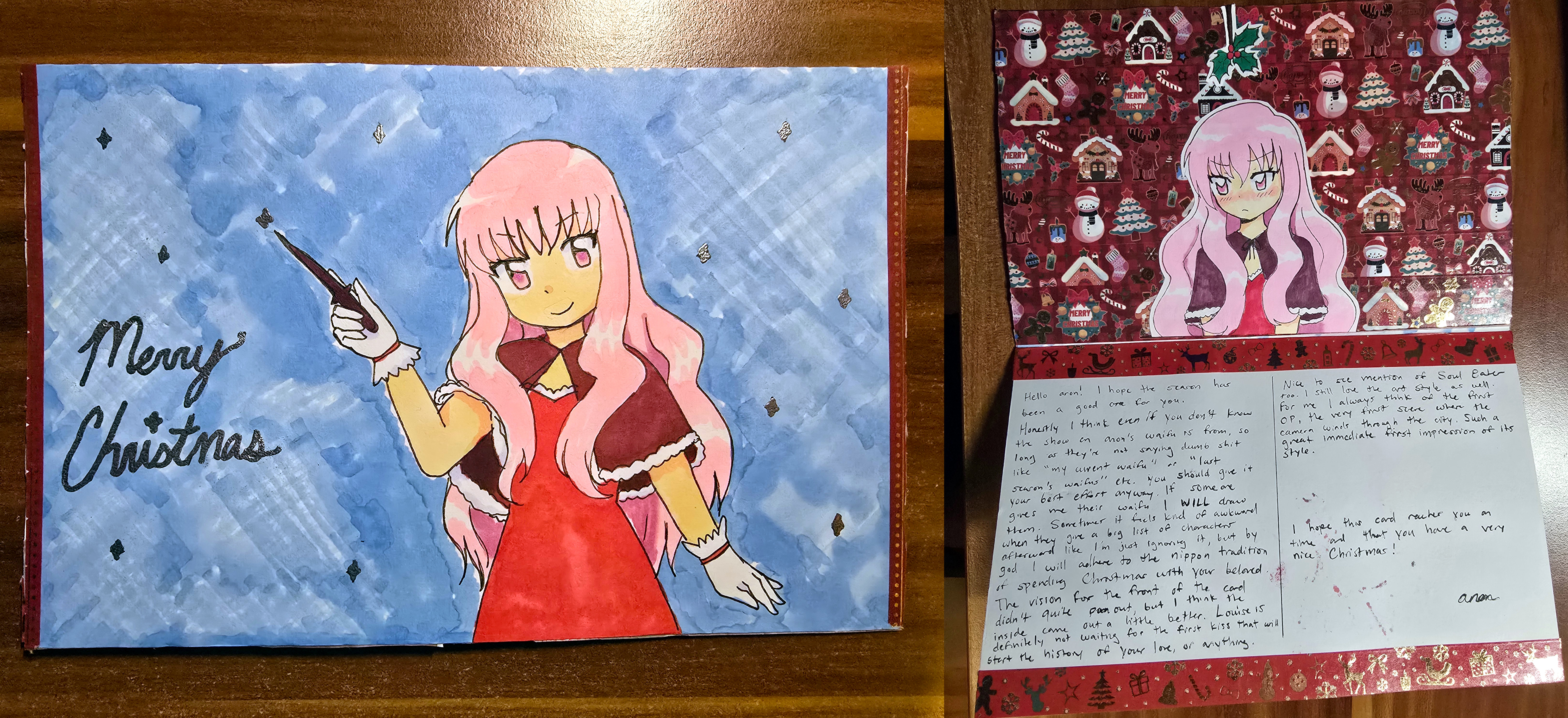 Dear KM from GAThank you so much for this awesome card! Louise on the front is very cute. Is it painted with watercolors? I was always too clumsy for those. The sparkling letters and ornaments look really nice. I really love the drawing inside, the blush and cute outfit are too good! The jolly background is hilarious. Your determination to focus on drawing my waifu is admirable, she really looks like she’s waiting for our date.It’s nice to hear that you enjoy the style of Soul Eater as well. The beginning shot of the OP also always stood out to me, it’s a very creative way of setting the mood.I wish you a Merry Christmas as well!