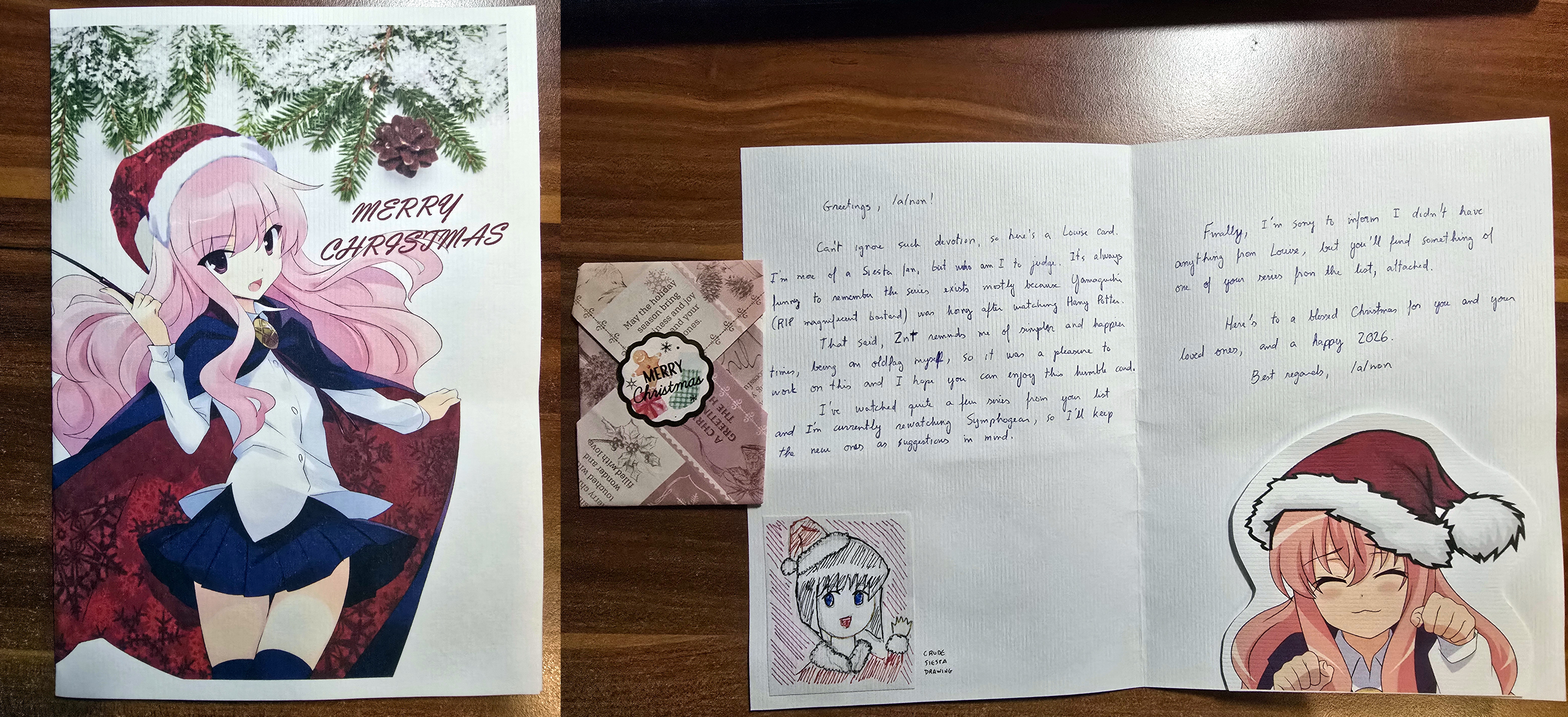 Dear APN from BrazilThank you so much for this great card! The Louise prints are really cute and fit the season. And Siesta is great as well! I’m happy to hear that you enjoyed working on this card. I am also quite curious about the present, I currently put it under my Christmas tree. I hope you’re enjoying your Symphogear rewatch, and that there is something on my list that seems interesting. I’m always glad to get something from an anon that has a similar taste. I wish you a Merry Christmas as well!