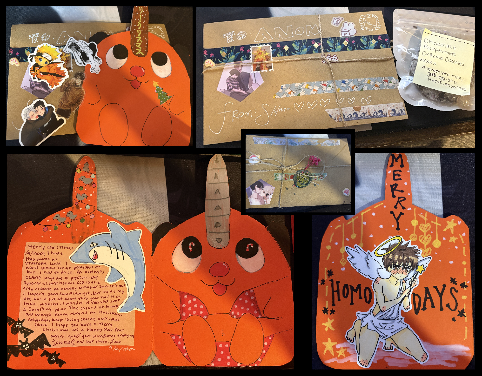 Ty TM from CA! I'm always happy to see your cards on the threads and even more so when I get one for myself! Every inch of your card and envelope is a work of art. Your big Pochita card is so bright and cute! Your shark is very cute and I do like the Halloween/Christmas vibe this card ended up having thanks to the bat corner and ofc the highlight was your beautiful Syaoran drawing! I love your art style, he looks adorable.Hope you see SF one day, it's definitely worth the watch, and I agree, I feel like I saw more SF on lists this year. It's great to see it's still beloved by many.I was starving when I got this card and devoured the cookie right after I took a pic. It was delicious, Ty and Merry Christmas!