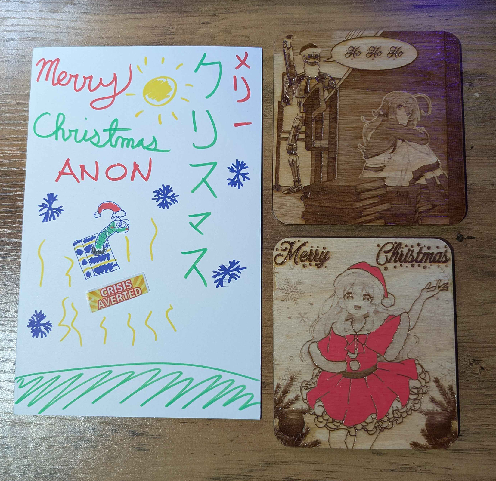 Thank you KN of Canada for the card and coasters!I've tried many times to get into im@s, but I never really managed to get hooked. I did recognize the meme though and thought it was funny. Both coasters are really cute and I'll definitely use them throughout the year. Did you use markers for the color? Its really nice and vibrant.Thank you again and I hope you have a great Christmas!