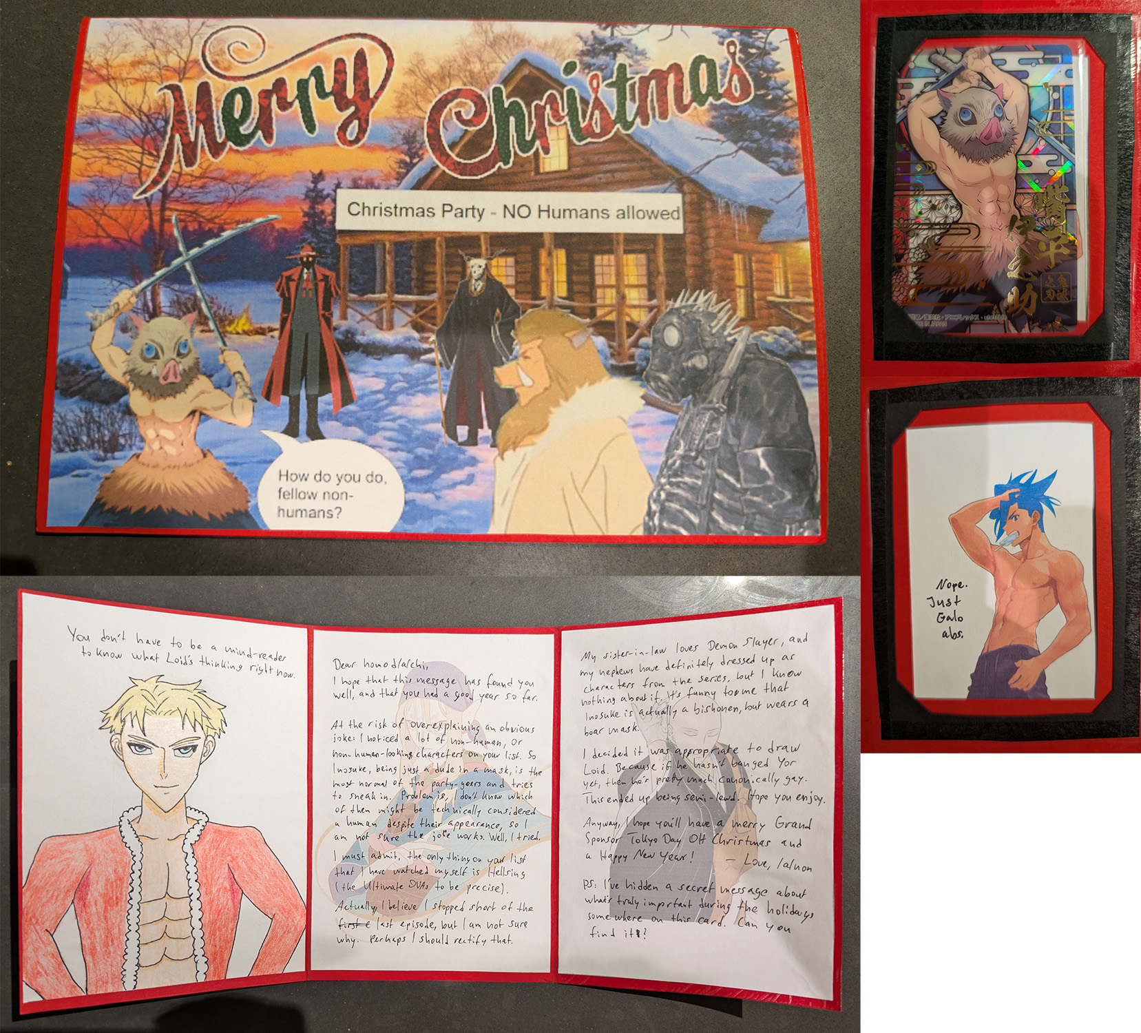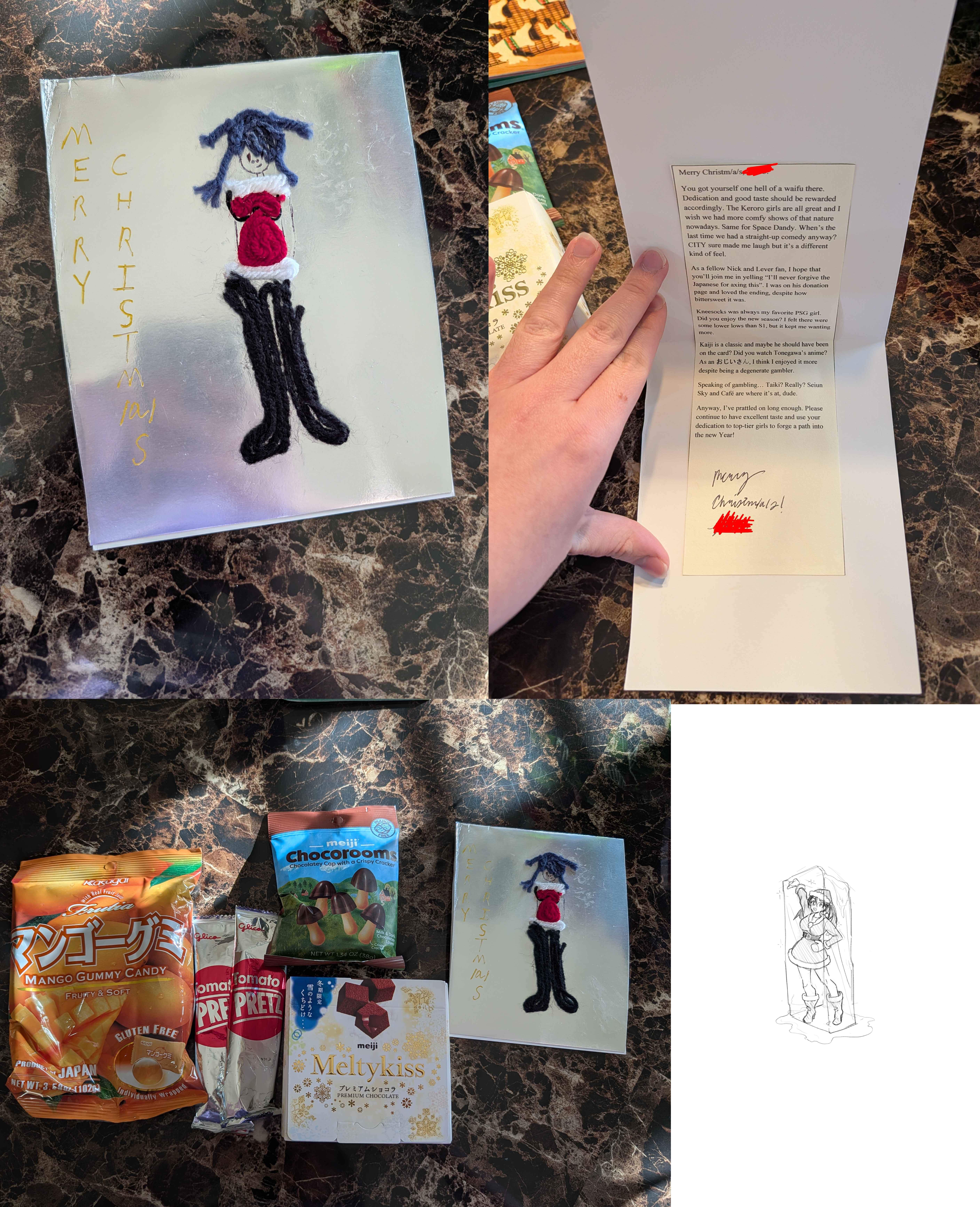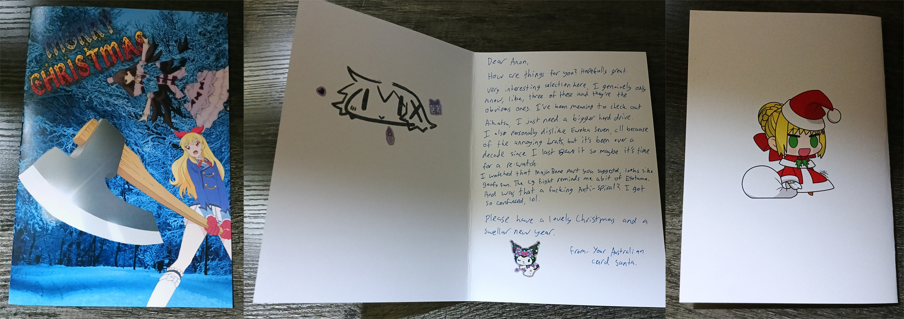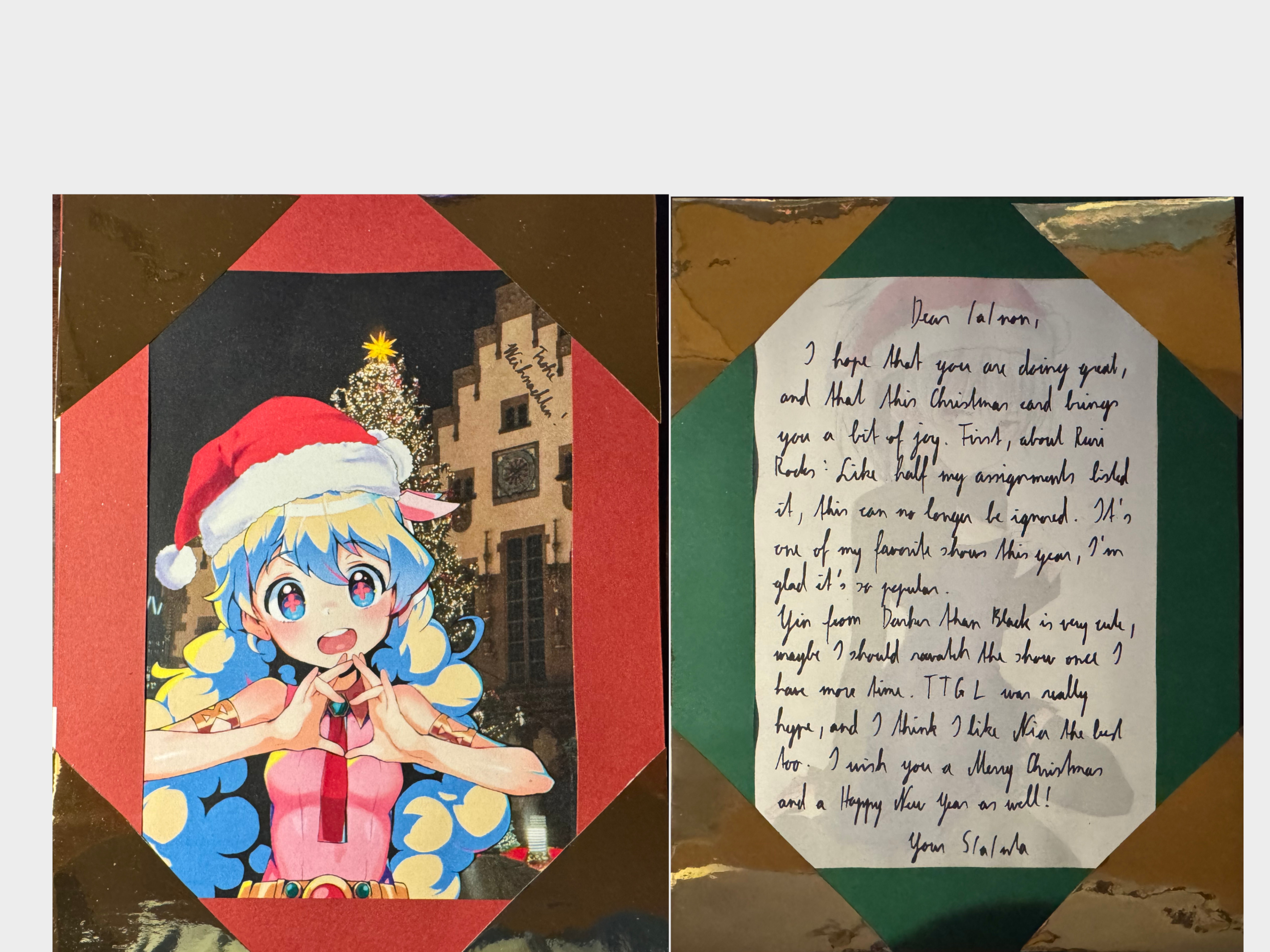 Finally getting to my cards.First off we have SA from Austria with the very cute Nia wearing a santa hat! Also I didn't notice Yin in the background of your card which is very cool! I'm embarassed to admit that I had a hard time reading some of your cursive, specifically on the Ruri Rocks section. Everything else was fine, I hope you get to finish Darker than Black S1 when you have the time! Also its not included in the pic but thank you so much for the chocolates with a whole typed out list of the ingredients, that was funny to me. Merry Christmas/ Happy New Year's Anon!