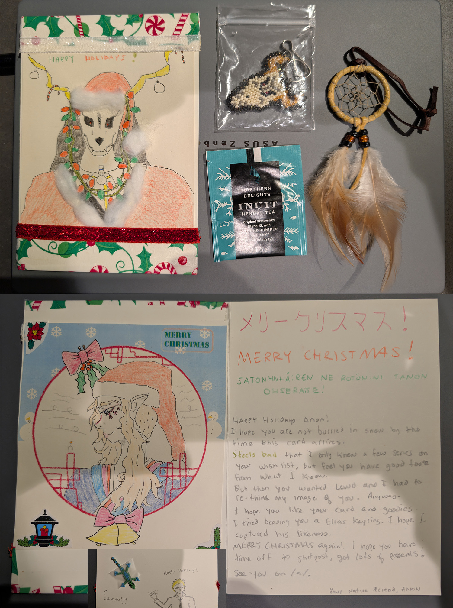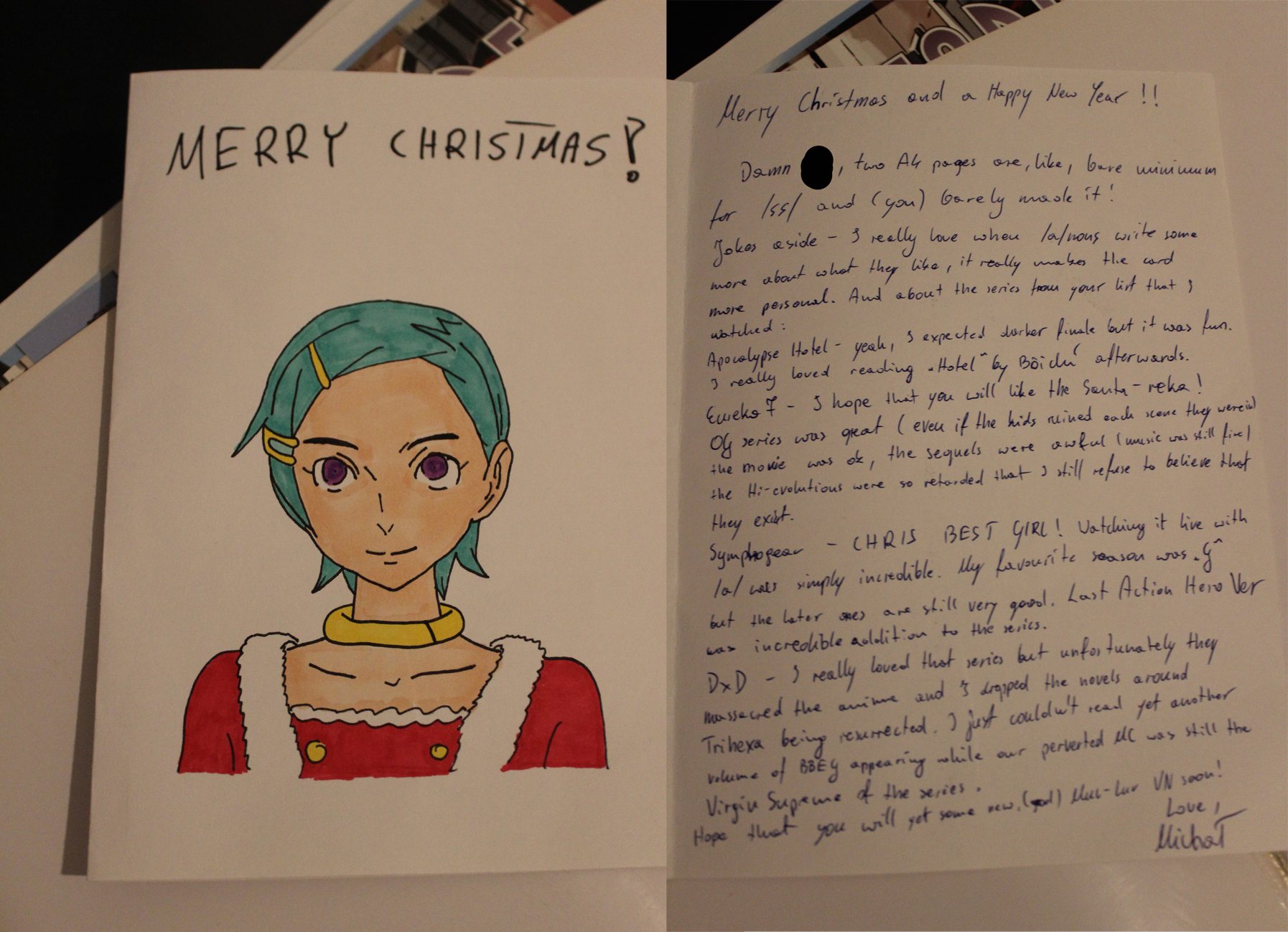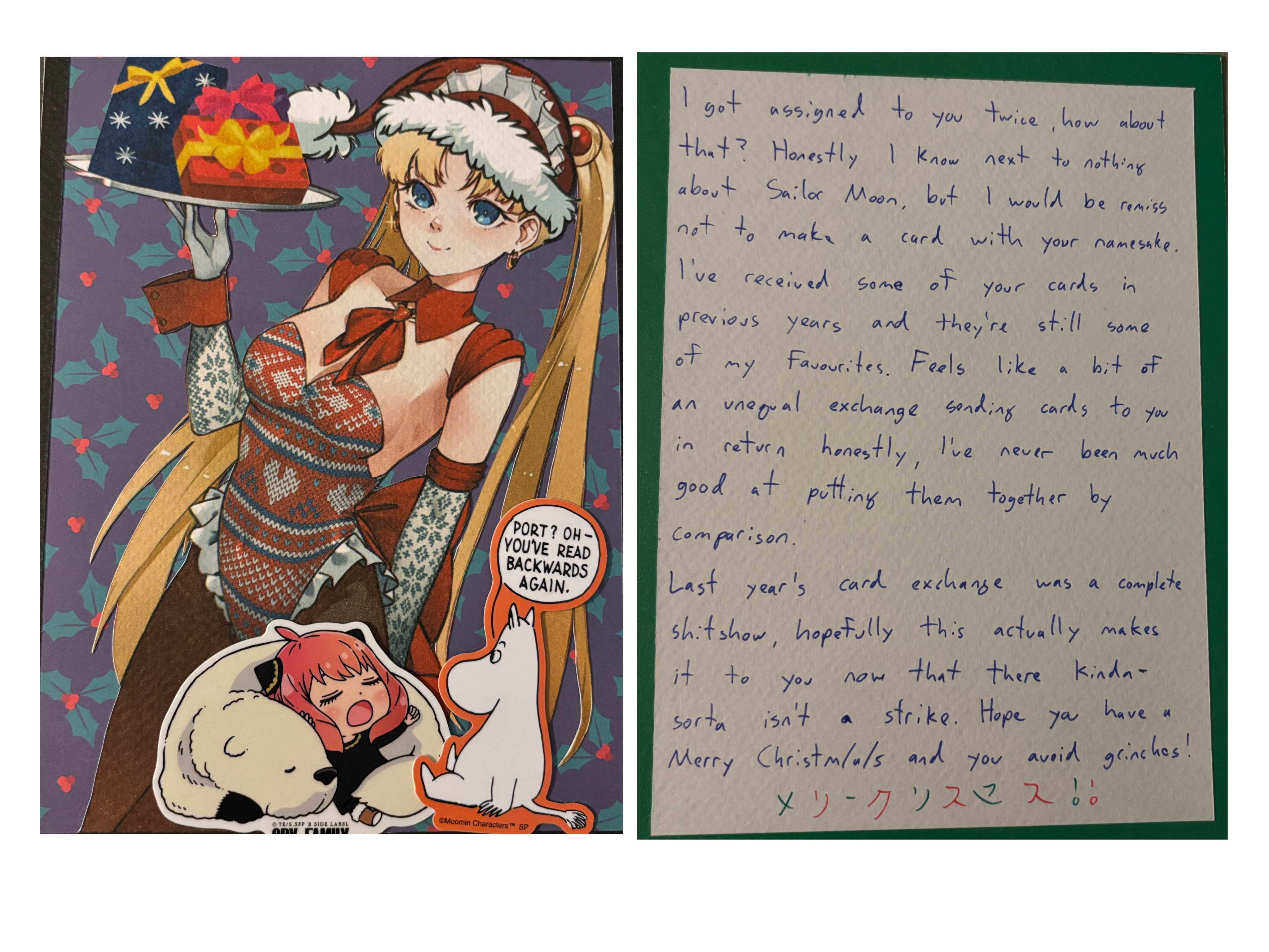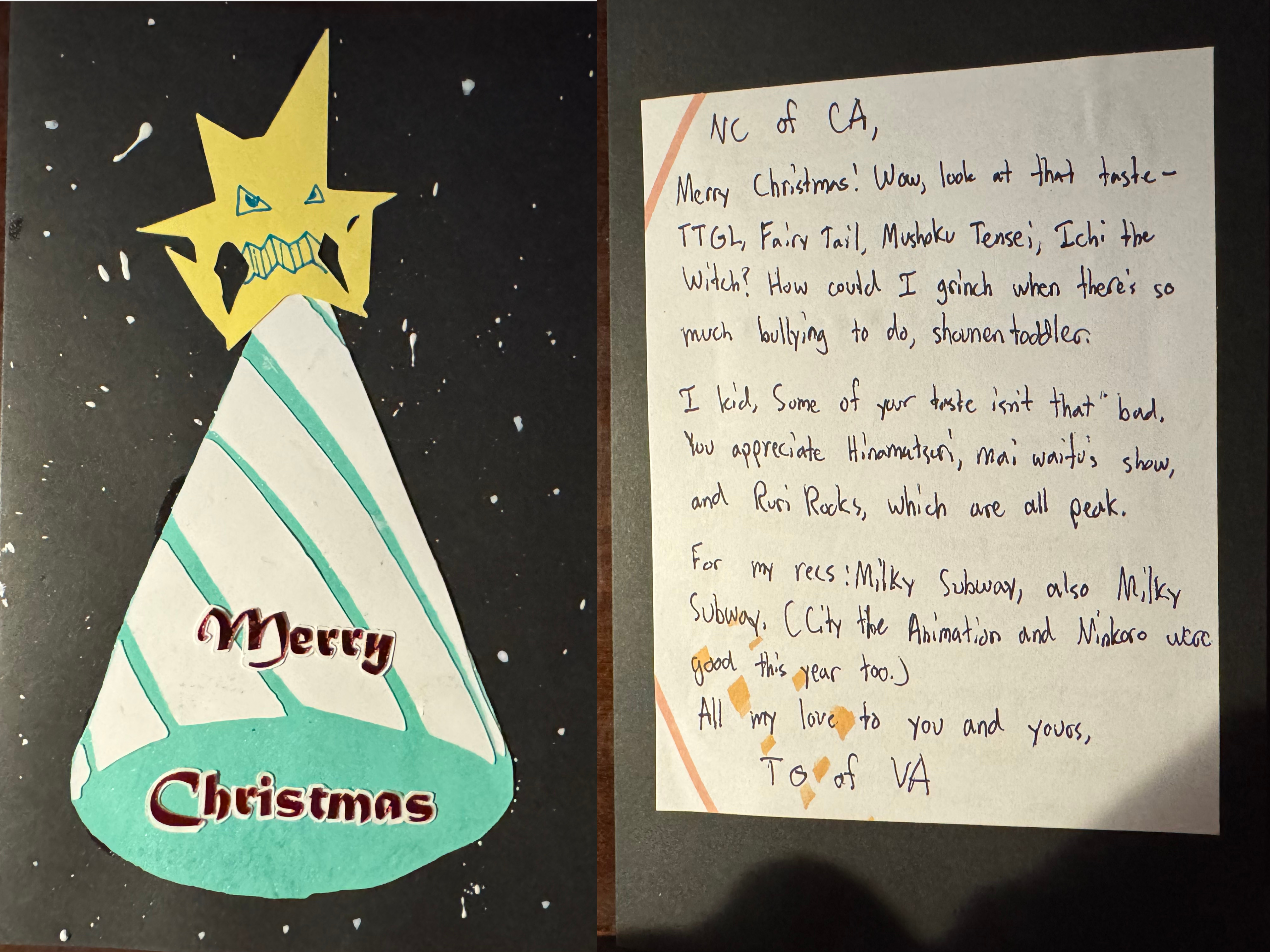 Finally getting to my cards.First off we have SA from Austria with the very cute Nia wearing a santa hat! Also I didn't notice Yin in the background of your card which is very cool! I'm embarassed to admit that I had a hard time reading some of your cursive, specifically on the Ruri Rocks section. Everything else was fine, I hope you get to finish Darker than Black S1 when you have the time! Also its not included in the pic but thank you so much for the chocolates with a whole typed out list of the ingredients, that was funny to me. Merry Christmas/ Happy New Year's Anon!