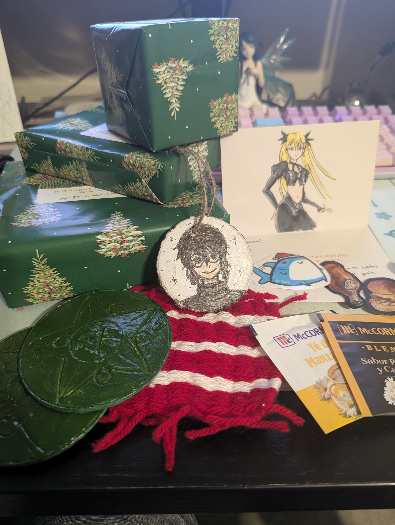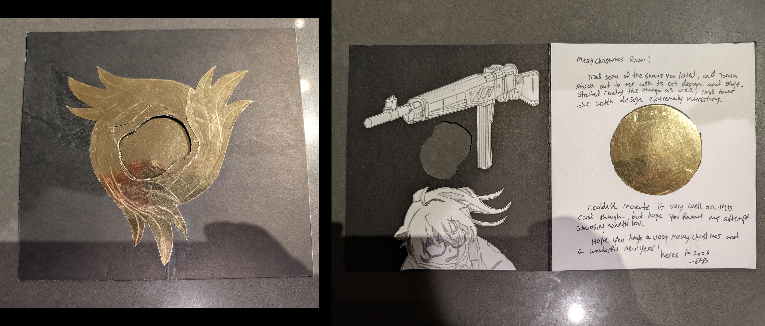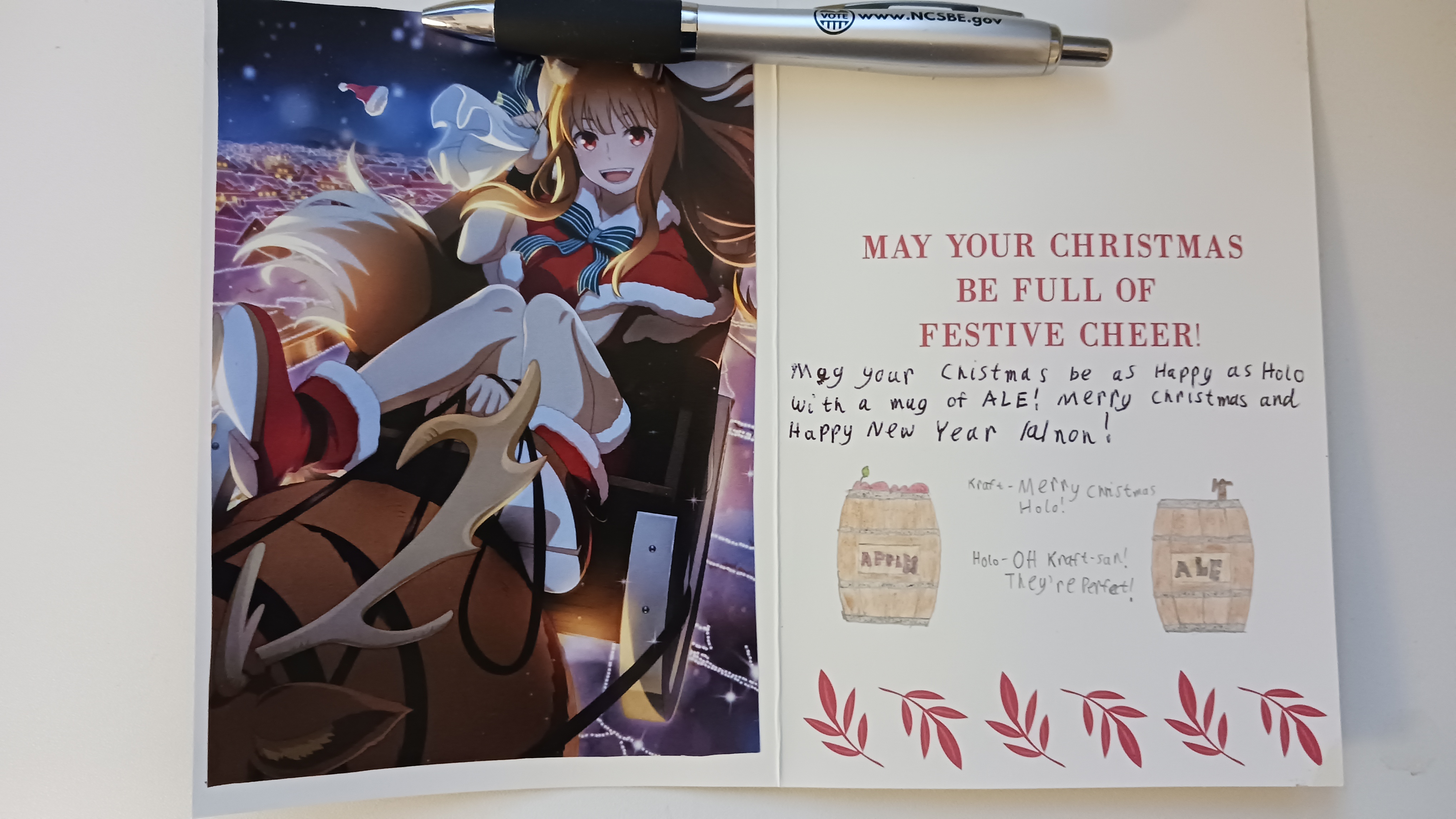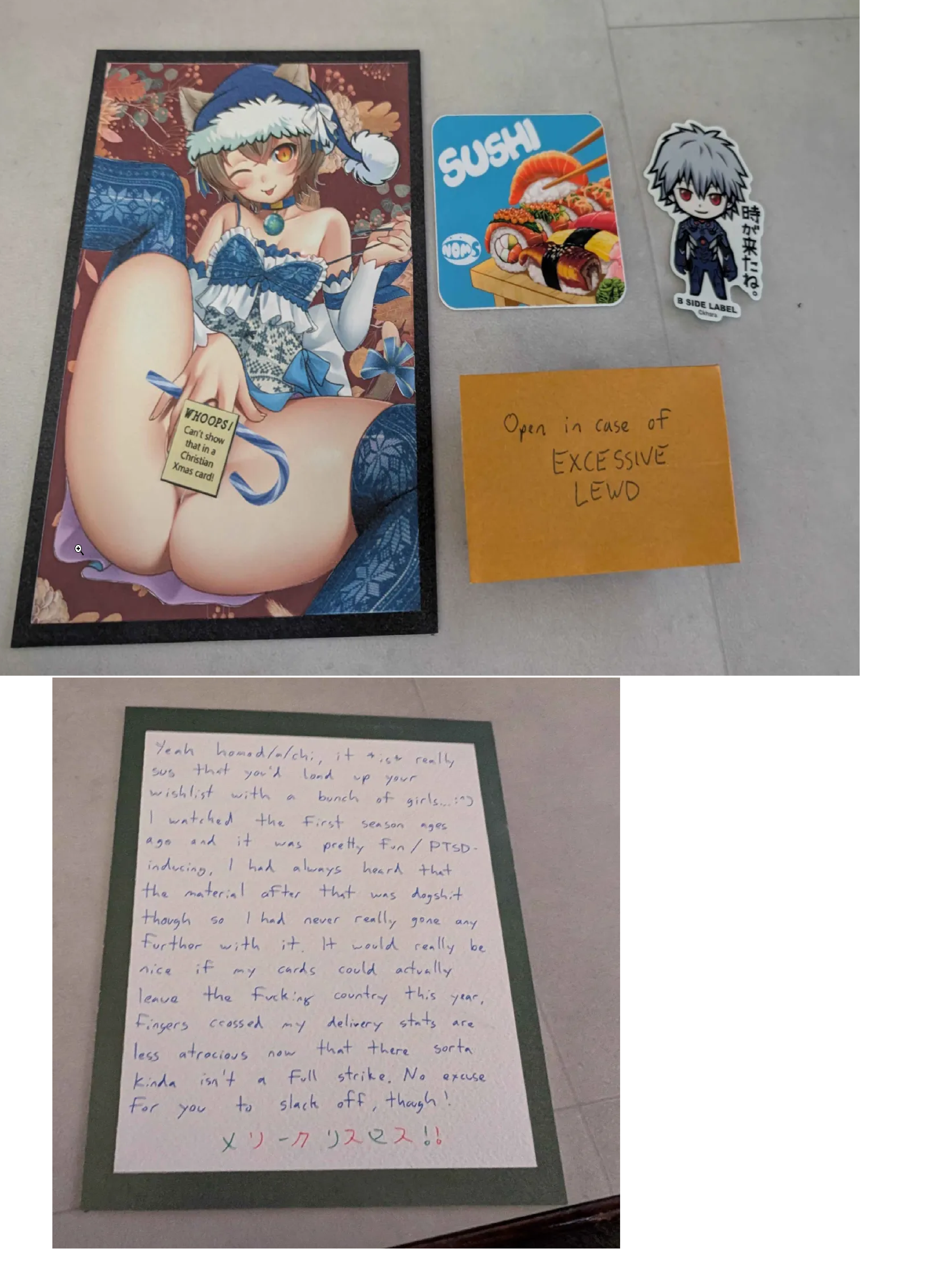 Finally getting to my cards.First off we have SA from Austria with the very cute Nia wearing a santa hat! Also I didn't notice Yin in the background of your card which is very cool! I'm embarassed to admit that I had a hard time reading some of your cursive, specifically on the Ruri Rocks section. Everything else was fine, I hope you get to finish Darker than Black S1 when you have the time! Also its not included in the pic but thank you so much for the chocolates with a whole typed out list of the ingredients, that was funny to me. Merry Christmas/ Happy New Year's Anon!