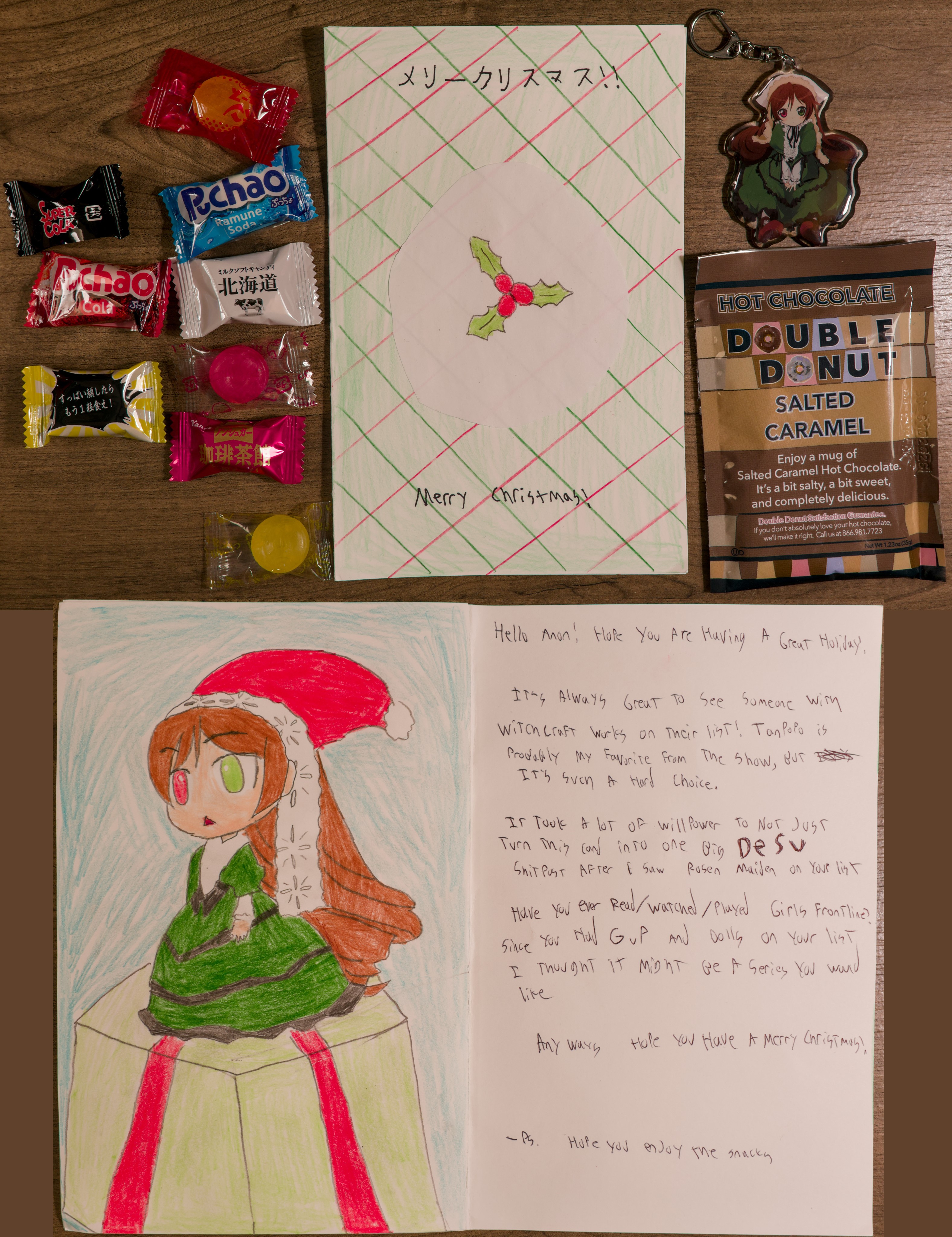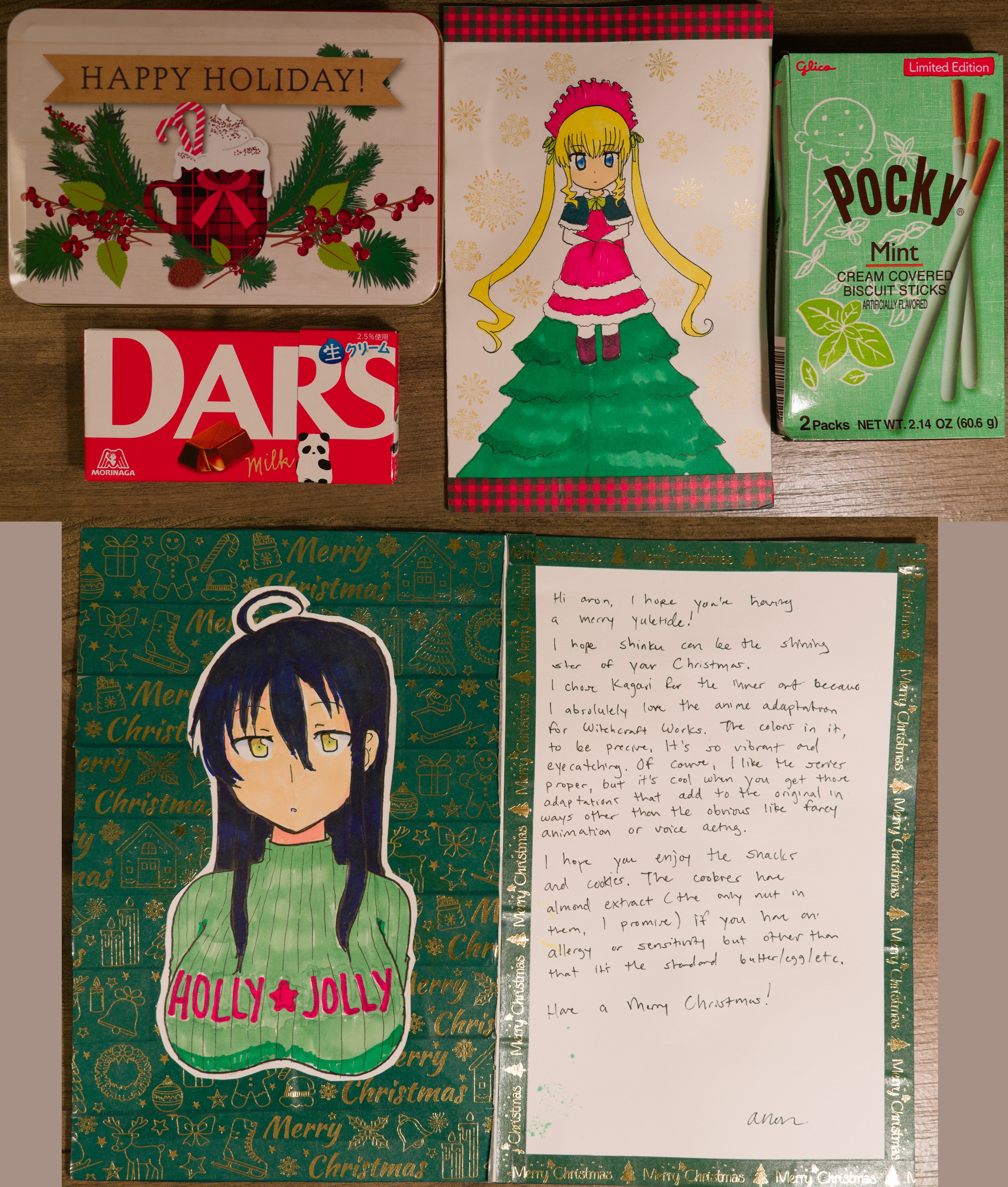 Thank you to Kurisu Masu of GANot pictured: cookies, because I ate them before I took the photo. They were superb.Adorable Shinku. Very nice pouty expression. I didn't expect to see Witchcraft Works! I'm a simple man; the bigger the hat the better the witch. Though there's no hat, Kagari's other large features are on good display here. I agree that the anime stood out with its vibrant colors and strong action sequences, it was a very fun show to watch. I saw that first based on another secret santa anon's recommendations. The manga stood out due to its highly detailed intricate clothing drawings. The amount of lace and detail is insane. I think I also really enjoyed the series since the MC isn't just a completely spineless self-insert character and takes some agency in the series.Thank you for the card and snacks, and I wish you a Merry Christmas!