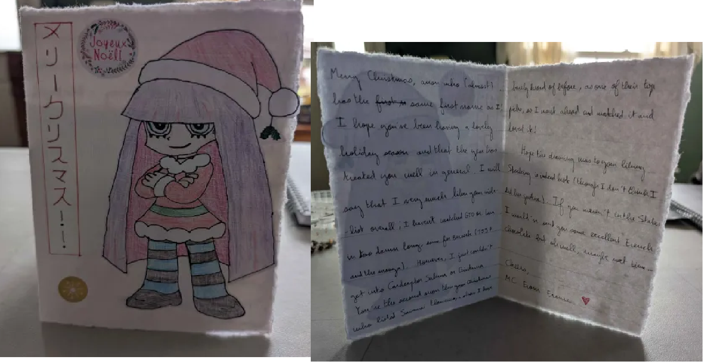 I got a Stocking card from MC from France!This card is really pretty, and I love how it feels. What kind of fabric is this? It feels like paper but it's much fuzzier than paper. Stocking looks super cute, and I love the coloring. Is that crayon or colored pencil? I'm glad you liked my list, and would definitey recommend trying to rewatch CCS if you dropped it early. Gintama though is a slow builder show that takes a very long time to start as it introduces a lot of characters. The first 30 or 40 episodes are basically just intrudicing characters and fleshing them out. After that though I find it to be incredibly funny and good, almost every episode. I'm so thrilled to hear that you enjoyed Samflam. It's underrated and doesn't get talked about enough but its fans are passionate. >If you weren't in the states I would have sent chocolateIs this a tariff thing? Or can you not ship chocolate to the states anymore? Or was it super expensive?Regardless, thank you for the card and Merry Christmas!