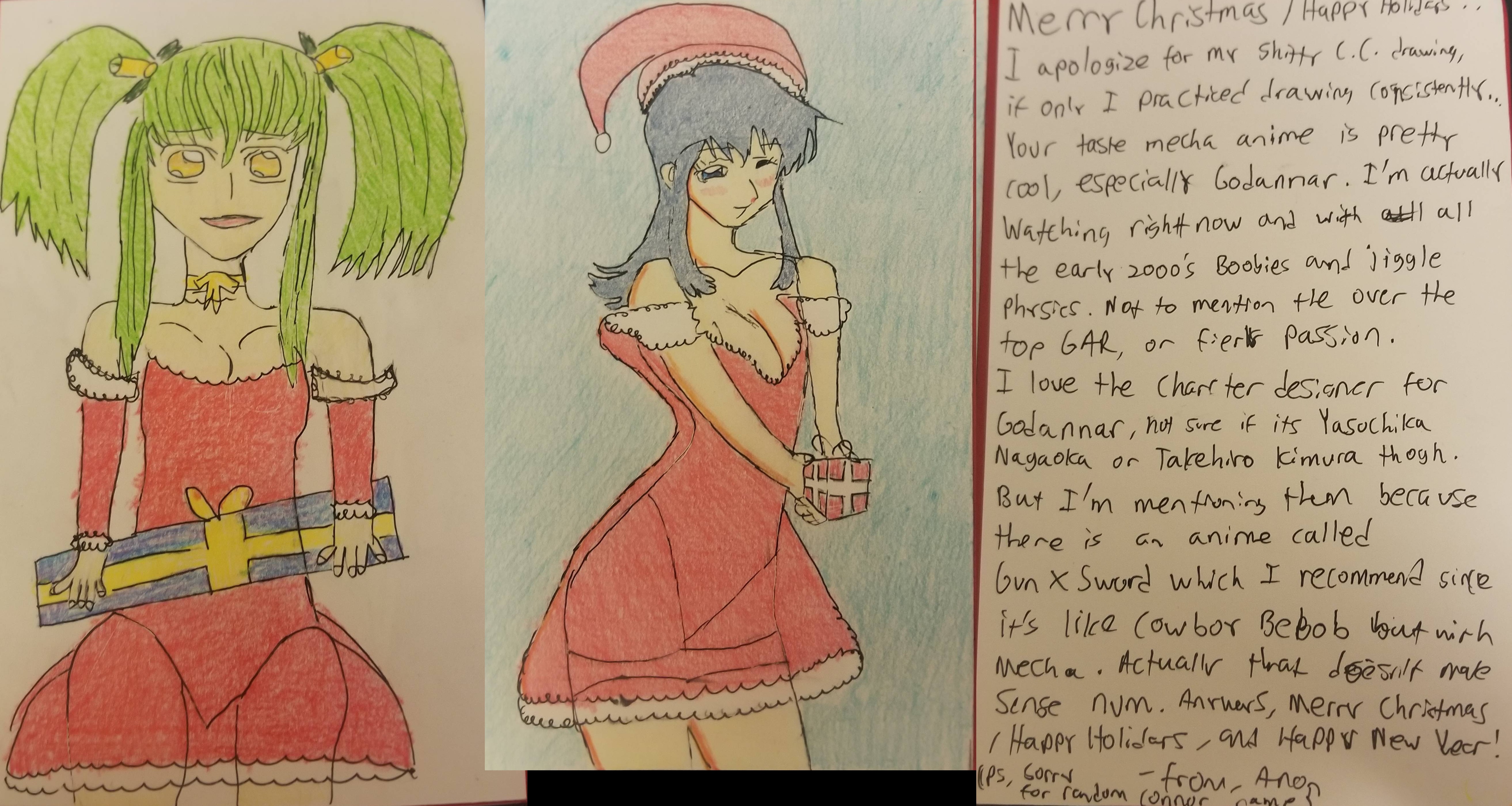 >>284628575I’m glad you liked the card! While Tokyo may have banned gayness, it’s a Christmas miracle Godzilla restored balance to the progenitors of yaoi. I am still so shocked at how the hand turned out because I completely free handed that shit and prayed it turned out decent, and if not, it will at least have soul. Your card was the blueprint. Maybe I should check out the vs. movies, tournament arcs were always my favorite trope. But anyways Merry Christmas!>>284629703I also love seeing your cards in thread and receiving your cards. I feel like we have been matching one way or the other for the past few years hahah. Good to know you’re still loving sharks. Your picture of syaoran makes the drawing look much nicer and sharper than I remember drawing him. I will definitely watch SF soon. I’m glad you liked the cookies. I tried it before and instantly fell in love with it and had to share the joy! Merry Christmas!