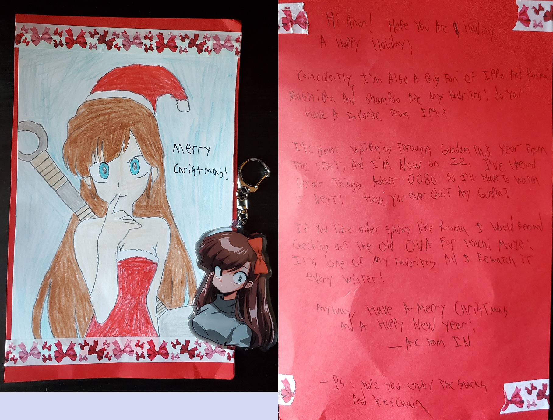 >>284663570Card #2, AC from INWhat's up man! Glad to see you again too! Your drawing of Inami punching the grinch was pretty funny. That's cool that you started to watch Gundam, out of the 22 shows which one is your favorite? Also I have only partially finished my RG Nu Gundam gunpla, need to get back on it.I will also watch Needless someday it's on my backlog. I am not an avid fan of the Ramen Rider franchise(Not that I hate it, I just haven't seen it before), the Kamen Rider anime that's on this season is my first introduction into the series. Glad you're enjoying it by watching it from the very beginning.Anyways, Merry Christmas / Happy New Year's AC! P.S. thank you so much for the Inami keychain, I put it and the Nia keychain you gave last year on my tenor sax's zipper pull tag case.