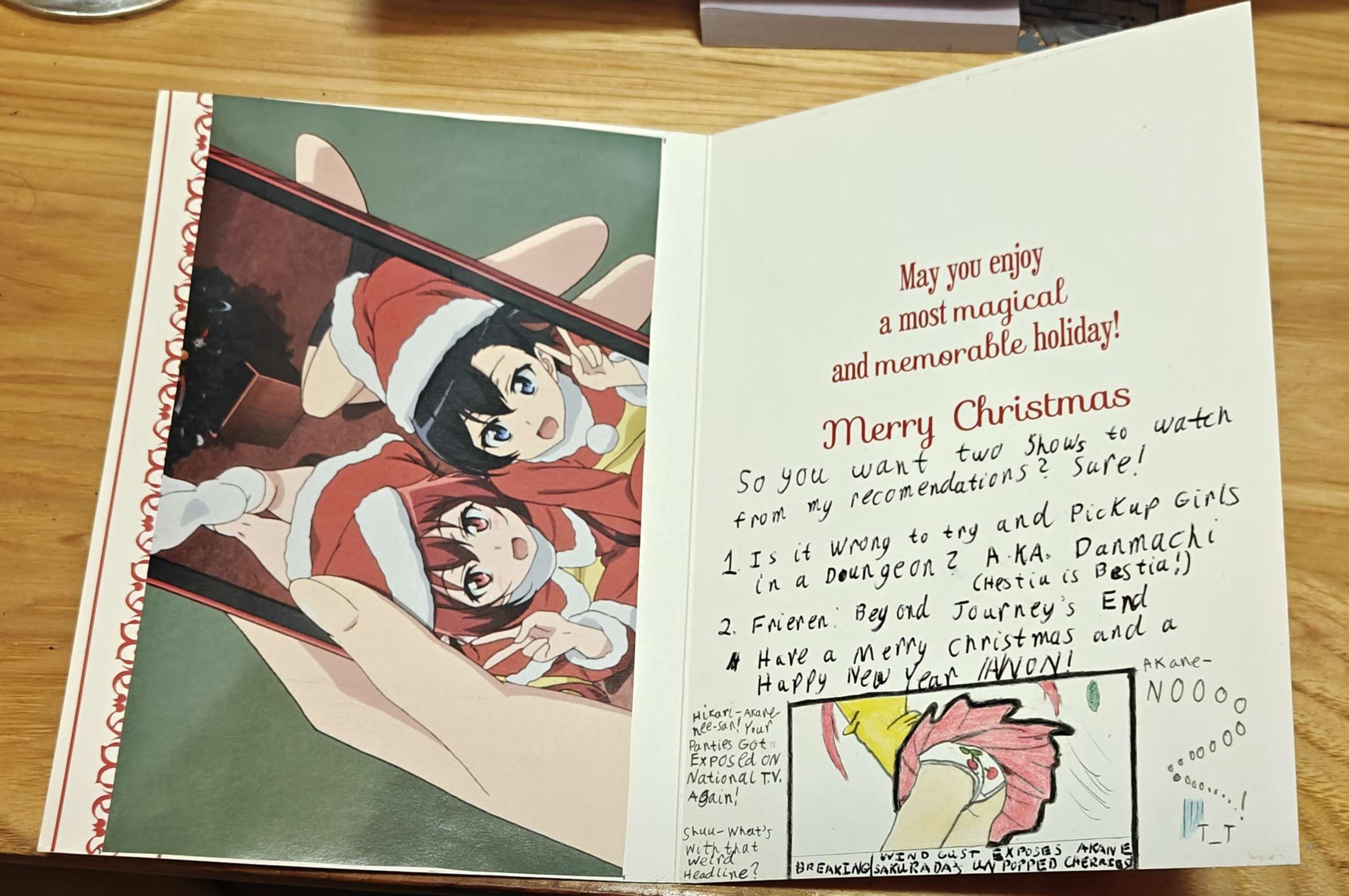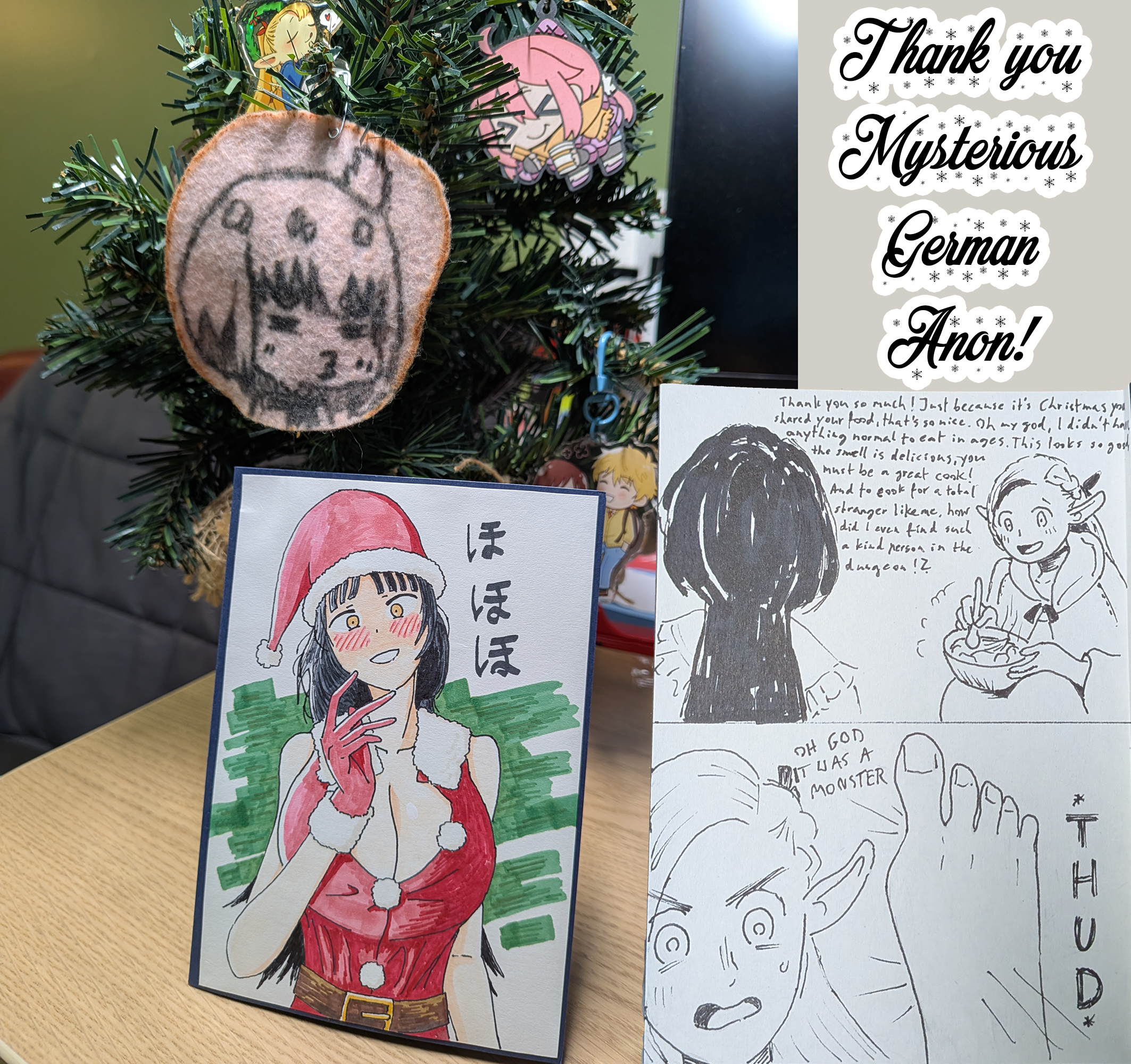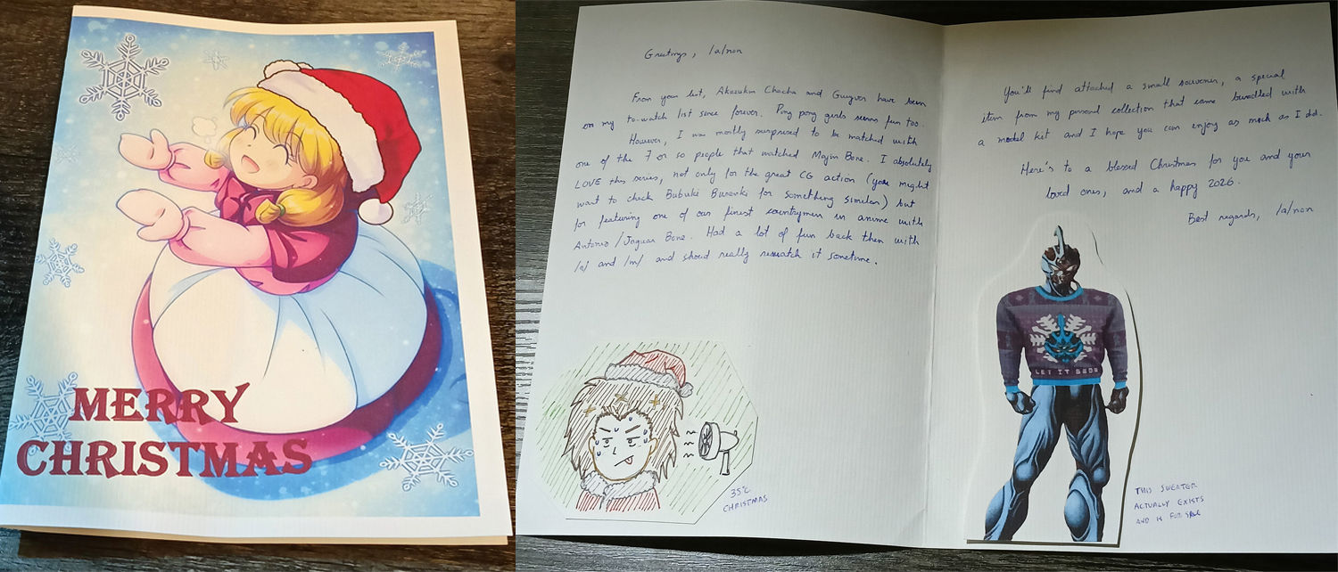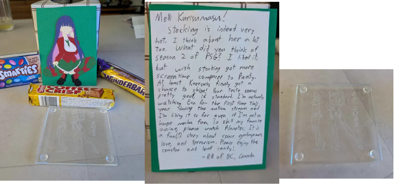 ZS from Greece, your card arrived about an hour ago. Thank you for the wonderful card, it might be the physically biggest card I've received, but I'd need to find my folder of cards to fact check that. Even Mahoro is powerless against the might of Konata and Piltia's ecchi prowess.The inside and back of the card gave me a chuckle (admittedly stumped by the punchline for the left hand 5 koma). We're all drawn together by a combination of fate and general dumbassery.Great to hear you've checked out Reviewers. Nameko at #1 is an interesting choice, the mushrooms aren't really ones I think about too often but it was a good episode. For me it's1. Piltia, naturally2. Tiaplate, her entire segment was incredible.3. Elza, her and Crim's dynamic is pure "god I wish that were me" fuel.Extra honorary 1st place to Fem Zel, happy the manga had a sequel for the Genderswap Inn.Thank you also for the tabi. Unfortunately I don't have a miko outfit laying around (yet) so I can't get the most out of them, but they're very comfortable once you get past the slight weirdness of how it works compared to regular socks, I'm still wearing them as I type this. I wanted to do socks again myself this year but a bunch of stuff prevented me from doing it financially, which sucks because I found some good ones.The chocolate did melt so it's currently in the fridge, same with the smaller deal. I have to imagine it being hot as fuck yesterday did it.Thanks again for the card, I'm excited for you opening your gift.For archiving purposes, here's a link for the full picture since sizing it down fucked with the text:https://files.catbox.moe/0ftzes.pngAnd also a second link for the uncovered comic panels on the back.https://files.catbox.moe/kqx3t9.jpg