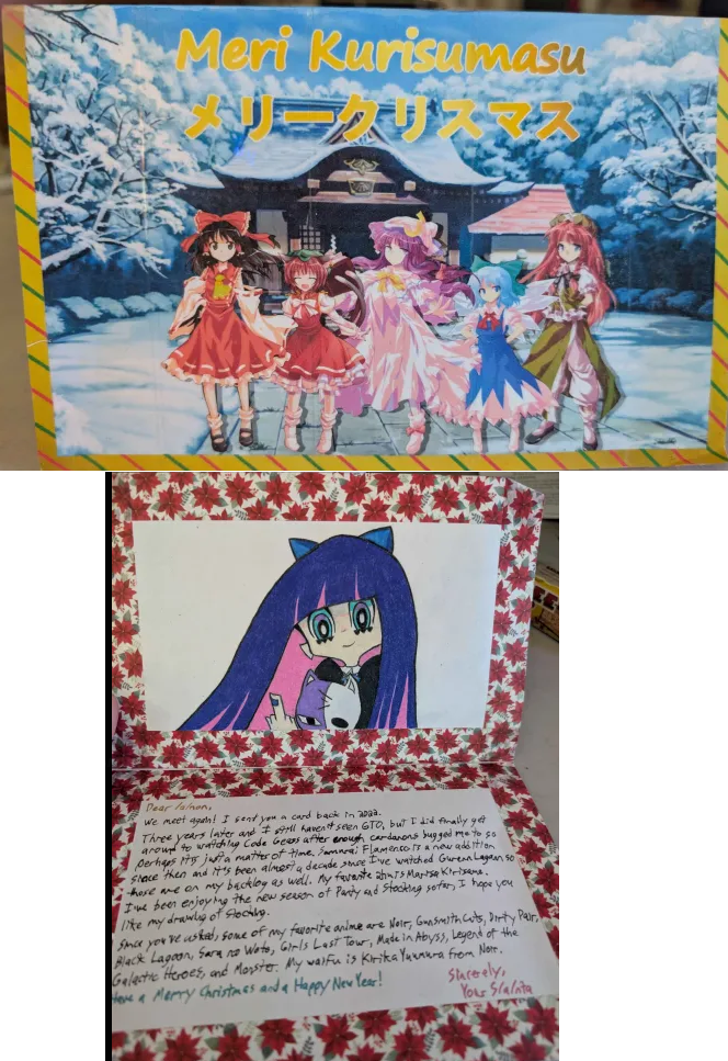 Three cards to post!First [no name] from NJ, thank you for the gorgeous Shinku. I agree with Girls Last Tour being special. I've watched it four times complete now. It's definitely got a mood to it.You did great on the papercut work, it looks fantastic. I'm probably going to hang this up somewhere.Ononoki is good, but for me, my favorite monogatari would have to be Kiss-Shot Acerola-Orion Heart-Under-Blade (forma non-loli). Her movie is fantastic.Thank you again for the delightful card, and Merry Christmas to you!