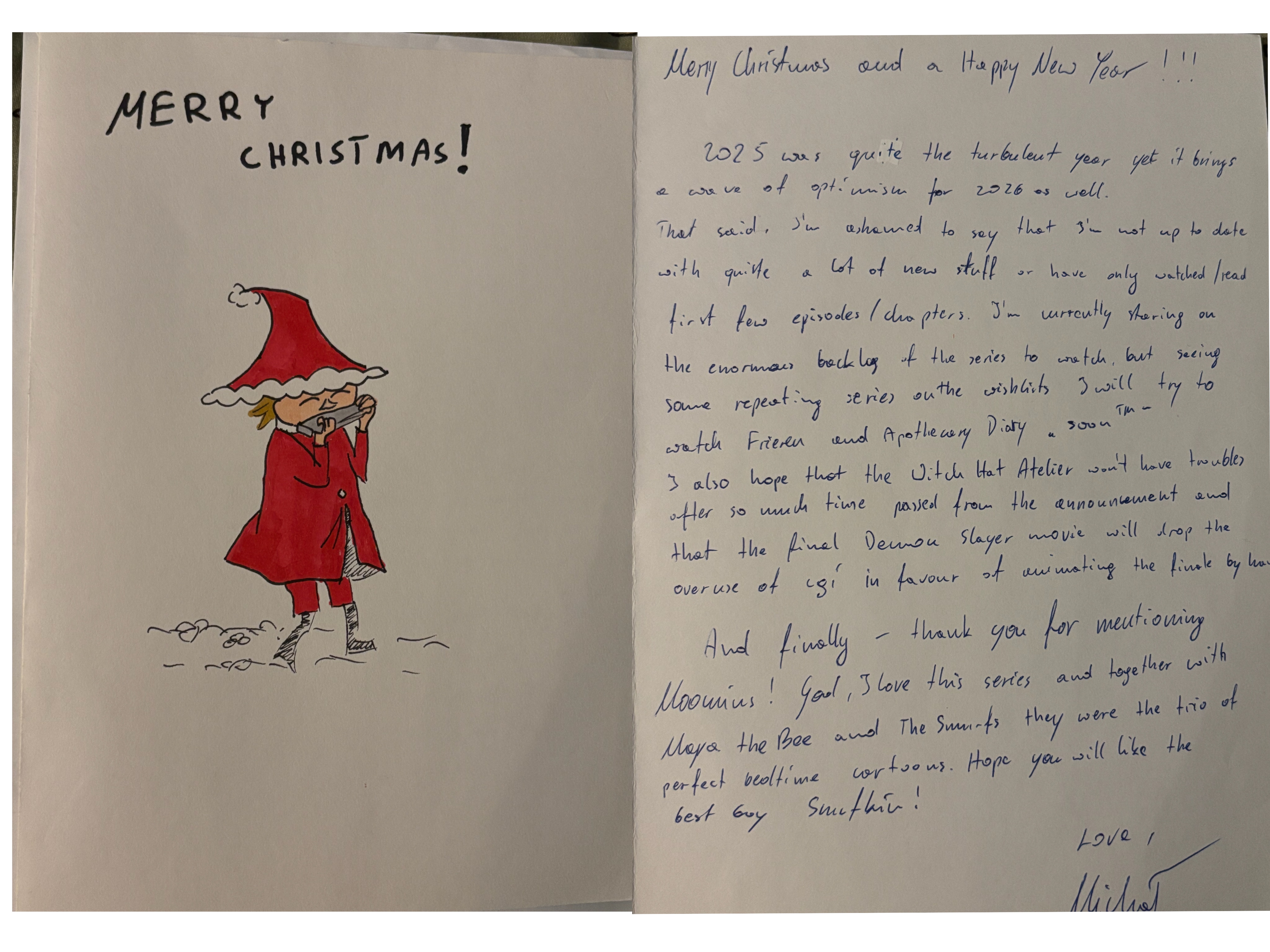 MK from Poland, thank you so much for your lovely card! The very festive snufkin is very appreciated, he looks incredibly charming. I watched Moomins in the early mornings as a kid but fell back into it heavily a few years ago and watched all the episodes of the original anime again alongside ALOT of strange adaptions from around the world, including the polish fuzzy felt version! They are so very charming, 70s media I love. As for your wishes, I’m hoping ufotable cool it on the cgi as well…..not very hopeful but oh well. I wish you luck catching up however!! Thank you again for the lovely card!