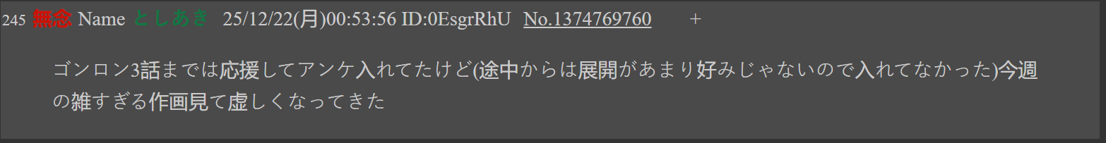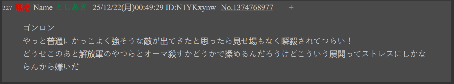 GonronJust when a normally cool, genuinely intimidating enemy finally shows up, he gets instantly wiped out without even a proper moment in the spotlight—this hurts And now it’s obviously going to turn into the liberation army arguing over whether or not to kill Oma, right?I hate developments like this—they’re nothing but stressful.
