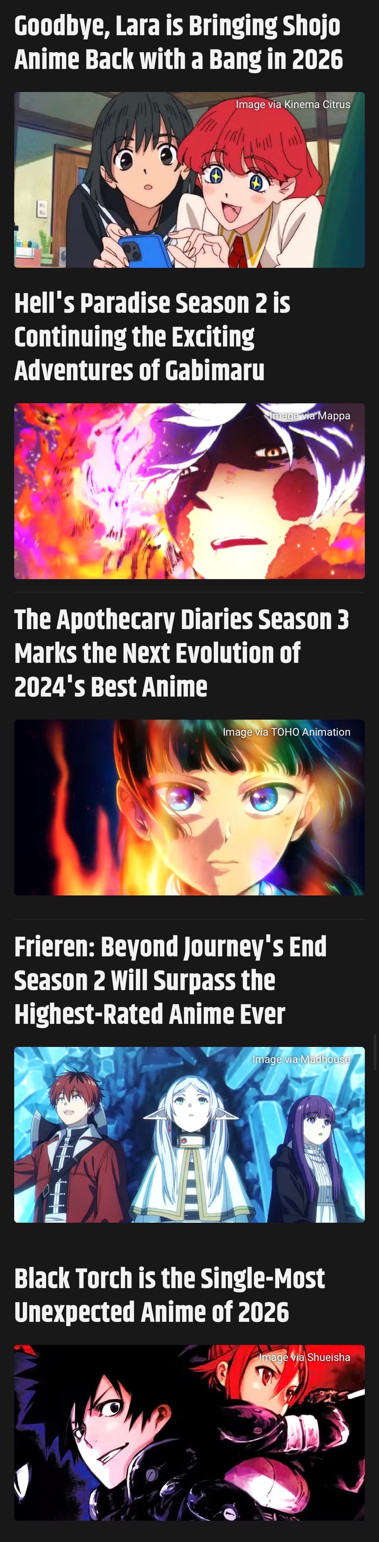 Frieren S2, Fate/Strange Fake, MF Ghost S3, Vigilantes S2, Mato Seihei no Slave S2, Fire Force S3, and Oshi no Ko S3 are all locked in for Winter 2026. I'll probably pick up a few pieces of seasonal slop along the way too. I've yet to see any original series that pique my interest, but there's enough new seasons of existing shows to keep me occupied.Out of what's already announced for later in the year, I'm looking forward to Classroom of the Elite, Dr. Stone, Re:Zero, Bleach, and Reincarnated as a Sword too.
